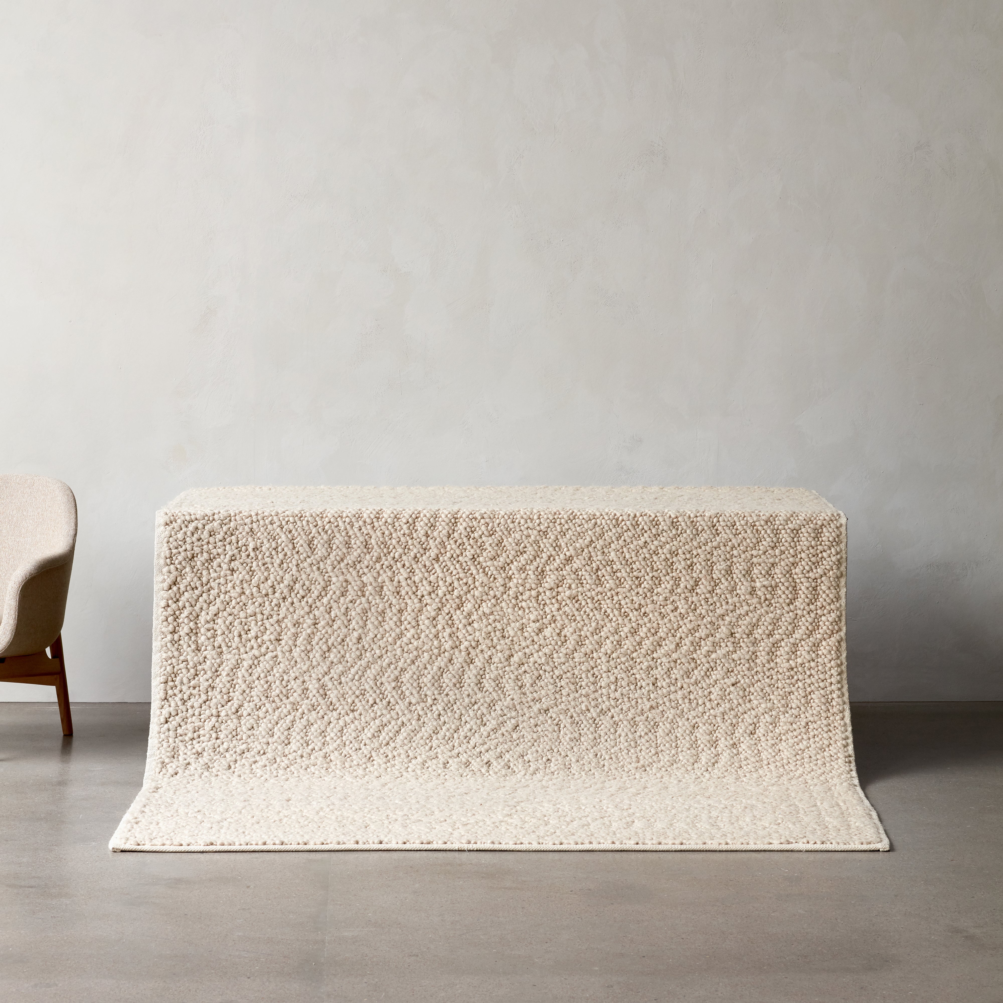 Looking to the seaside, designer Nina Bruun’s textured rug evokes the look of a broad pebbled beach, with alternating soft loops of tonal wool yarns in varying sizes that are knotted into tufts for an uncommon depth. From far away, the surface of Gravel Rug appears to ripple with an imaginary breeze, adding tactile intrigue in any setting.