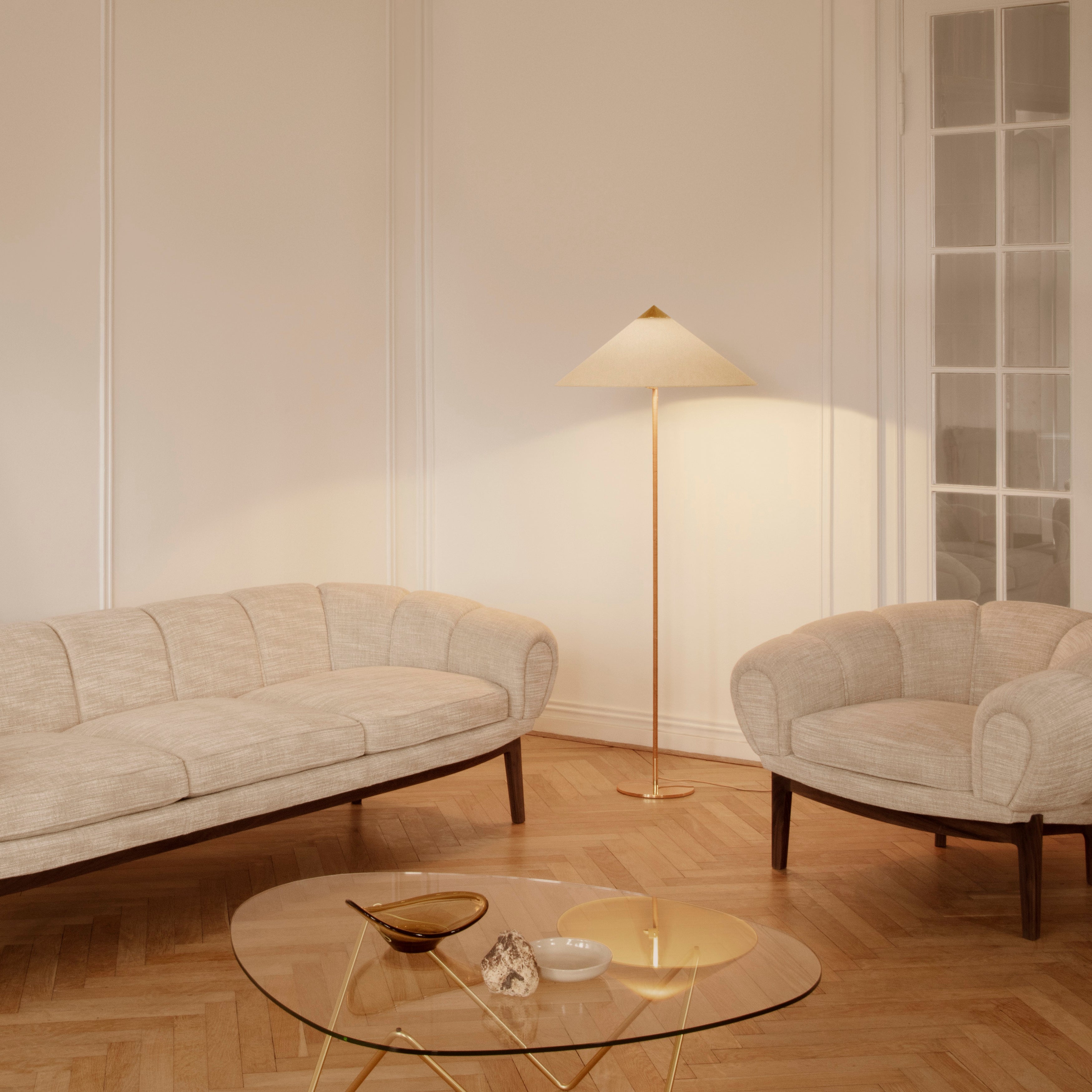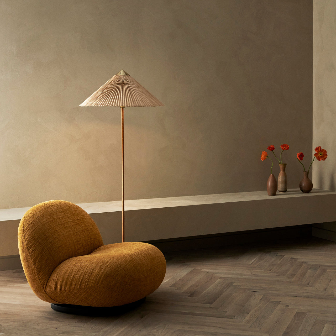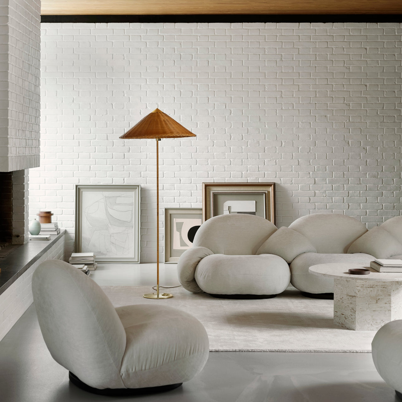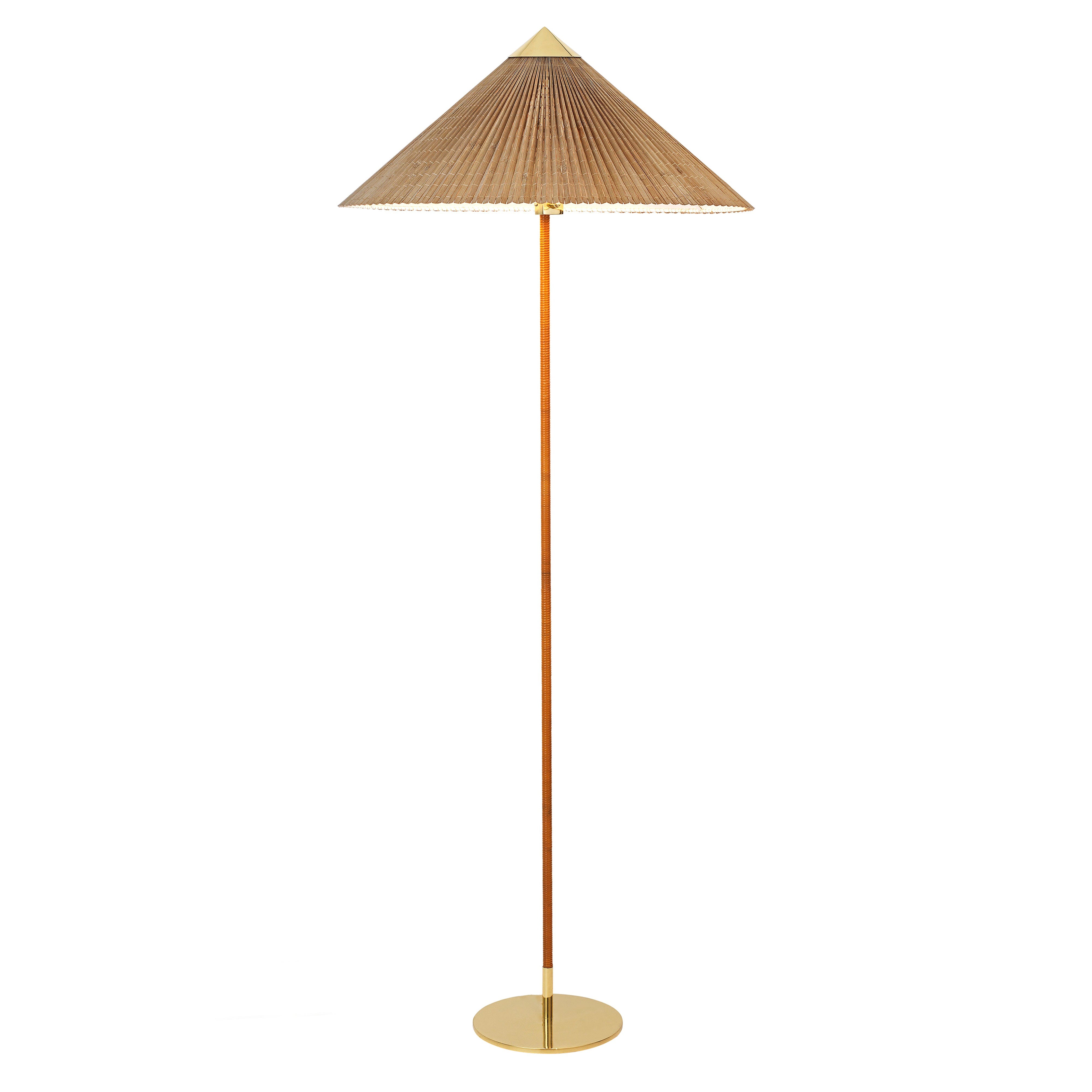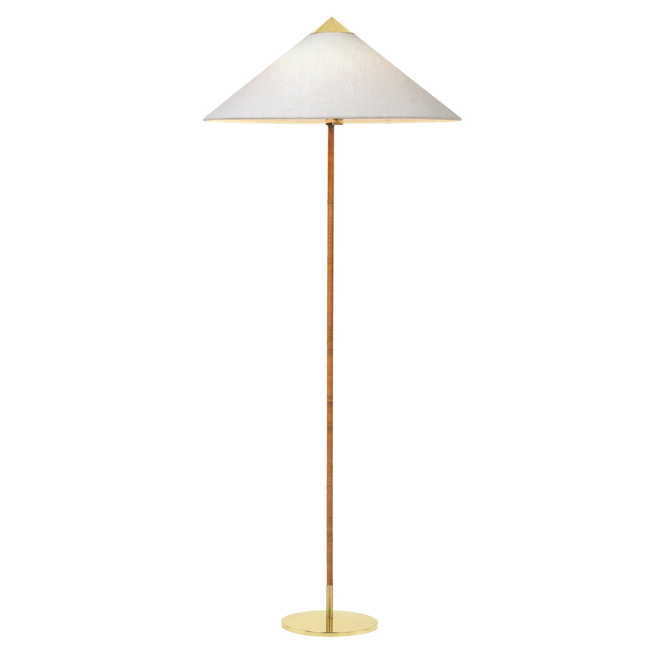 Characterized by its brass-peaked lampshade and rattan-covered stem, this floor lamp was designed by Paavo Tynell in 1935 for the resort hotel Aulanko in Hämeenlinna, Finland. Colloquially known as “Chinese Hat,” the shade is available in either white canvas or matching rattan. Now reissued by Gubi, the playful yet serene 9602 casts a gentle ambient light on any surroundings.