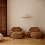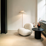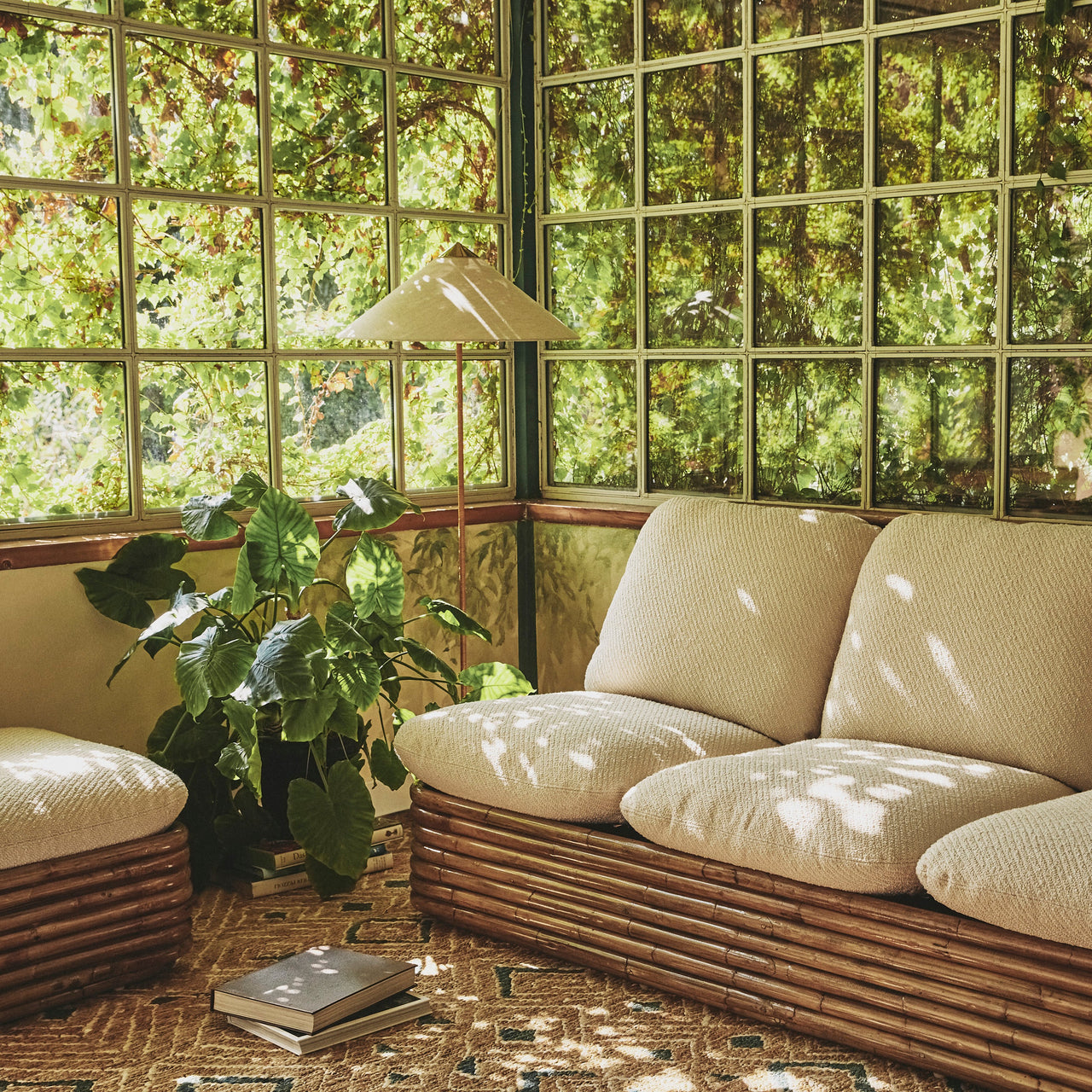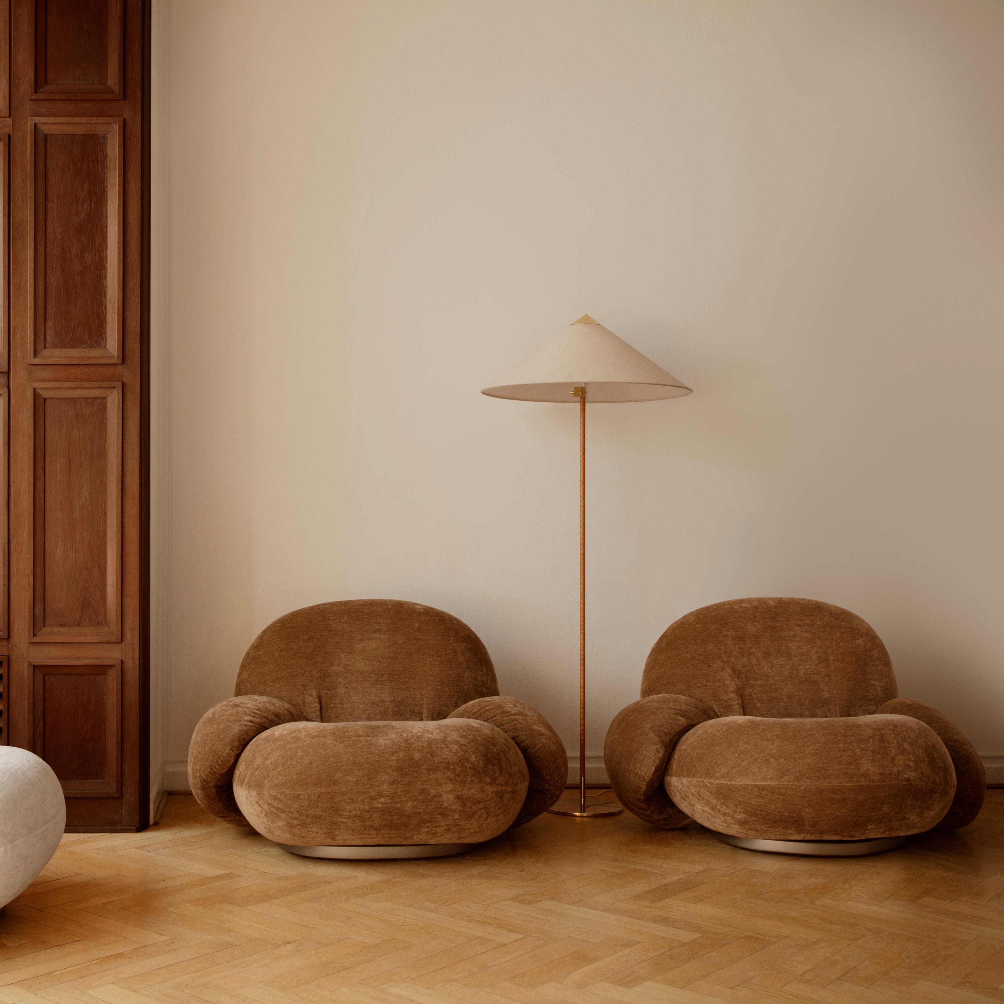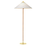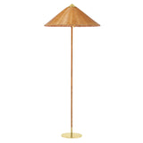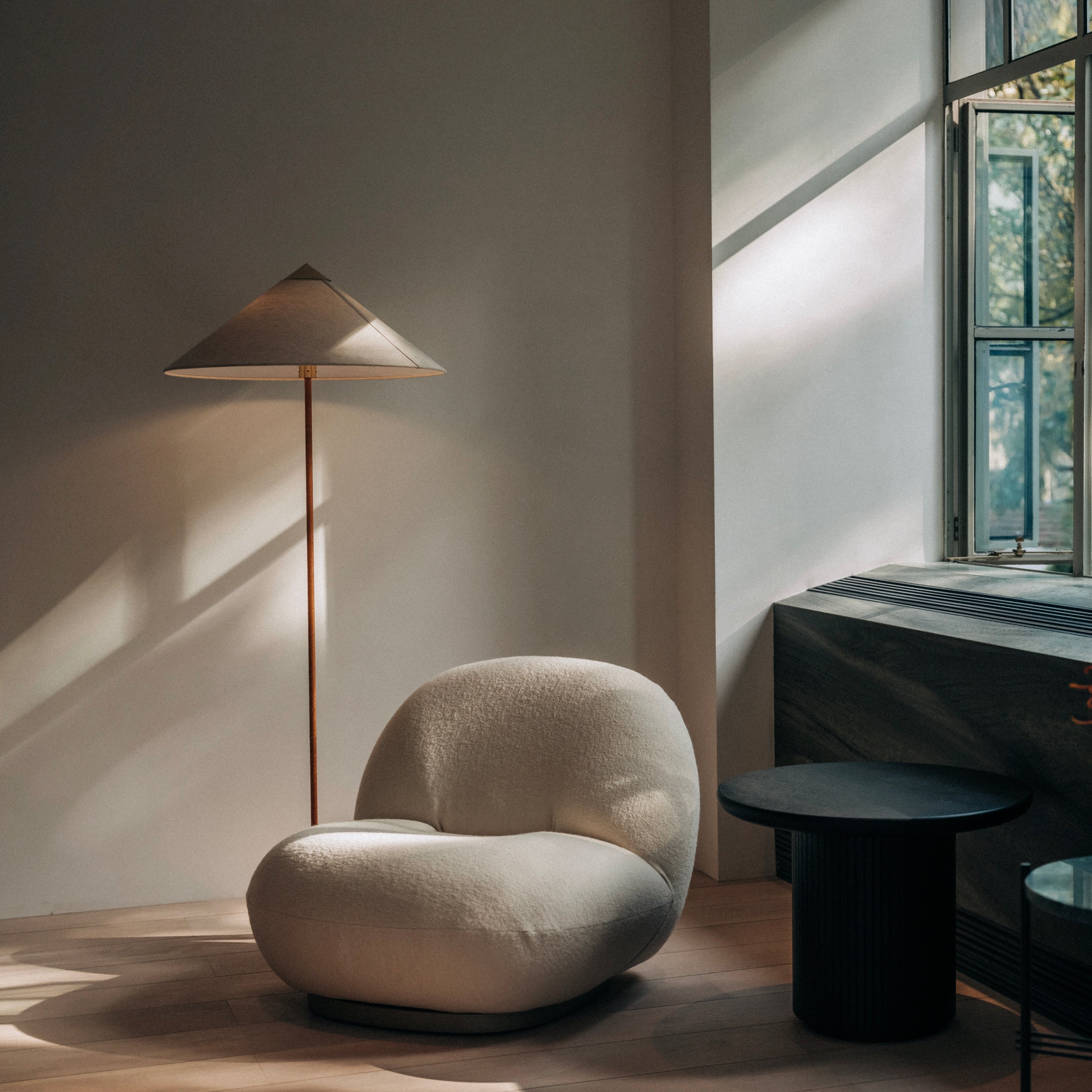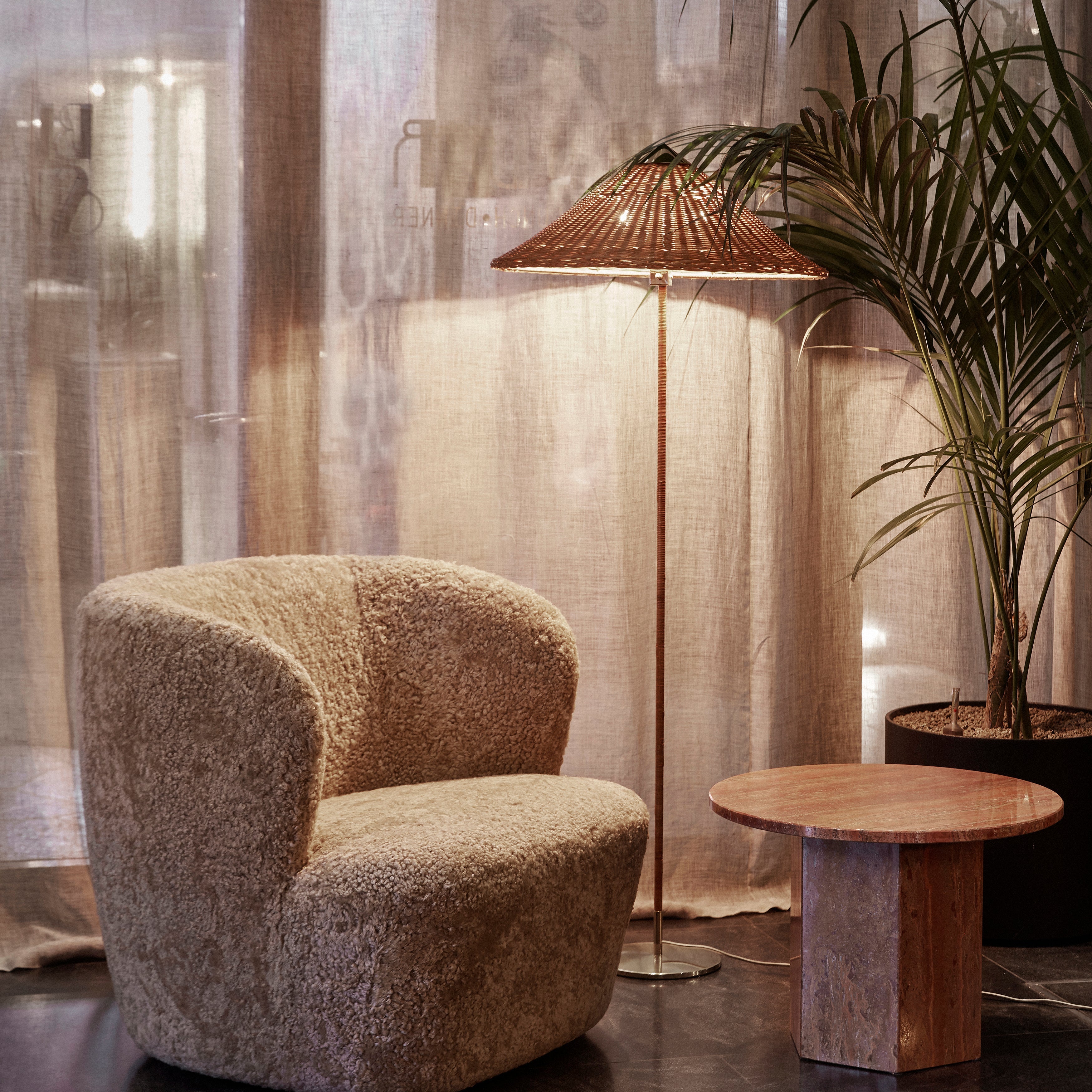 Characterized by its brass-peaked lampshade and rattan-covered stem, this floor lamp was designed by Paavo Tynell in 1935 for the resort hotel Aulanko in Hämeenlinna, Finland. Colloquially known as “Chinese Hat,” the shade is available in either white canvas or matching rattan. Now reissued by Gubi, the playful yet serene 9602 casts a gentle ambient light on any surroundings.