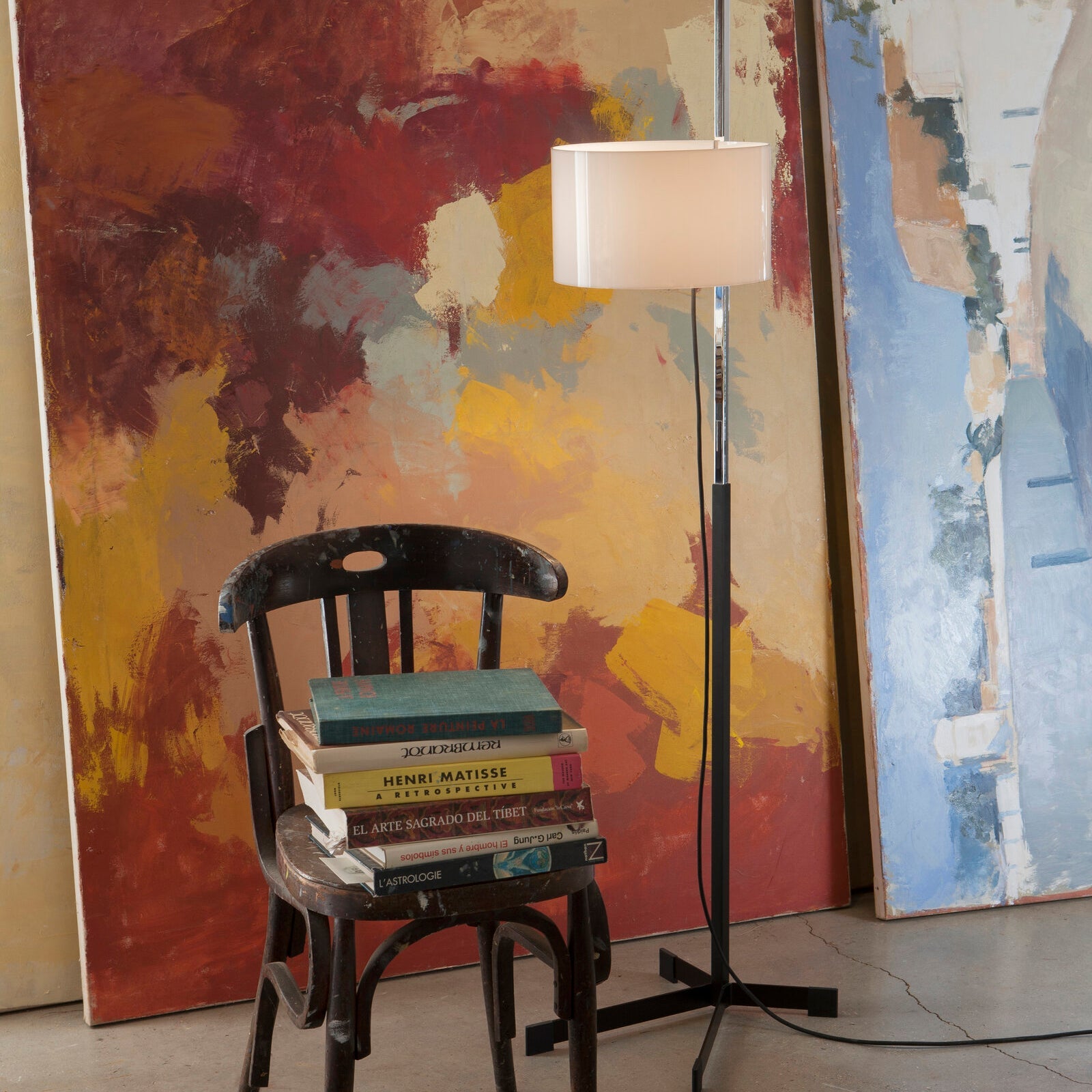 Honoring its 50th anniversary in 2011, Santa & Cole released the definitive updated version of Barcelona design legend Miguel Milá's iconic floor lamp. Highly acclaimed at its debut, TMC retains the original 1961 adjustable shade in white acrylic that can be  moved up and down the slim metal structure, with the upper half chrome-plated and lower half and footed base in black. Providing evenly diffused LED illumination, the light is switched on/off by pulling lightly on the cable.