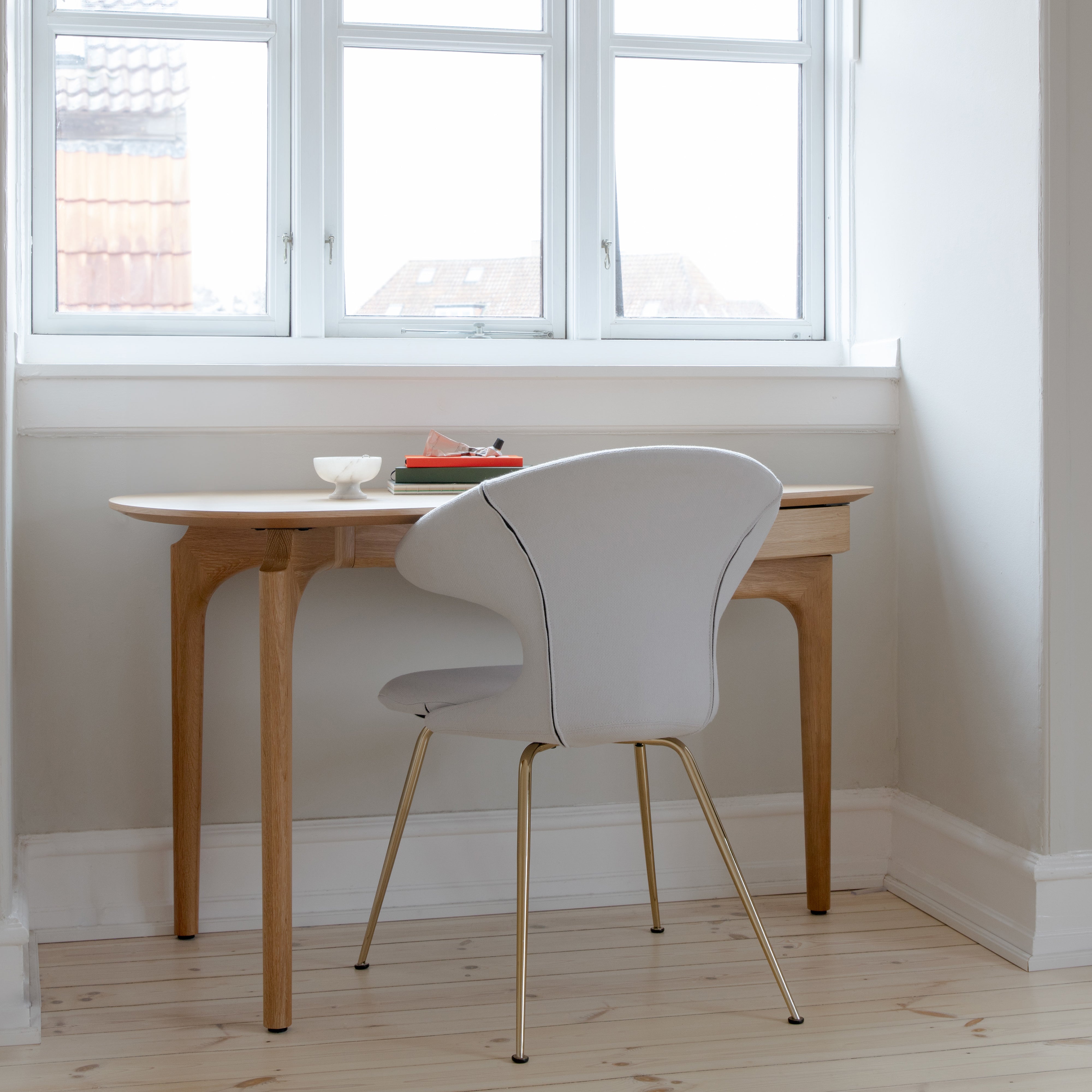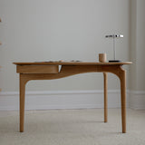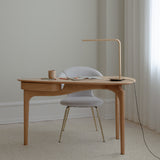 The Duende Desk offers a spacious workspace with a soft triangular tabletop and a discreet drawer beneath for convenient storage. Designed by Anders Klem, known for his focus on organic shapes, the desk's oak veneer construction adds a natural touch to any room. Its airy design allows it to fit gracefully into various settings, whether placed in a corner or as a centerpiece in an office.