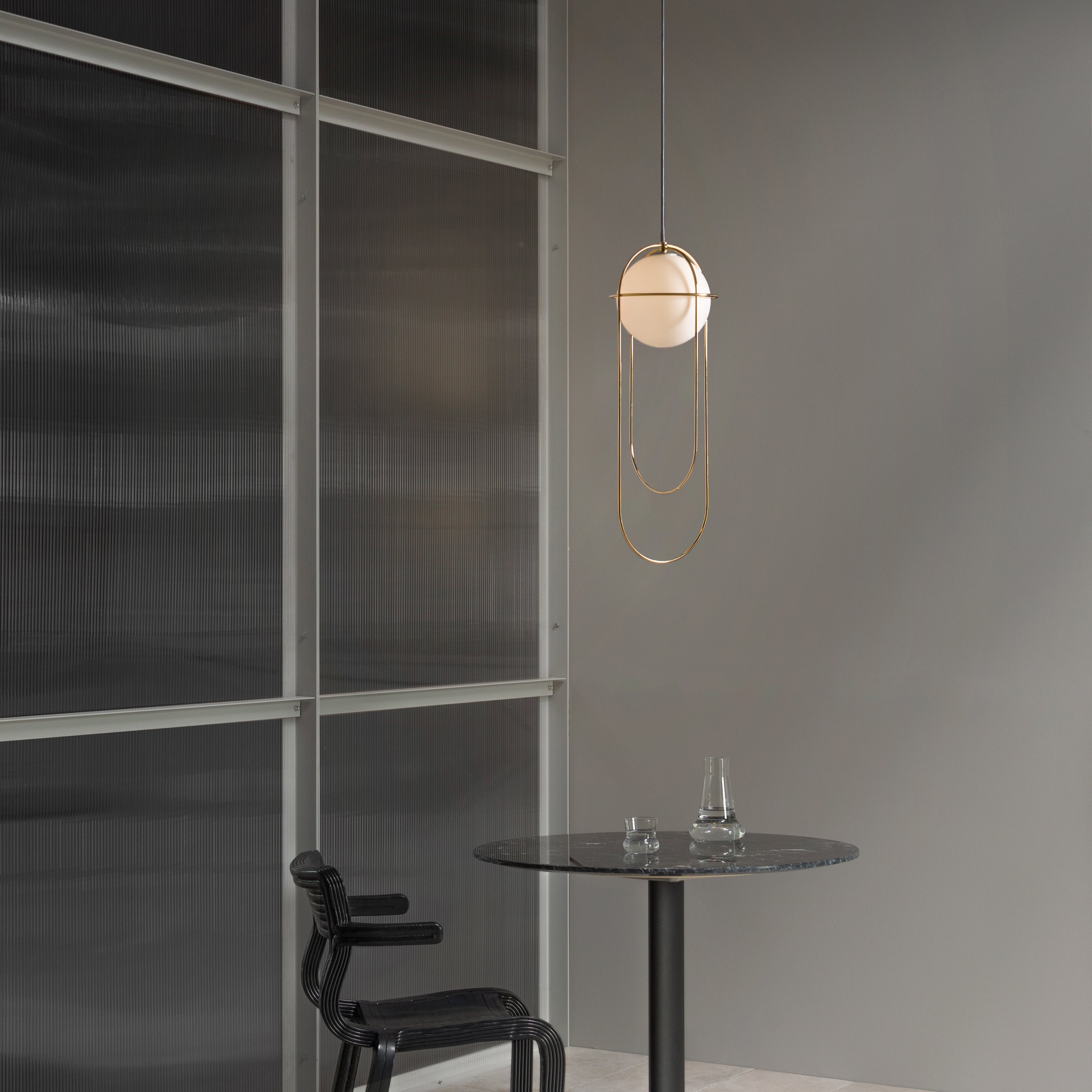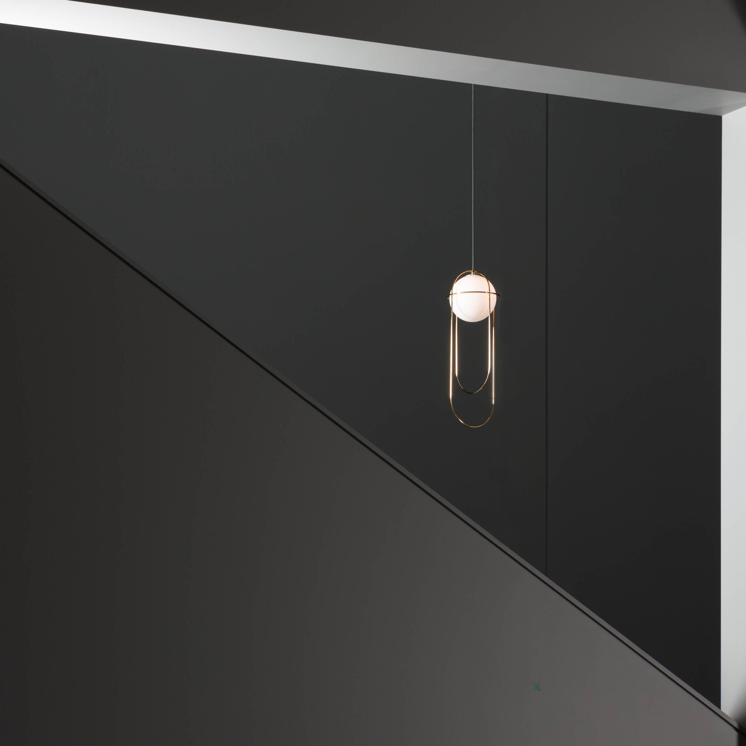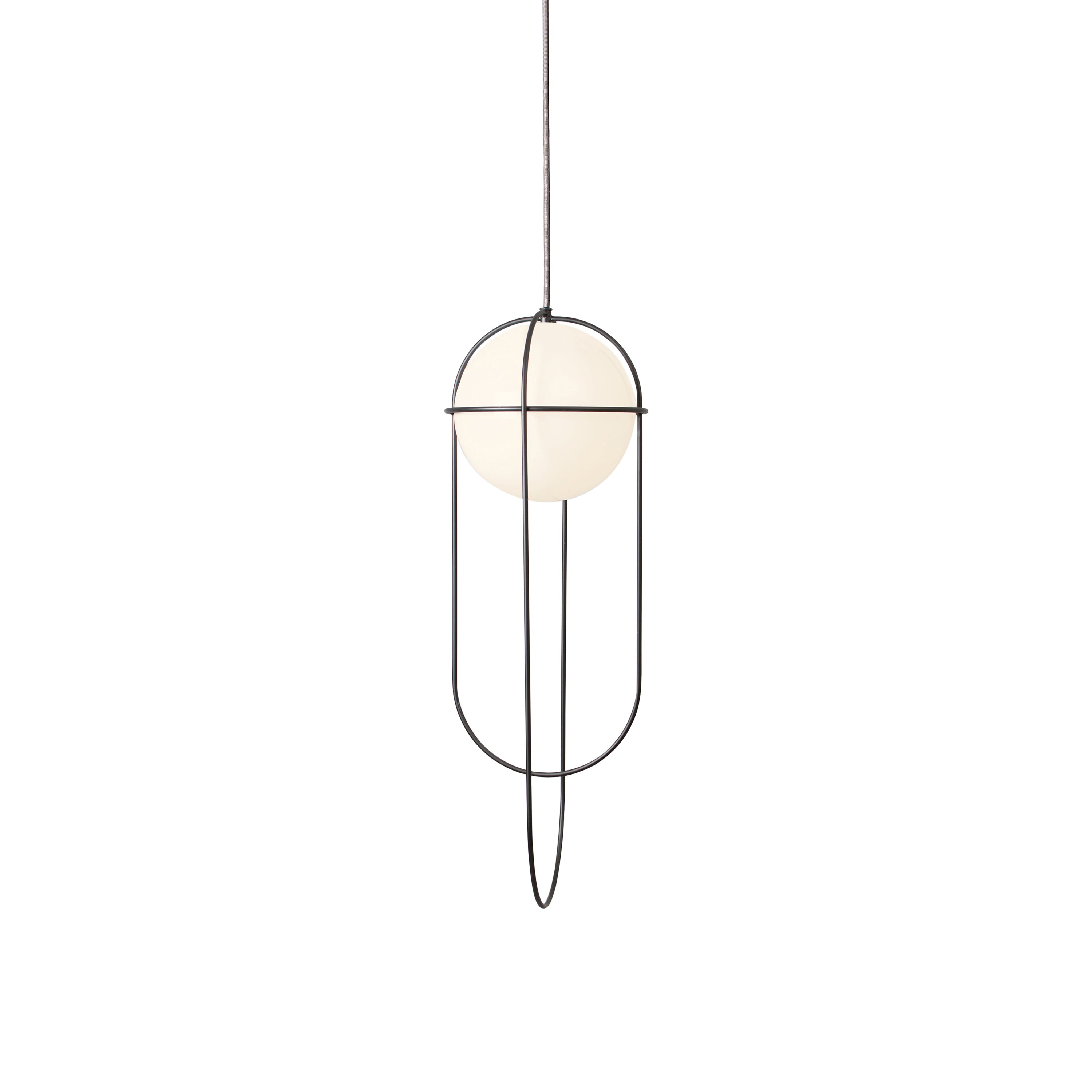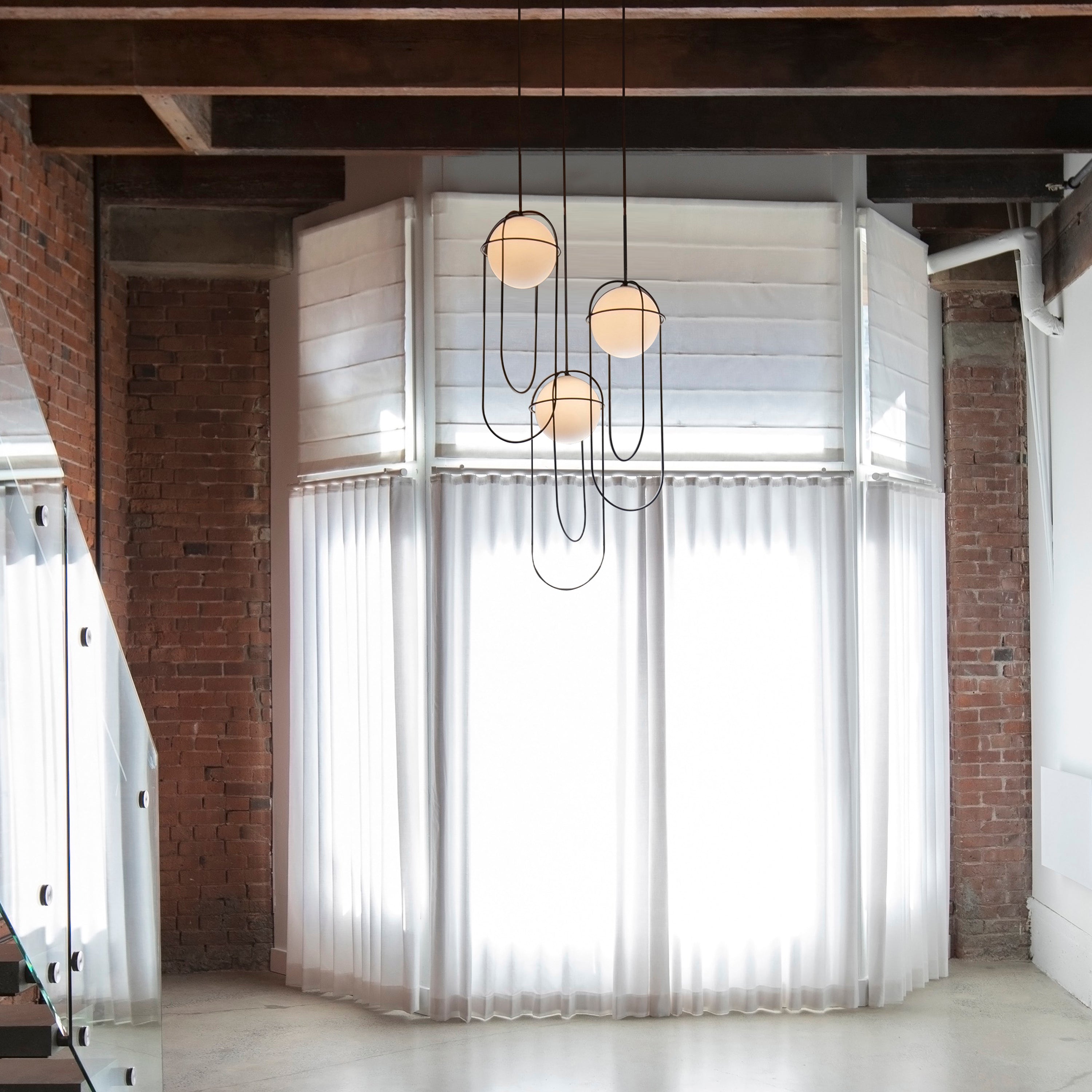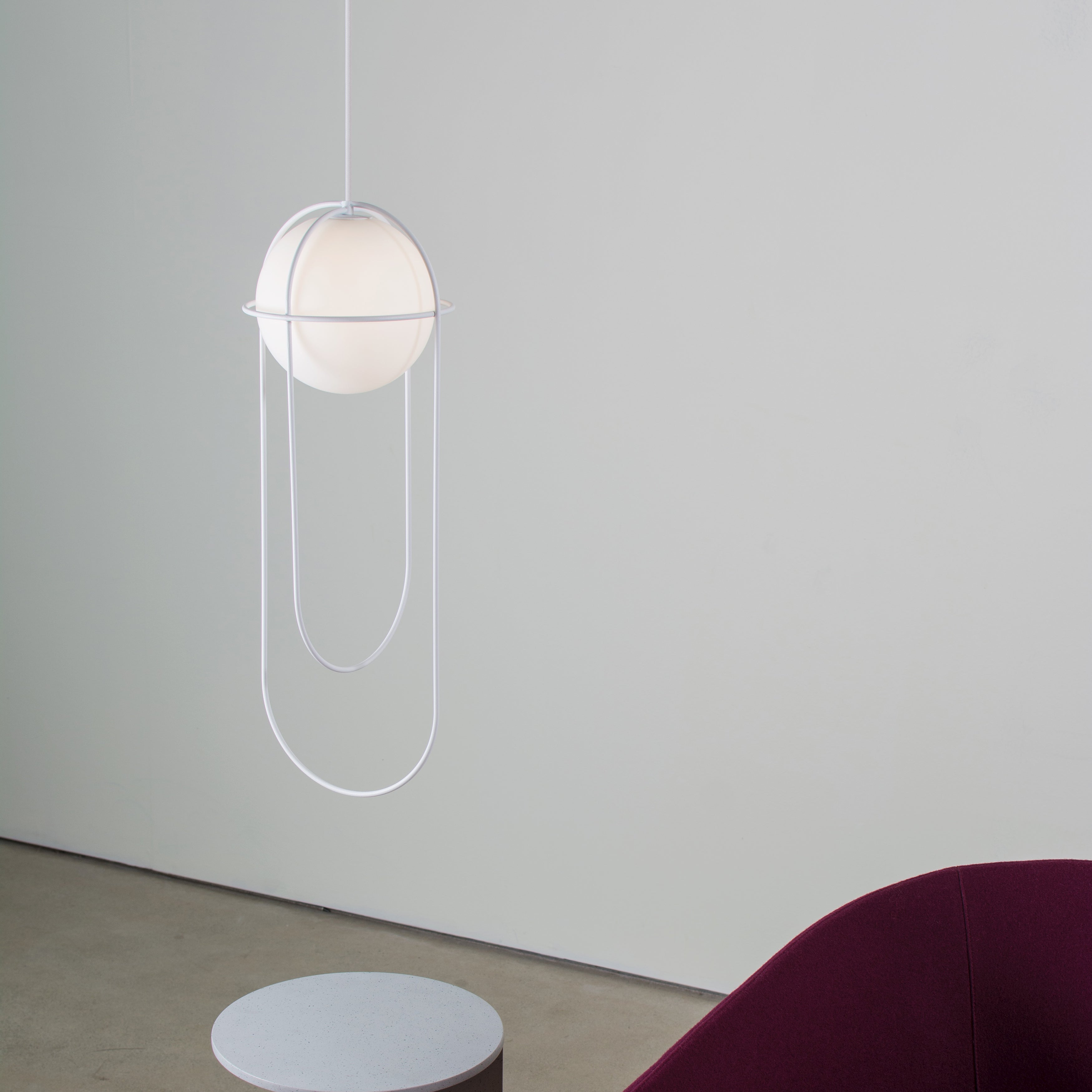 Designer Lukas Peet likens a glowing glass globe to nature’s original light source—the sun. “Orbit is a direct response,” he says, “with its metal cage functionally protecting the glass as well as referring back to the sun and our own orbit around it.” With the iconic orb rendered in opalescent glass, the pendant comes with either a black or white encircling framework.