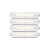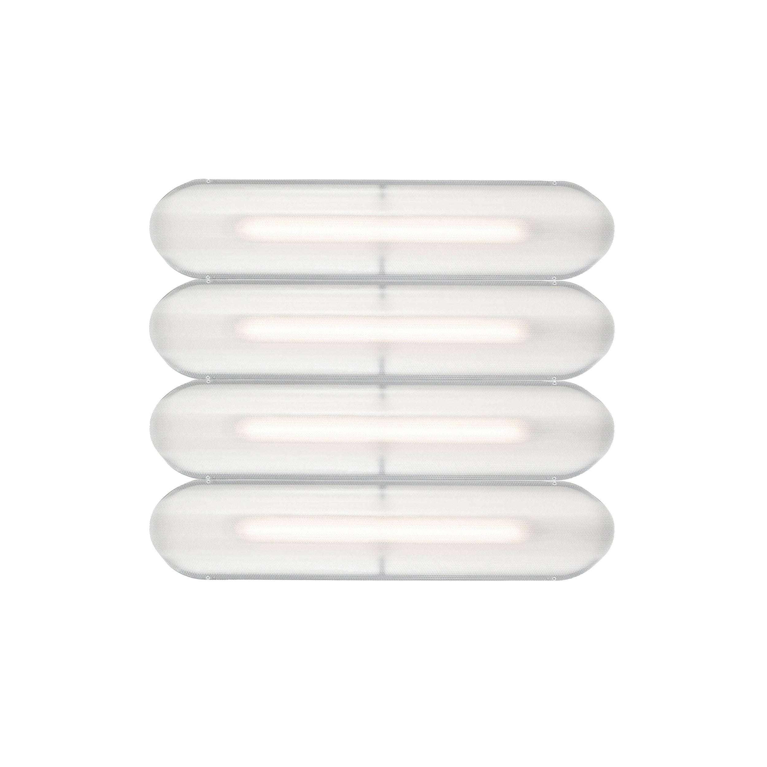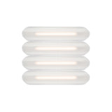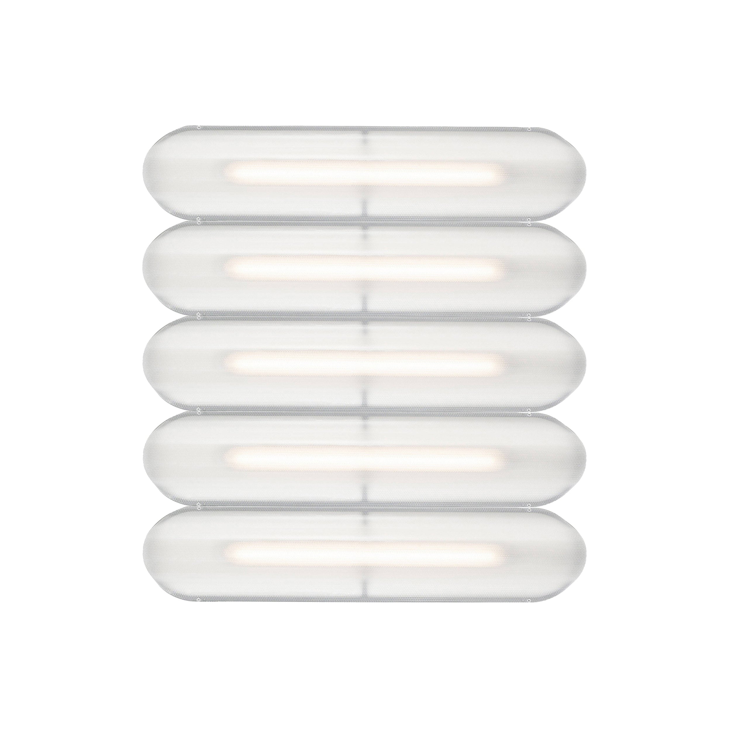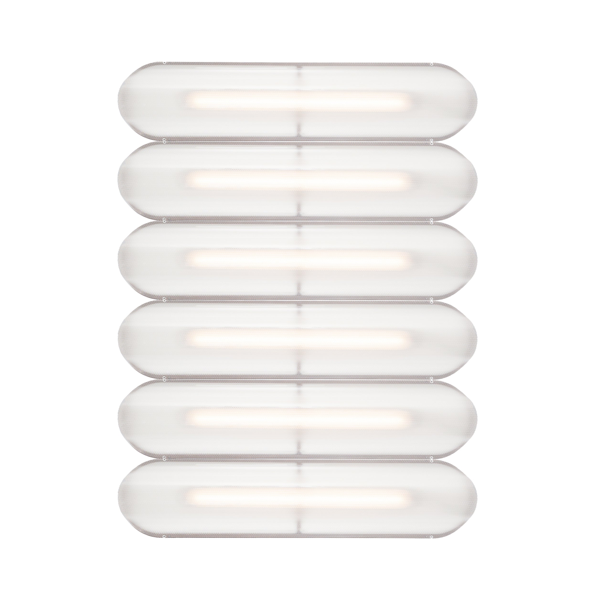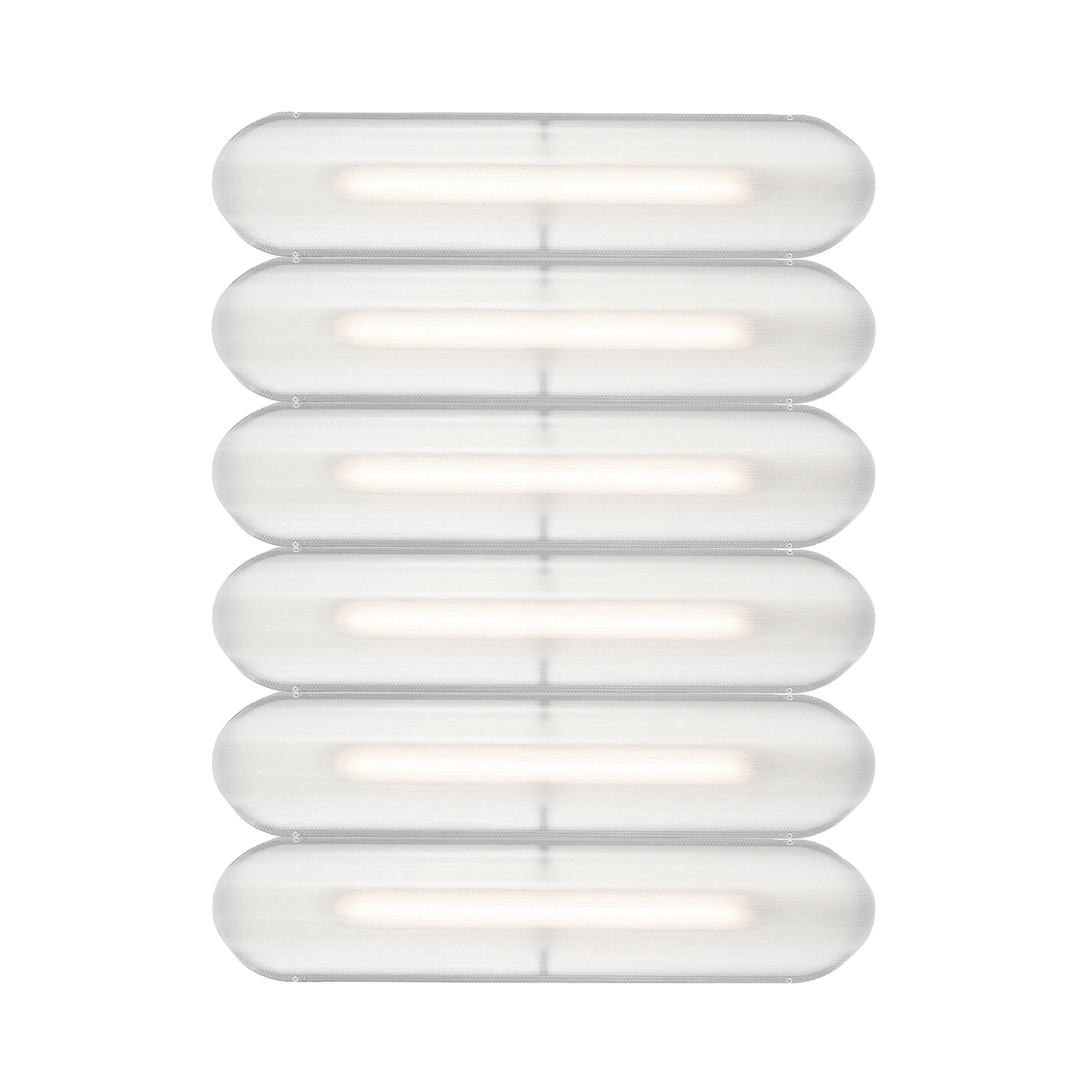 Designer Caine Heintzman's Vale System includes a horizontal version with multiples of the sculptural LED light in a stacked, side-by-side arrangement. Whether a single unit or layered up to 6 fixtures high, each flush-mounted light attaches to the wall or ceiling with a low-profile aluminum backplate in anthracite, silica, or rust finish. Fronted by a heat-molded acrylic lens with a textured surface, the prismatic effect glows with even ambient illumination.