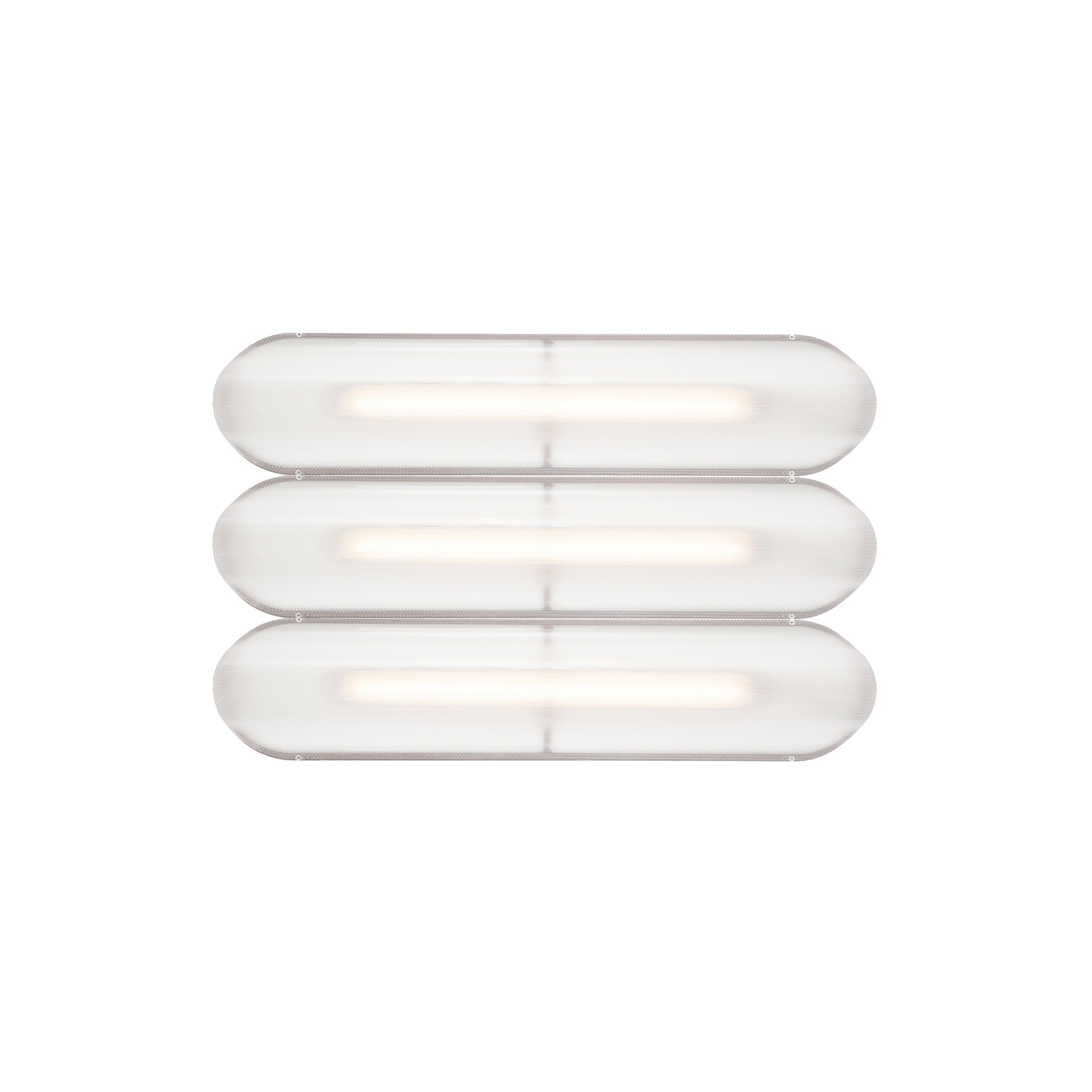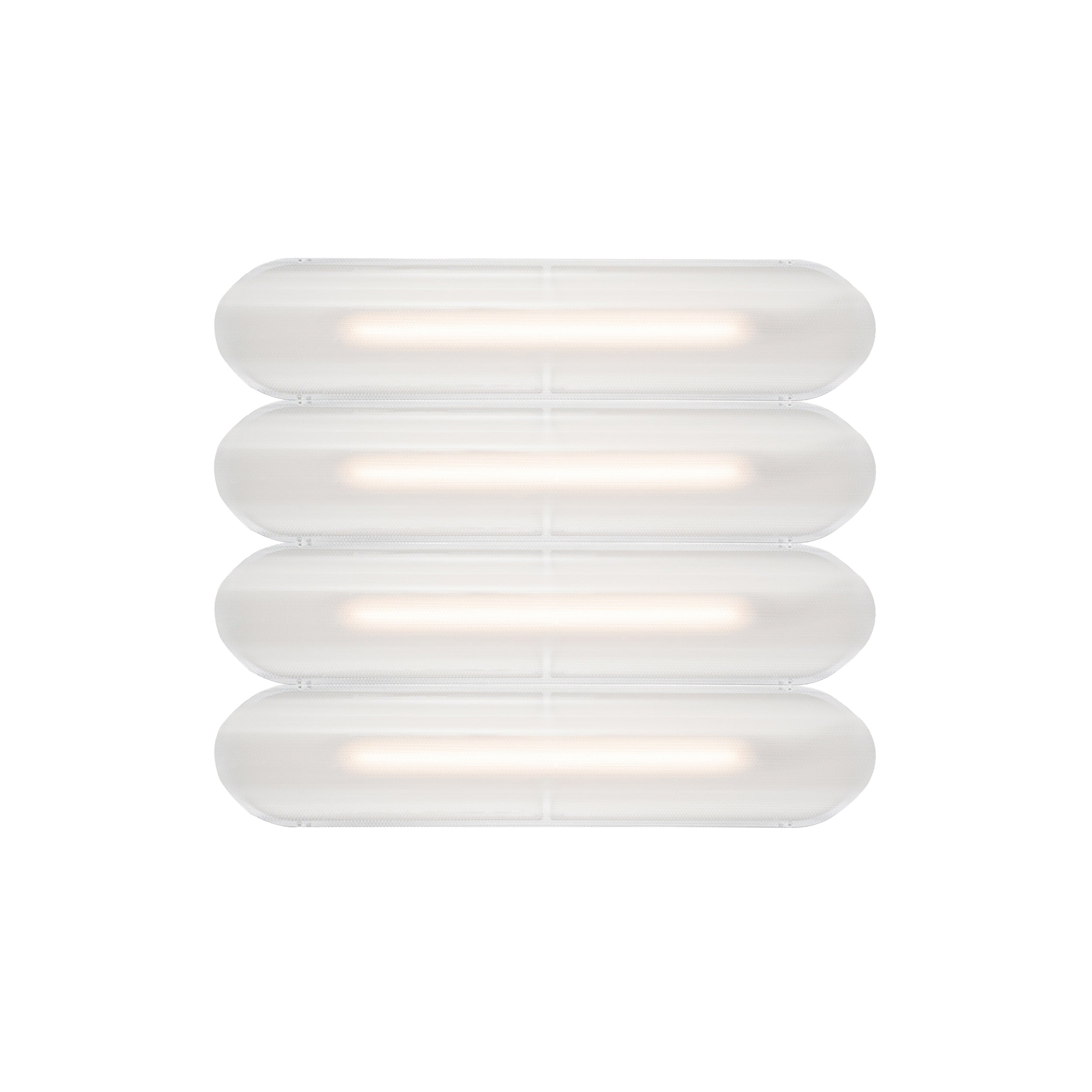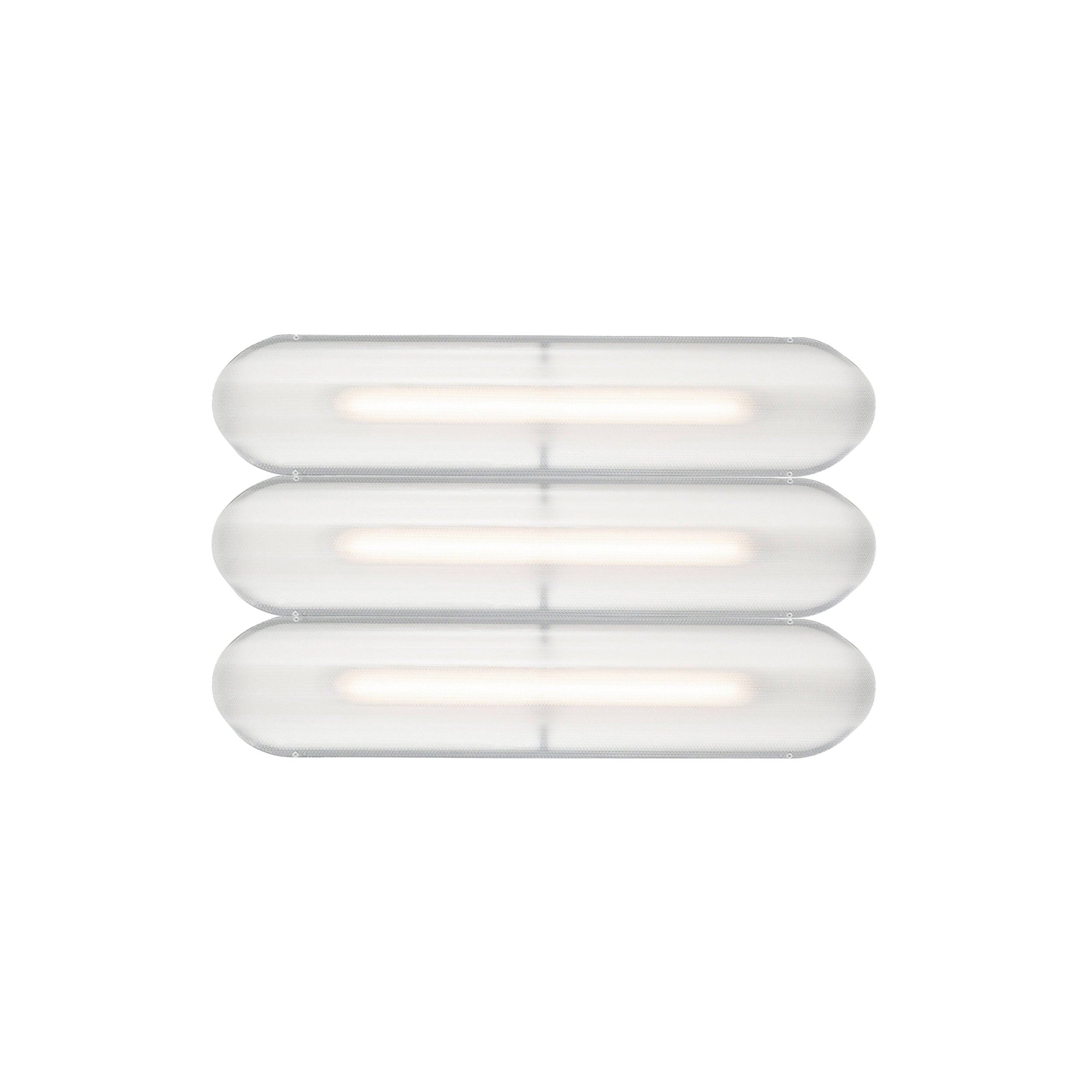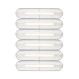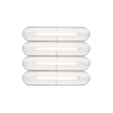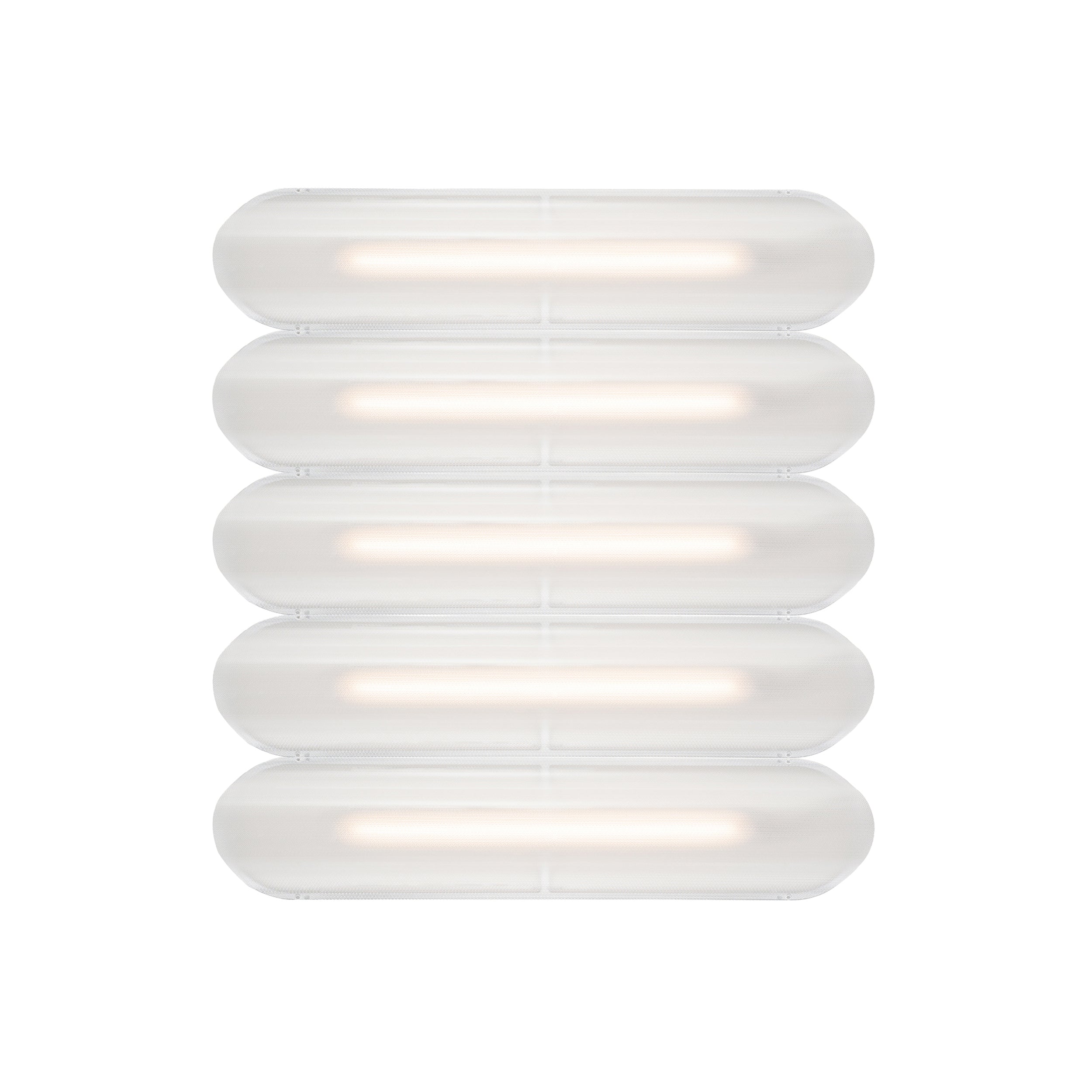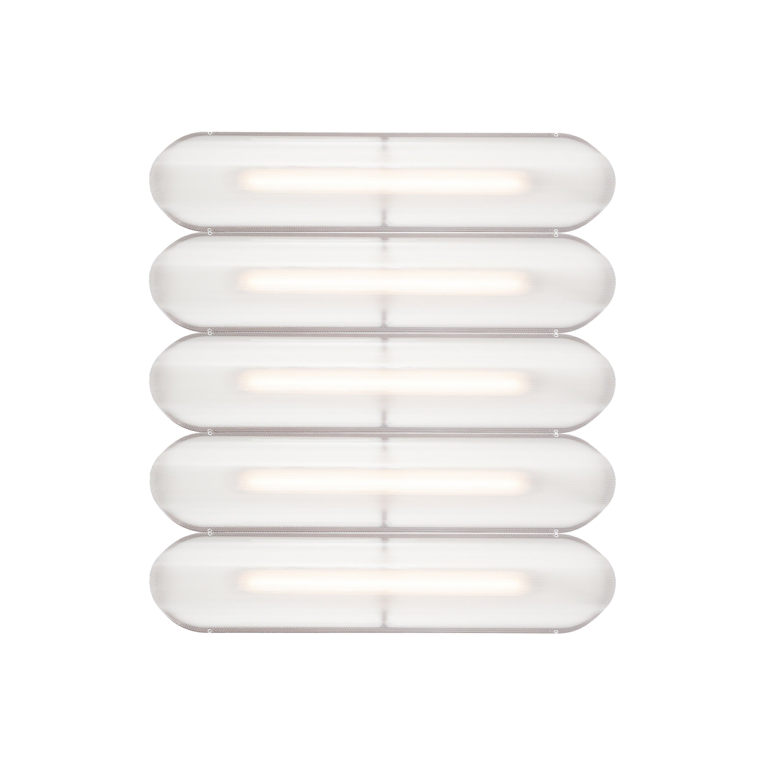 Designer Caine Heintzman's Vale System includes a horizontal version with multiples of the sculptural LED light in a stacked, side-by-side arrangement. Whether a single unit or layered up to 6 fixtures high, each flush-mounted light attaches to the wall or ceiling with a low-profile aluminum backplate in anthracite, silica, or rust finish. Fronted by a heat-molded acrylic lens with a textured surface, the prismatic effect glows with even ambient illumination.