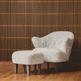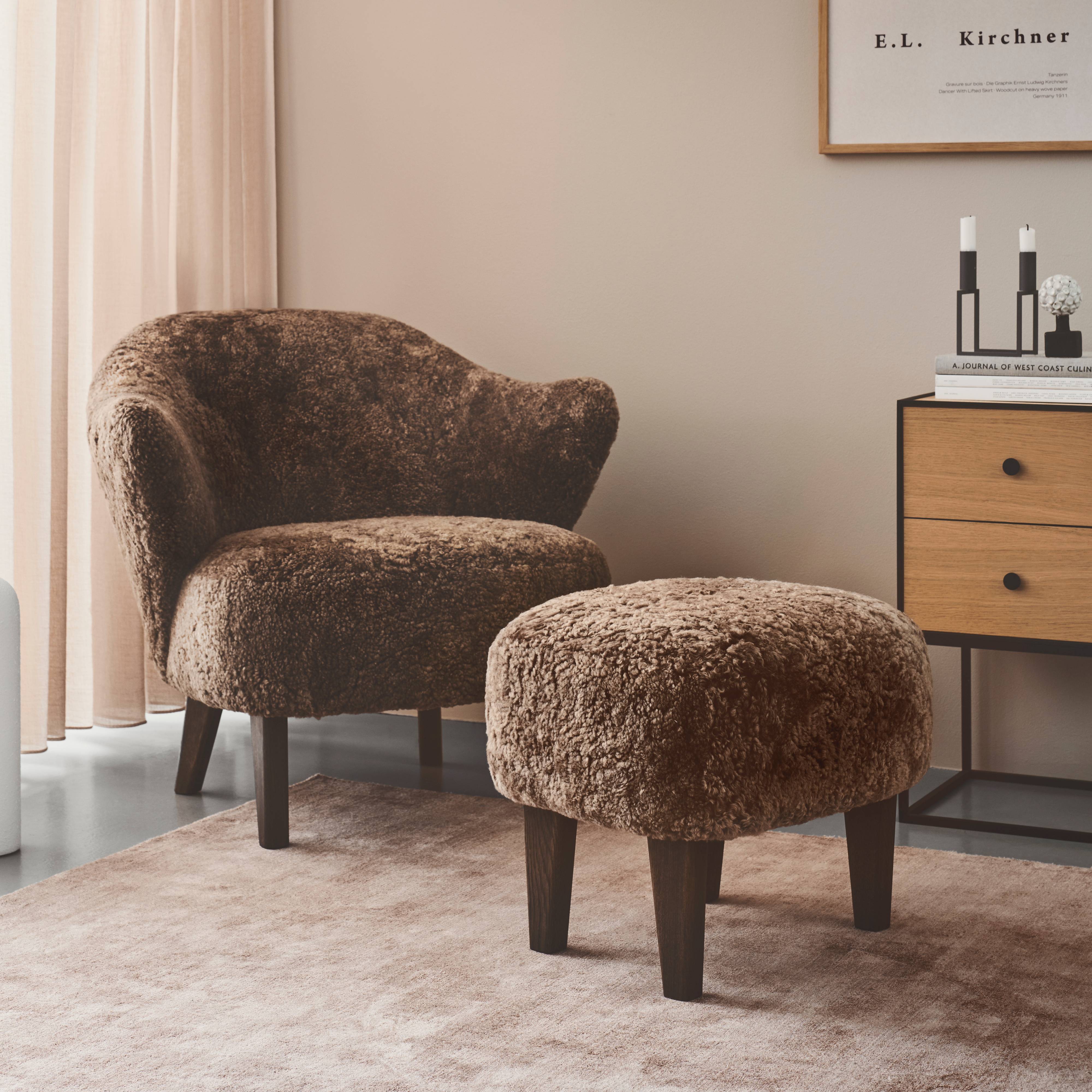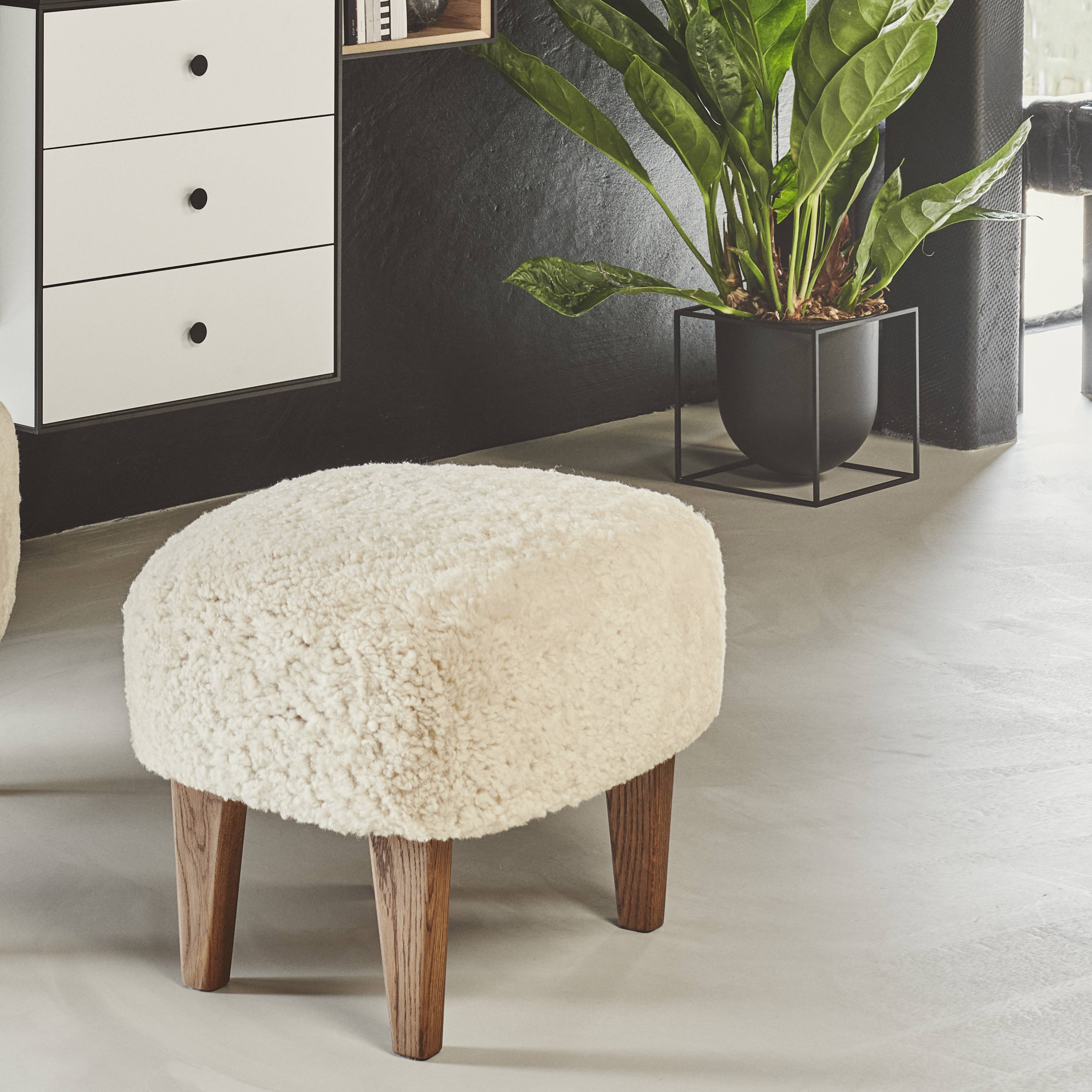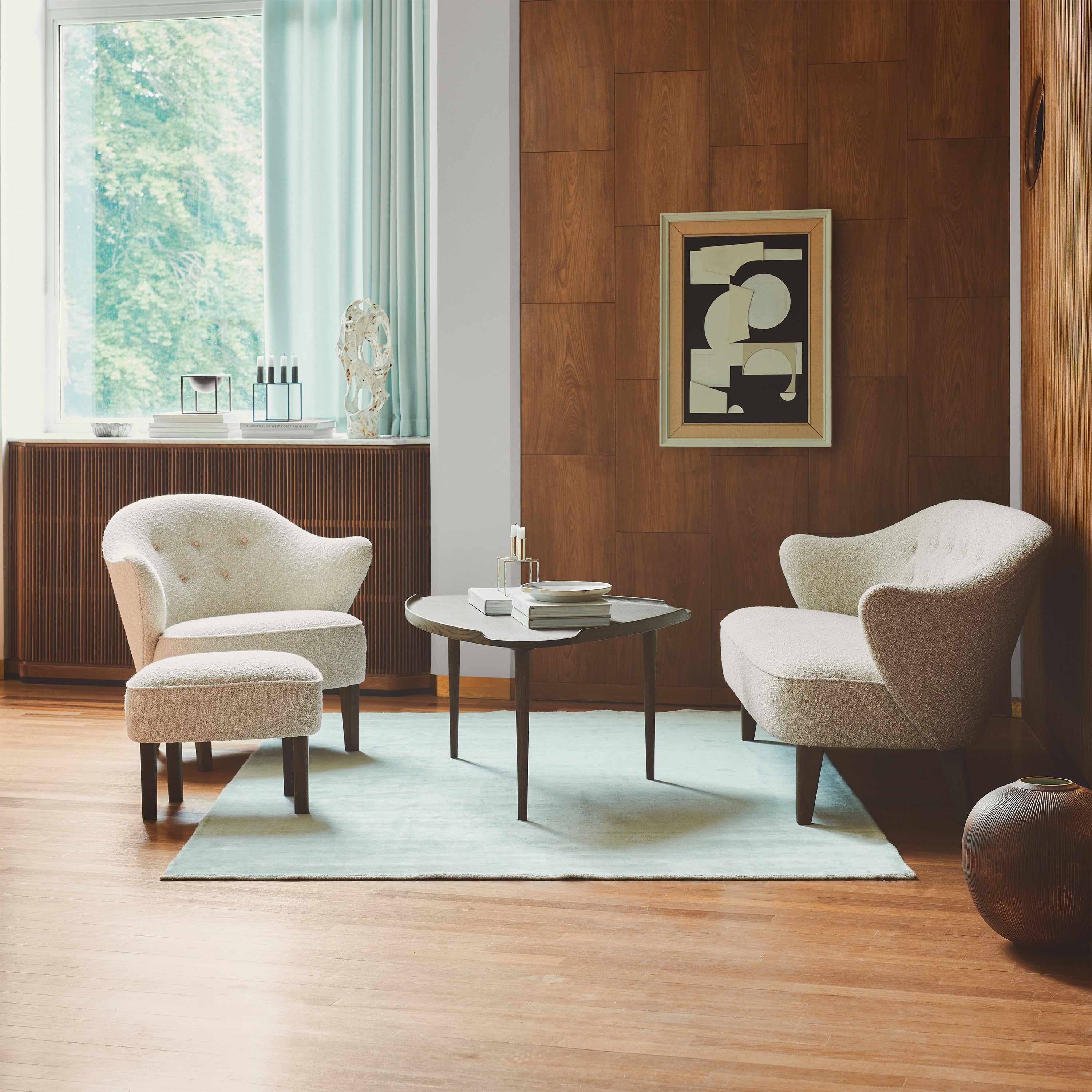 A compact footstool complements the Ingeborg easy chair named for the mother of Danish brother designers Flemming and Mogens Lassen. Originally designed in 1940, it offers put-your-feet-up repose without taking up too much space—or use it for ad-hoc seating. With oak legs, the footstool (and matching chair also at A+R) are available in a custom fabric, stocked bouclé or luxurious natural sheepskin.