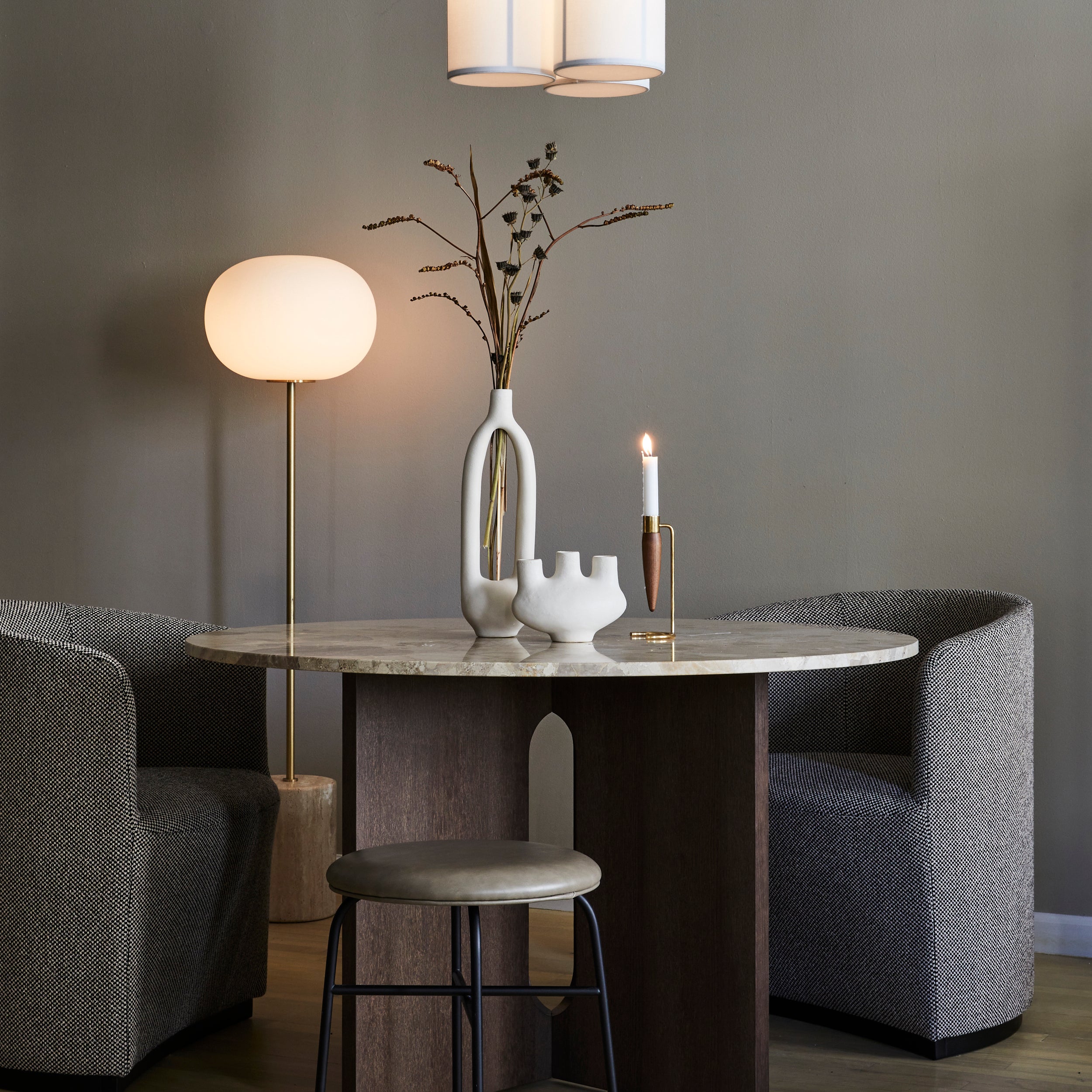 Designer Jonas Wagell elongates the proportions of his now-classic JWDA to arrive at a dramatic floor lamp. Originally inspired by traditional oil lamps and then transformed with elegant materials, it takes form with an elliptical opal glass shade, a slender metal stem, and a sculptural marble base with its thoughtfully placed dimmer switch.