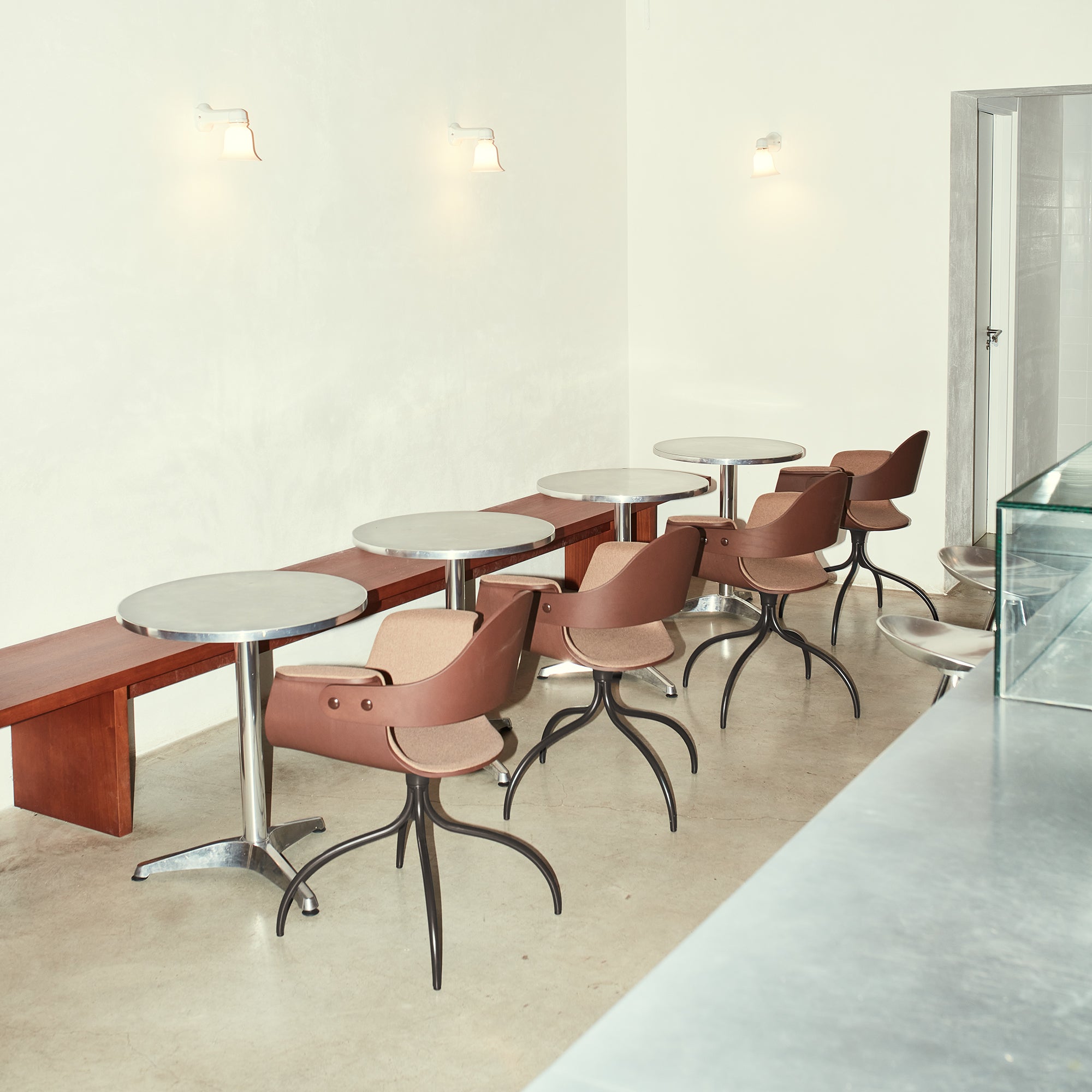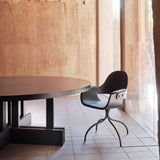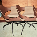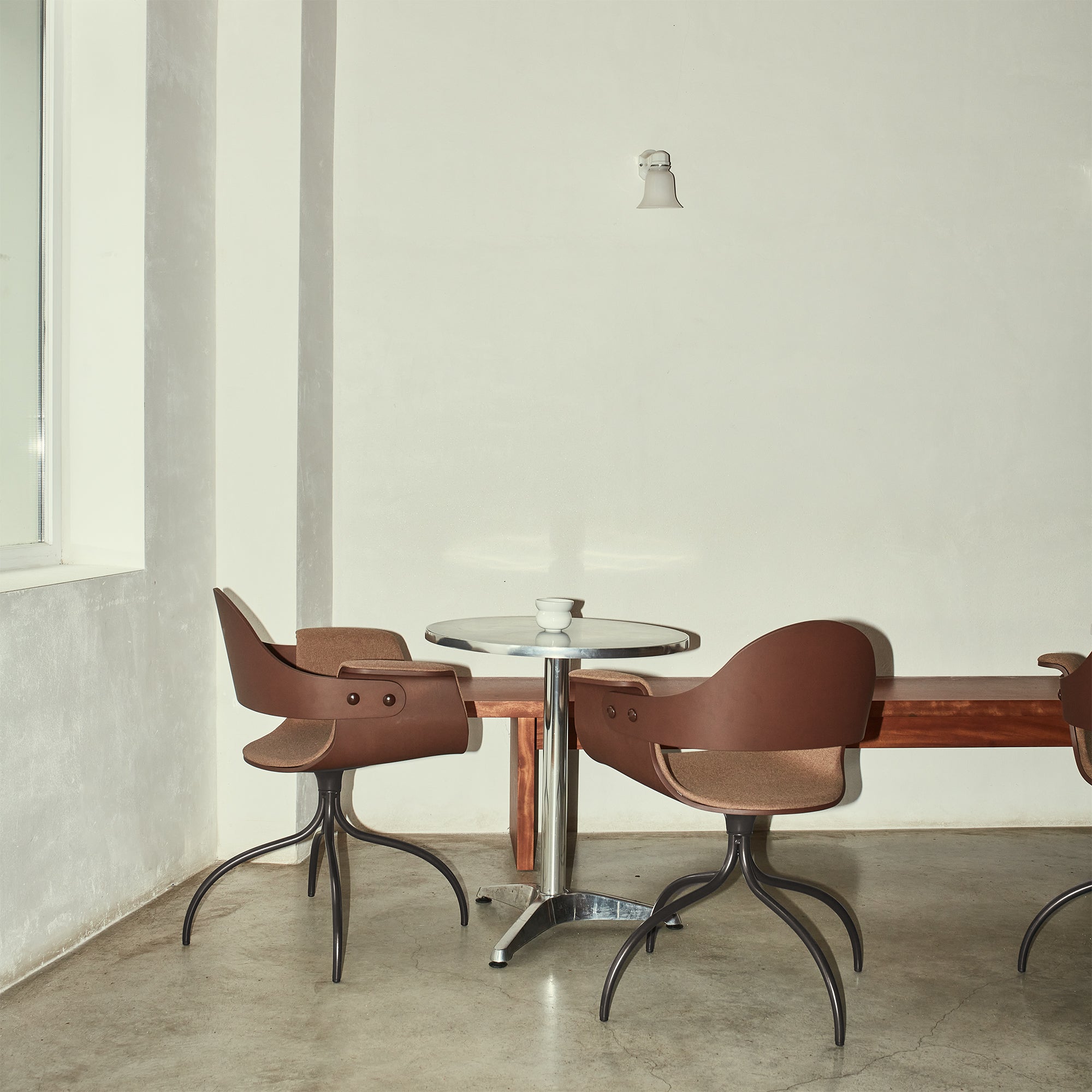 A custom-clad seat and convenient swivel function denote this model from Spanish designer Jaime Hayon’s Showtime Nude series. The molded-veneer seating’s natural woodgrain and higher, more ergonomic backrest pair with the powder-coated, steel swivel base and a choice of fabric or Leather upholstery.