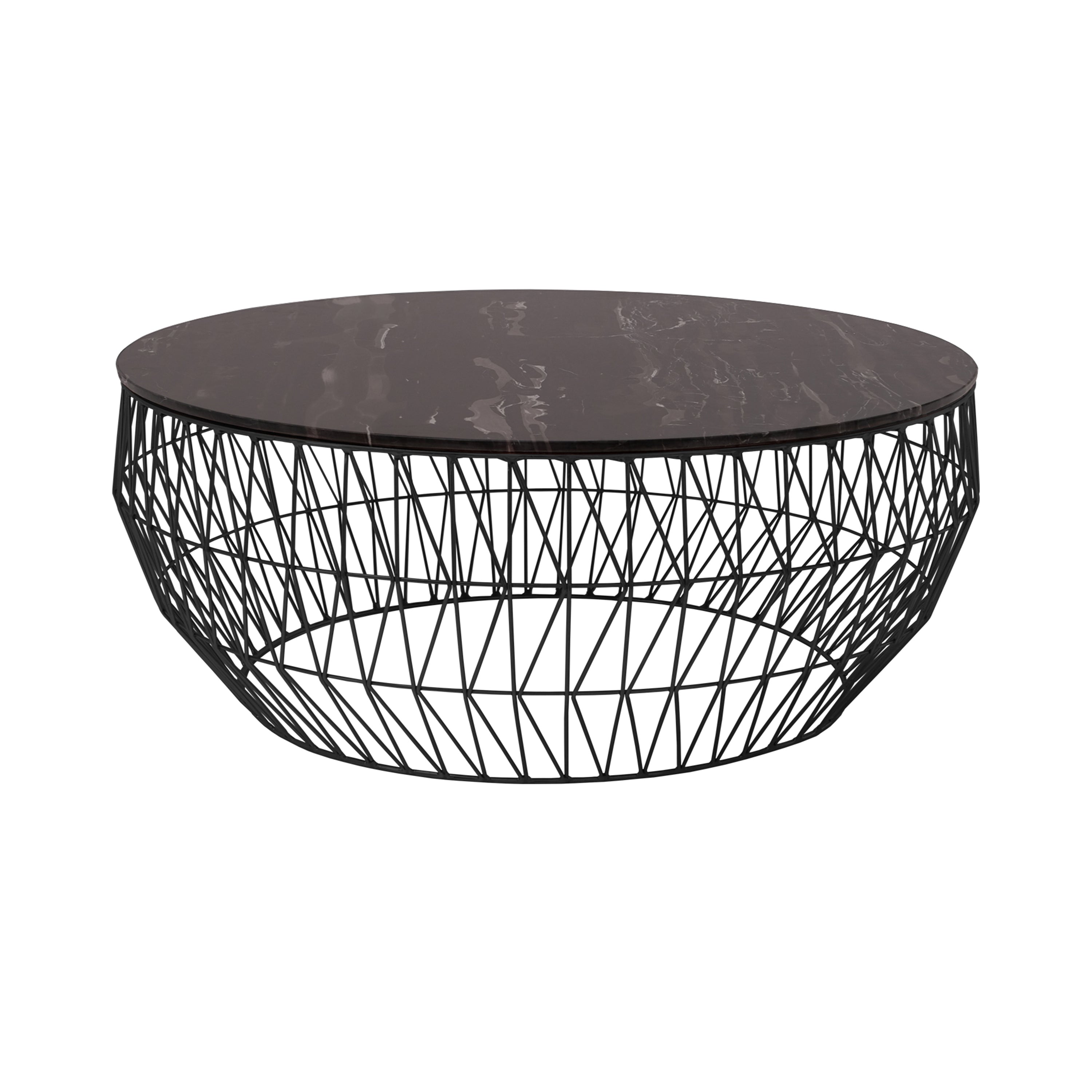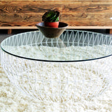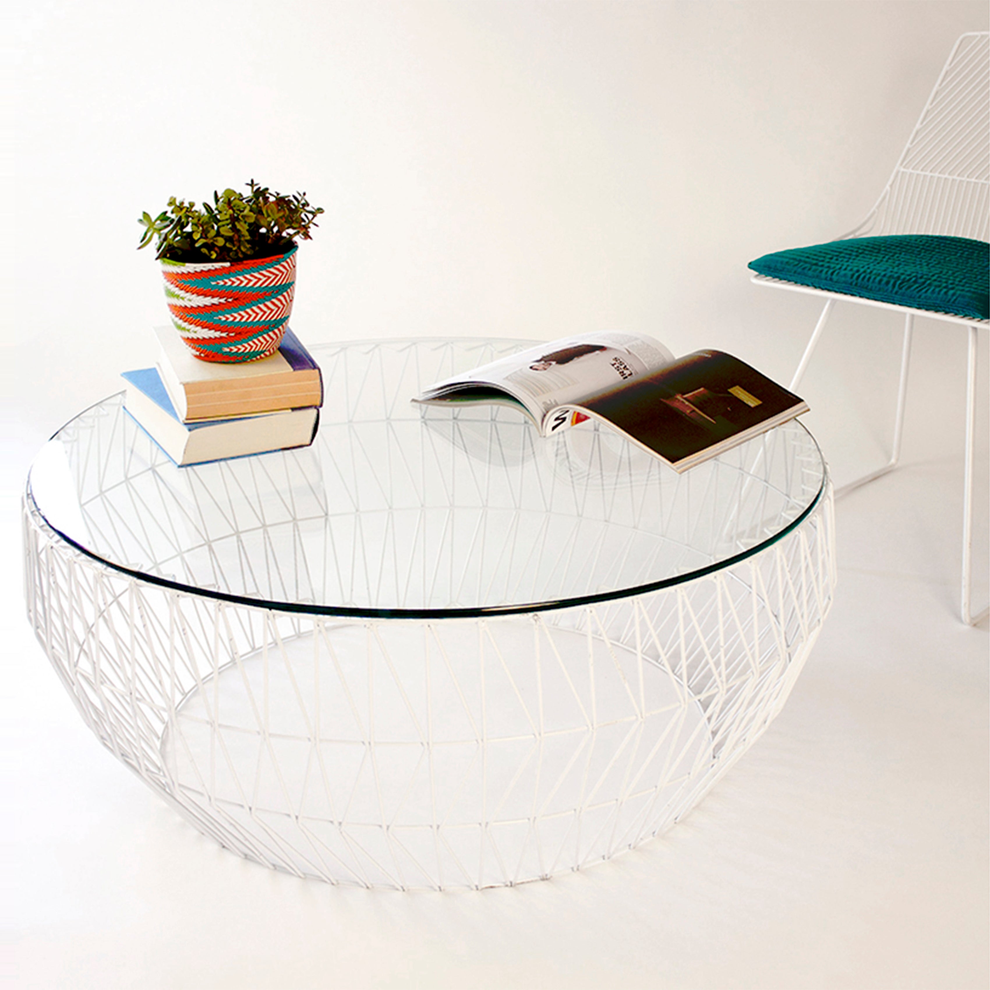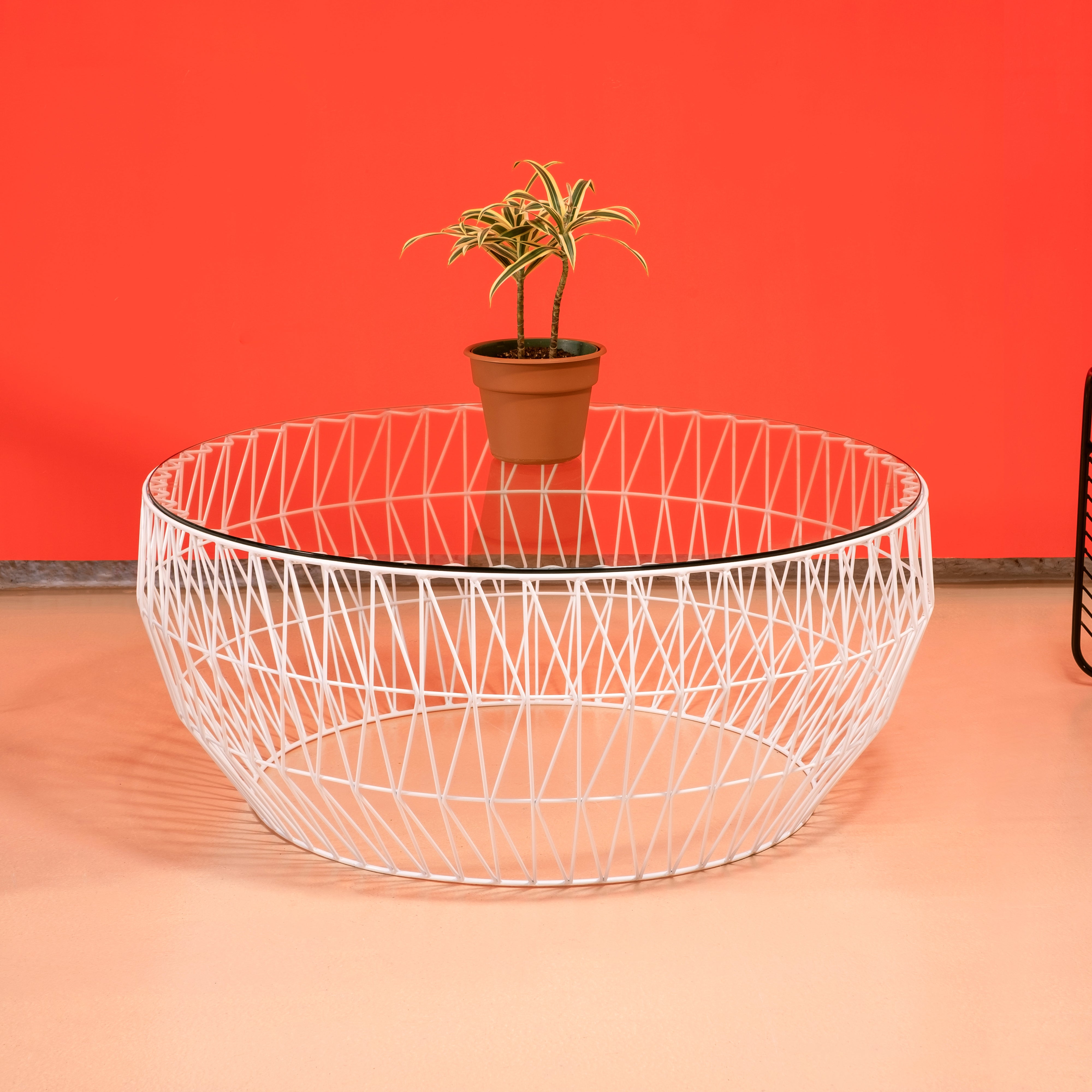 The cage-like base coupled with the glass top gives this coffee table a sense of lightness. The distinct geometric pattern is signature Gaurav Nanda, the creative founder behind the Los Angeles-based Bend Design. This over-sized table is realized by way of a process Gaurav dubs "bending." Applied to all of his completely handmade furniture, the iron is shaped, then spot-welded in hundreds of places. Then it's galvanized and given a powder-coated finish that withstands the elements. Consider it for outdoor or indoor use.