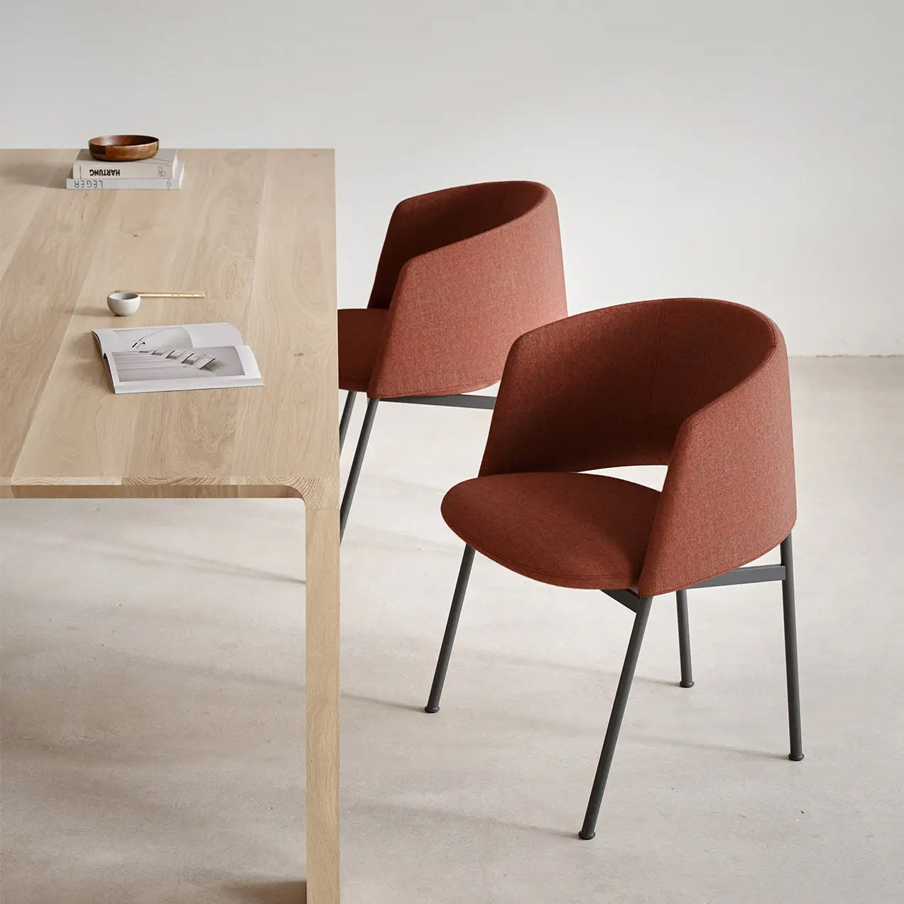 Featuring the same enveloping silhouette as Collar Lounge, Bensen’s dining chair version is perched on thin metal legs in a choice of finishes. With the signature curved backrest, the seating is available in a wealth of trim fabric and leather upholstery options. Designed in Canada, Bensen furniture is made in Italy to the highest standard.