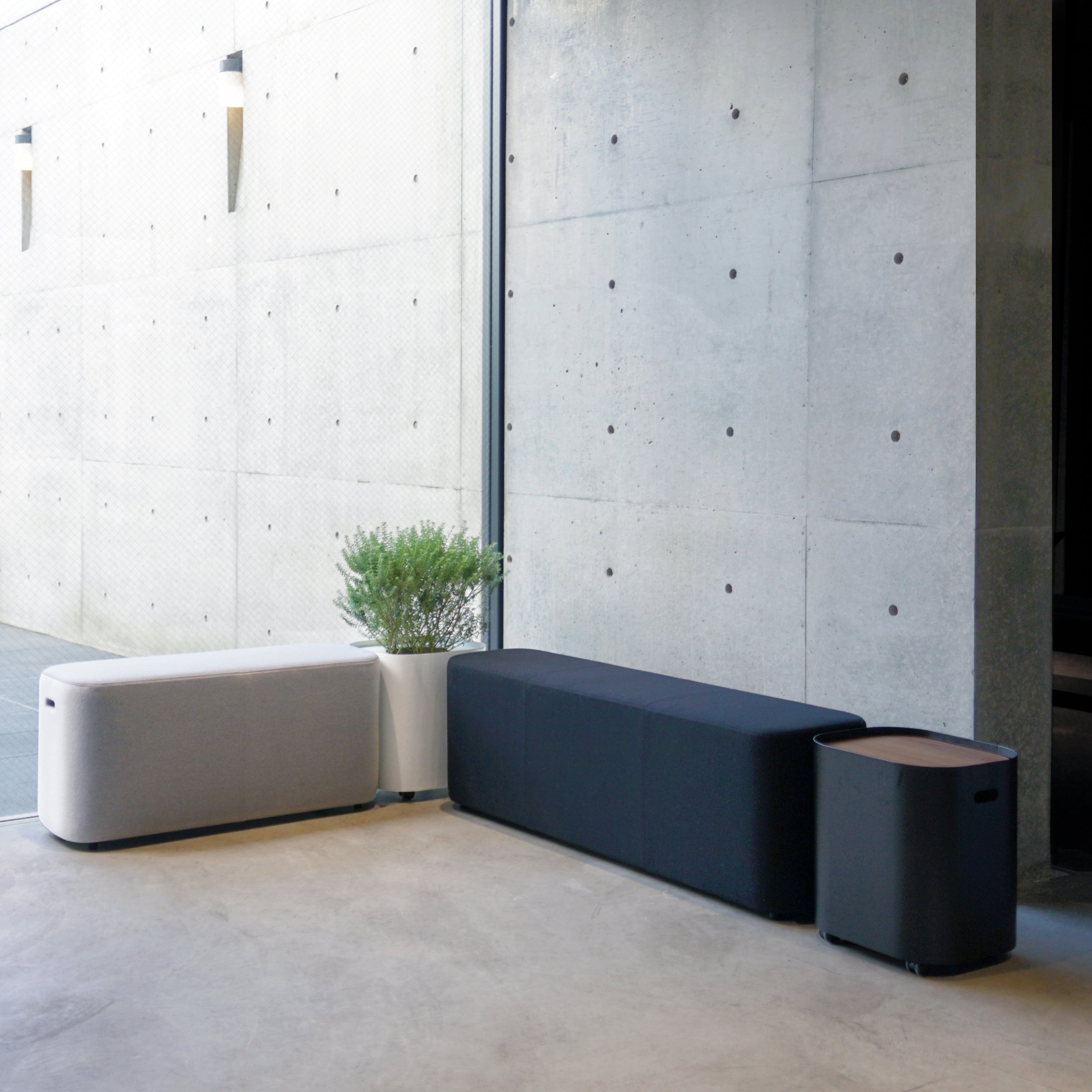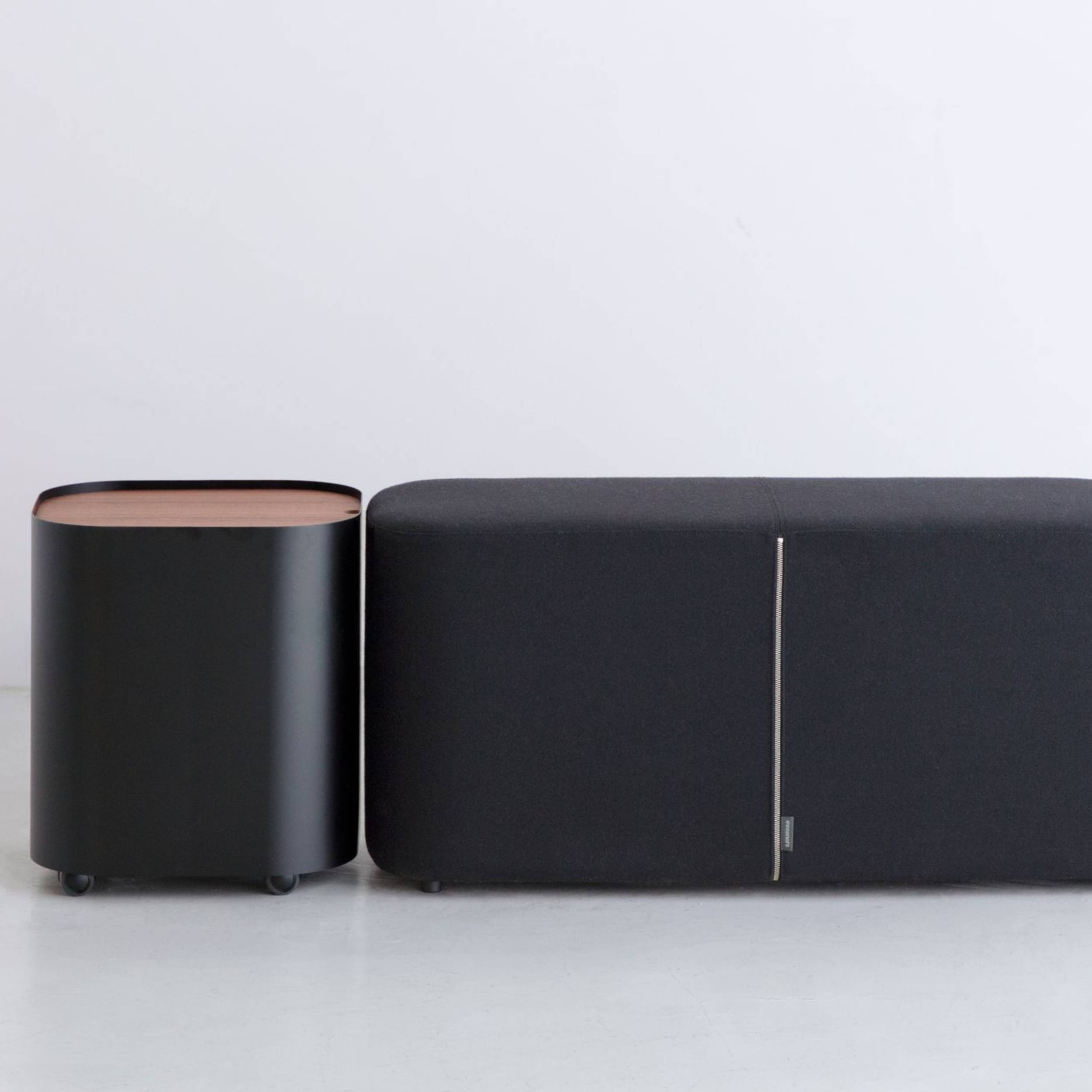 To complement his upholstered bench, designer Keiji Takeuchi adds a similarly shaped side table with the easy maneuverability of rolling casters. Fashioned in powder-coated steel with an inset tabletop in oak or walnut, Loaf has the same rounded contours as the seating. Small handles at the sides also underscore its adaptable utility.