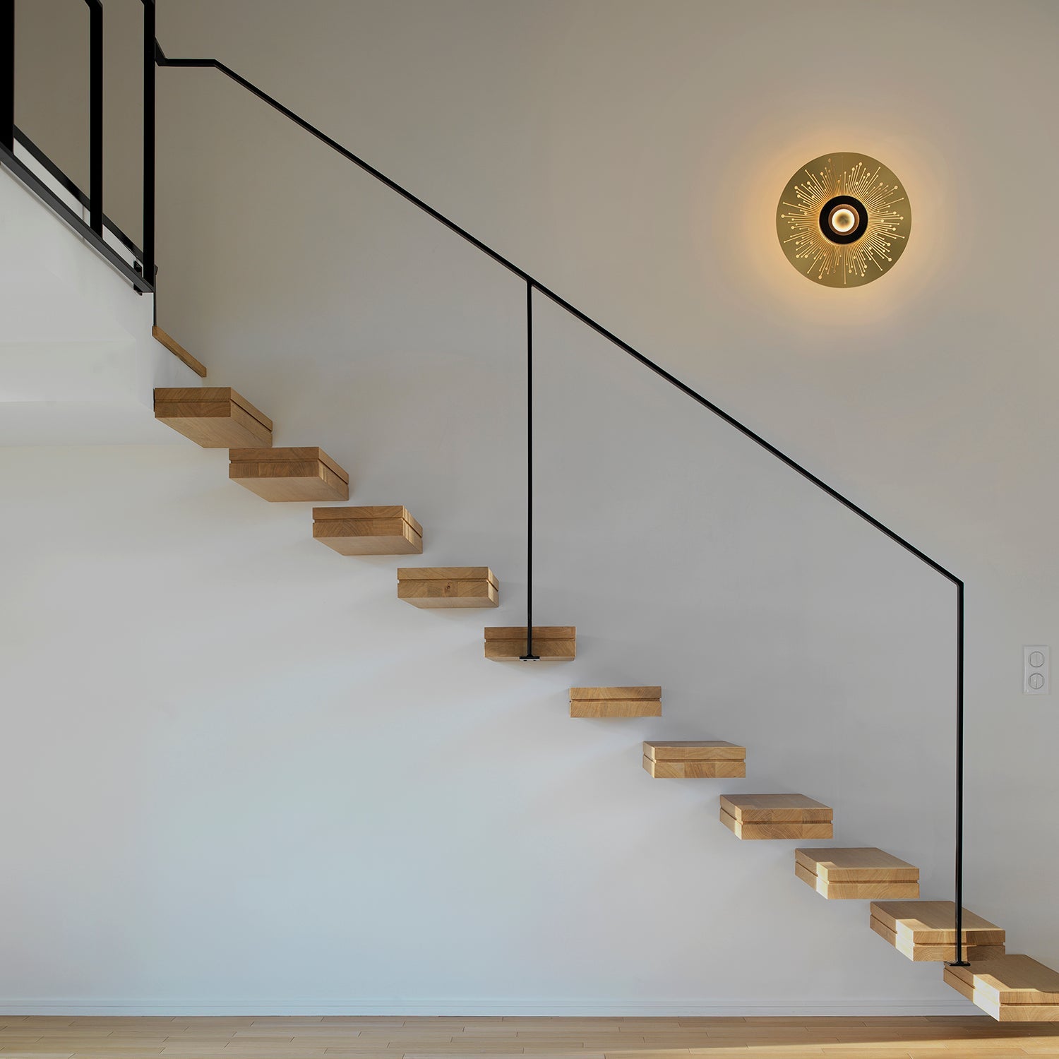 An abstracted pattern of the sun's rays fans out from the illuminated center of this eye-catching variant from the Earth wall light collection. Designer Émilie Cathelineau creates a golden glow with her fixture Sun, leavening the illumination provided by the central LED light source. Artisanal French maker CVL handcrafts this modernist lighting in solid brass, part of a legacy of more than 50 years of finesse from the company located in the Loire Valley.