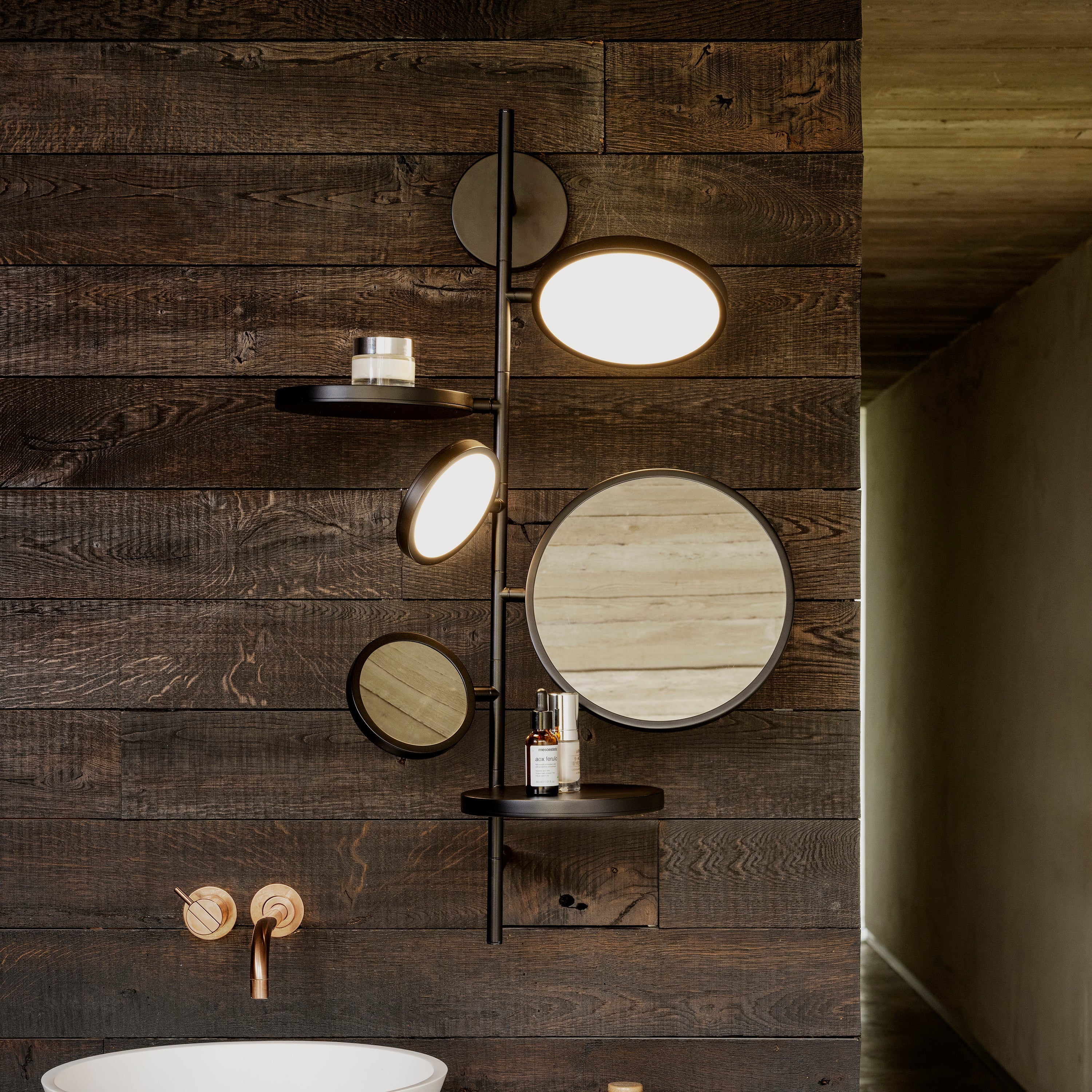 With graphic panache from its multiple discs, Tell Me Stories completely outfits the bathroom with its adjustable combination of 2 wall lights, 2 mirror discs (regular and 3x magnifier) and 2 round shelves. Italian designer Giulia Liverani's innovative array provides direct or indirect lighting via just a swivel of each of the lamps with their diffused integrated LEDs while shelves hold toiletries and make-up. Humidity-, water splash- and condensation-resistant, this beaut comes in silver, gold or black finish.