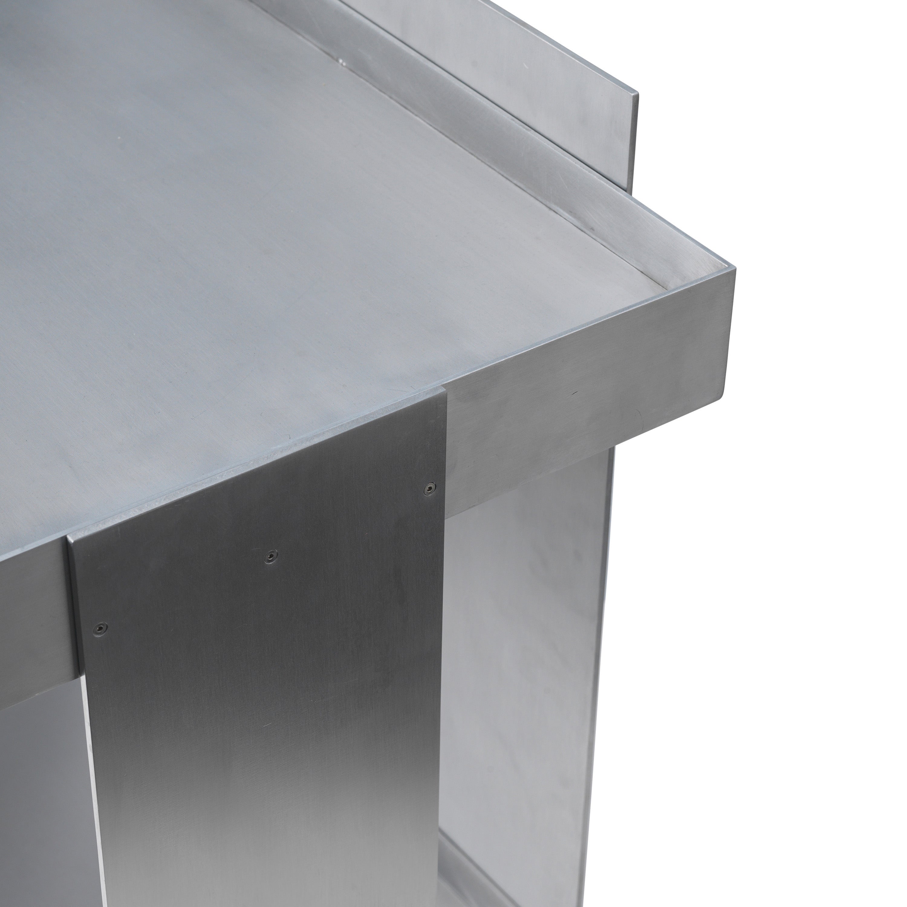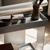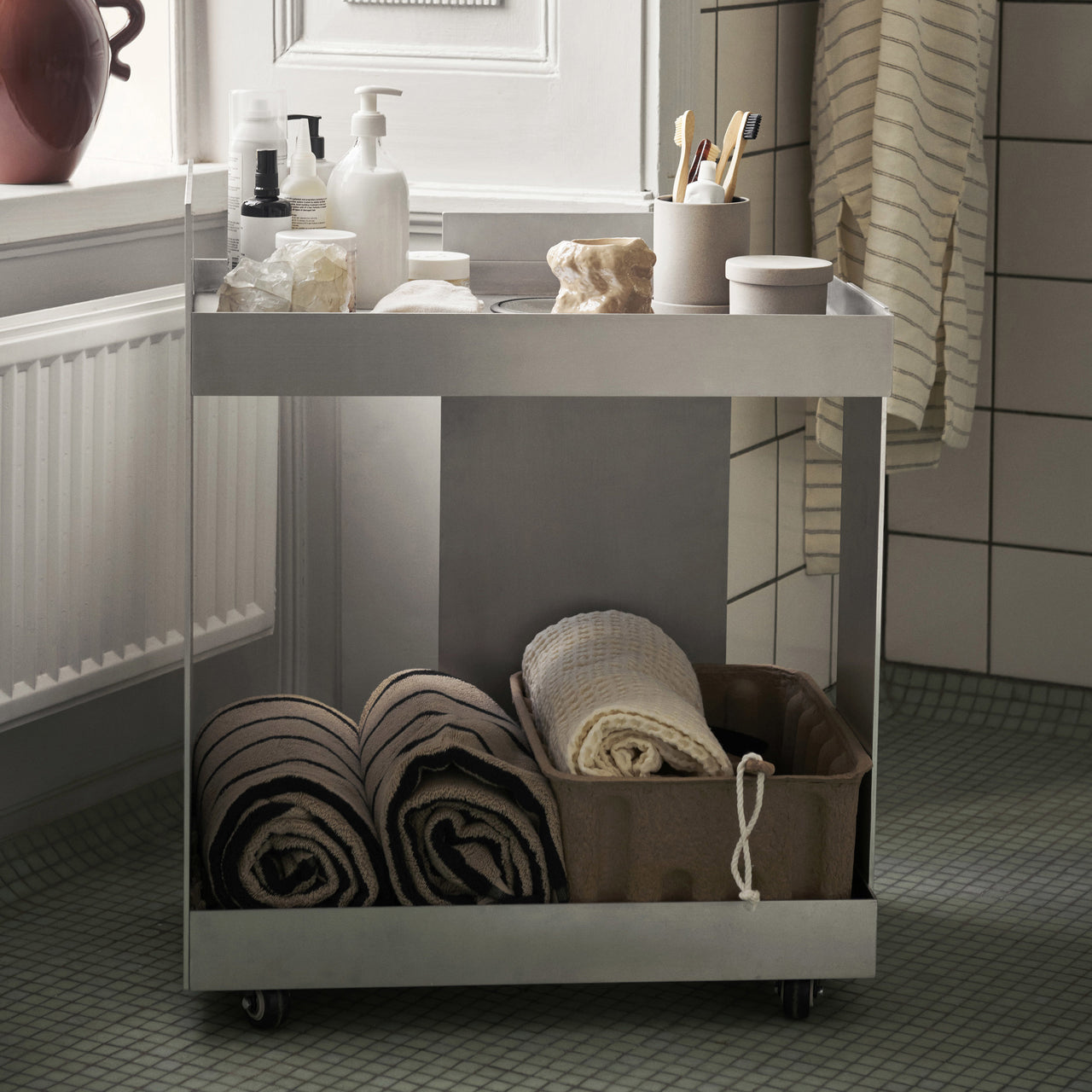 The Lager Trolley draws inspiration from brutalist design, featuring a geometric structure crafted from brushed aluminum. Its two-tiered design offers ample space for storage or display, while the castor wheels ensure easy mobility. This versatile piece can function as a bar cart, side table, or storage solution in various settings.