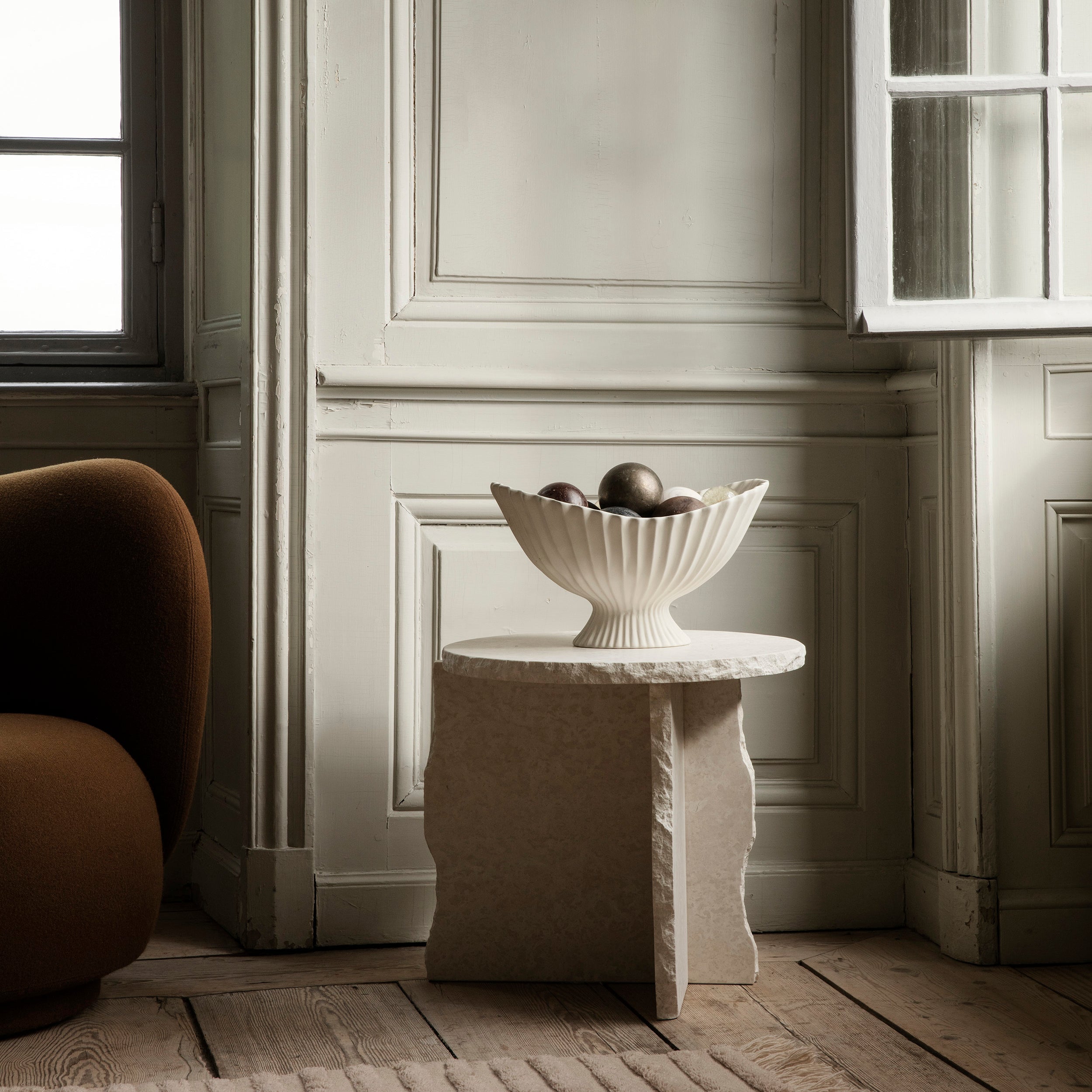 Ferm Living diverts to a Brutalist aesthetic with a sculptural side table hewn entirely from slabs of Bianco Curia marble. Mineral strikes an undeniably muscular impression, with edges that are broken by hand with a chisel thus making each table unique. Characterised by its distinctive T-shape, rough expanses and contrasting polished surfaces, it makes a memorably vivid addition to an interior.