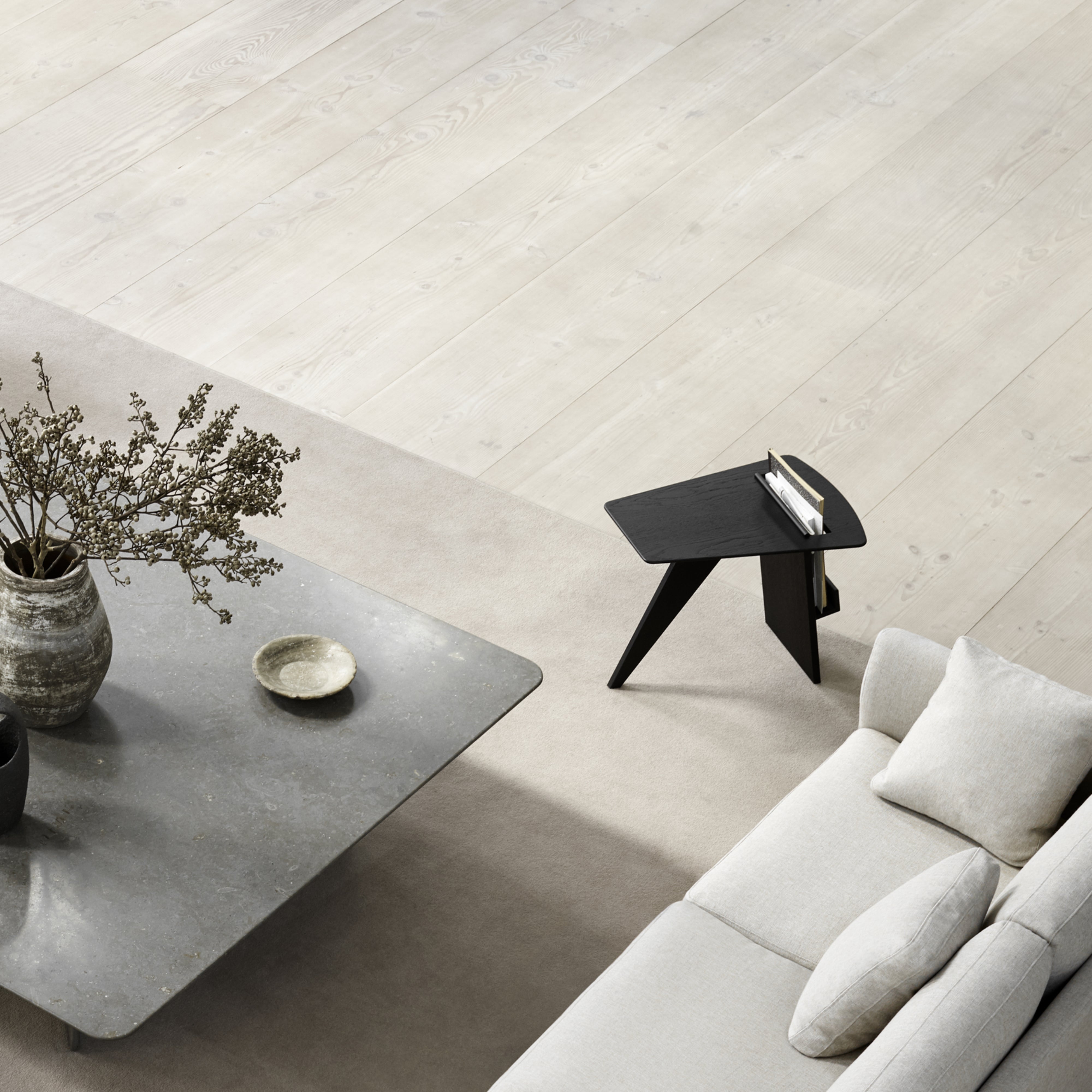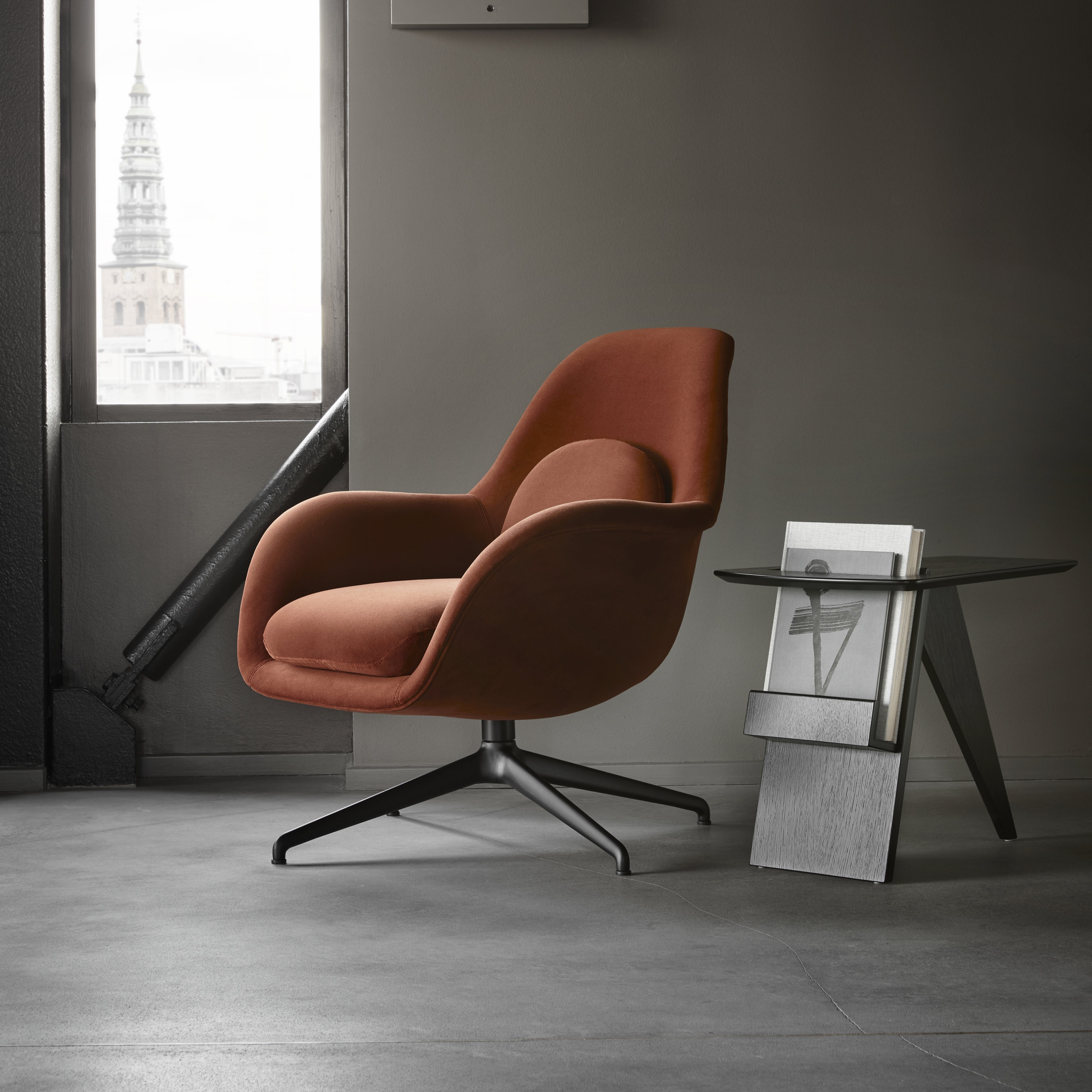 Designed in 1949, the sweeping diagonal lines with softened cut-outs and curves give Jens Risom’s functional magazine table a striking, sculptural silhouette. Apropos for any contemplative setting from hotels to private homes, the “furniture with a signature,” as the designer called it, also reflects his penchant for thoughtful practicality. Available in natural or black lacquered oak plywood, the angular piece intrigues even as it provides a perfect stash for any reading material.