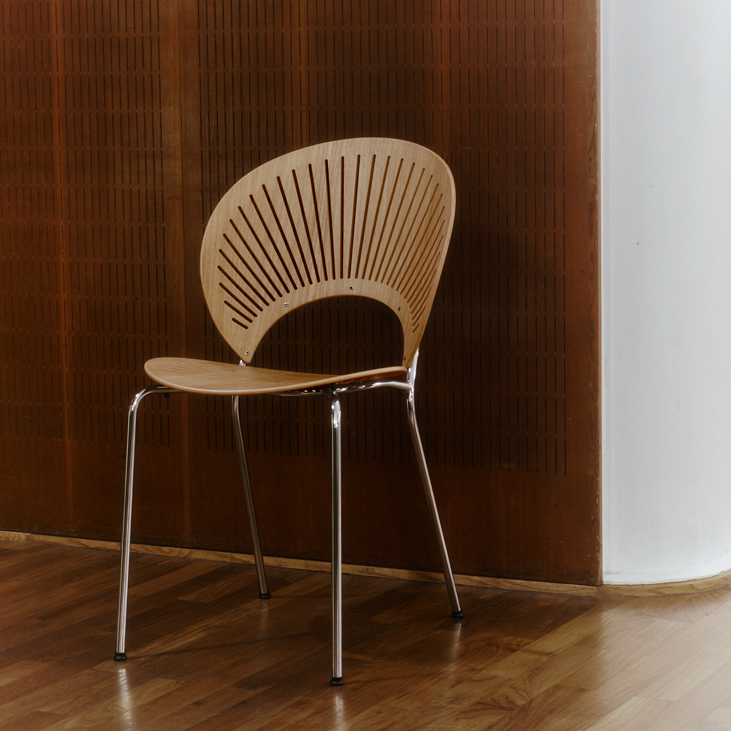 Light filters through the intricate cut-outs of this chair, casting dynamic patterns that enliven any space. Featuring a moulded plywood backrest with CNC-milled fretwork, the design takes inspiration from the decorative Gingerbread facades seen in Trinidad. The steel tube frame provides strength and stability, while interchangeable plastic glides help protect floors. Originally designed by Nanna Ditzel in 1993—a key figure in Danish design—the chair is stackable up to eight units, making it ideal for both public venues and private interiors. Its ventilated seat not only enhances comfort but also contributes to improved acoustics.
