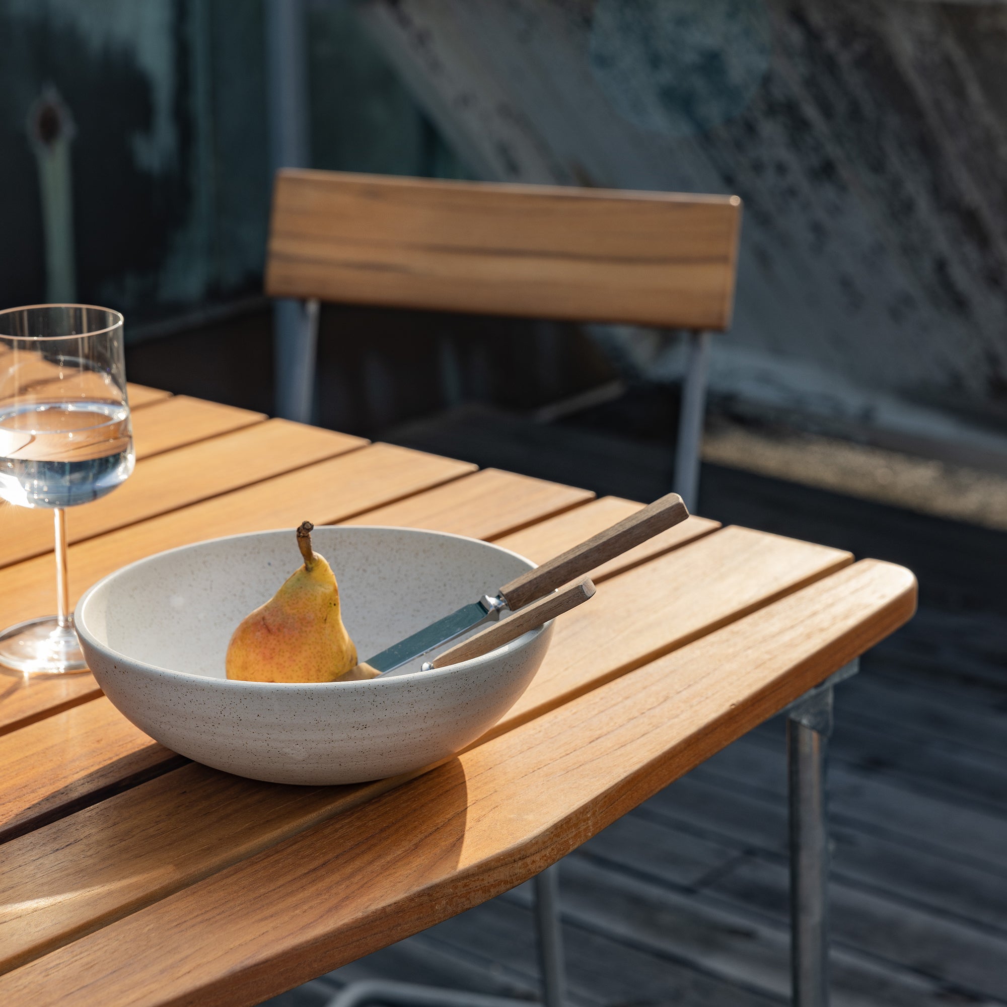 Table B31 by Grythyttan Stålmöbler, designed by Artur Lindqvist in the 1950s, is a robust outdoor table featuring a steel base and a rectangular teak wood top. Ideal for seating 6-8 people, the table has a foldable base for easy storage and transport. Over time, the galvanized steel develops a matte finish, and the teak wood acquires a silver-gray patina. This table combines durability and practical design, embodying the craftsmanship of Grythyttan Stålmöbler.