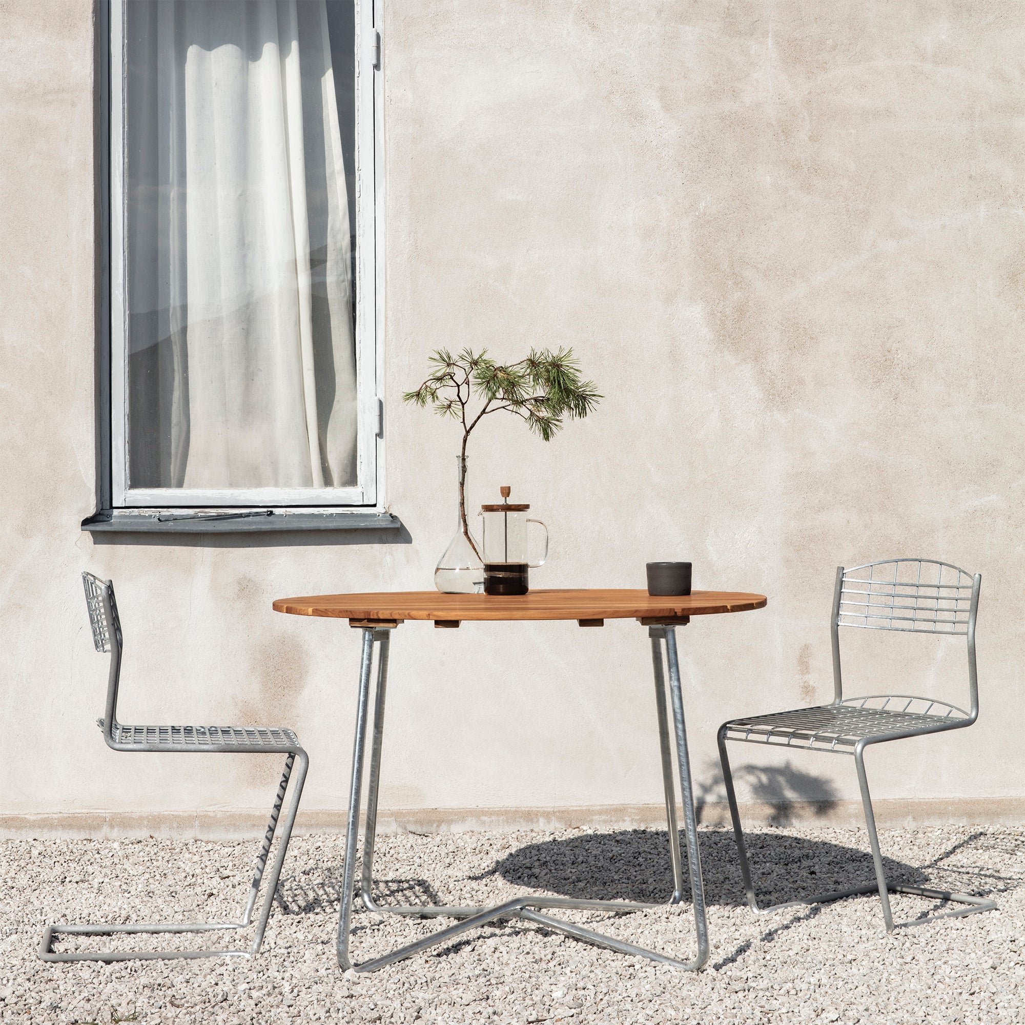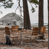 Part of the Classic series, originally designed by Artur Lindqvist in the 1930s. This table features a durable steel base paired with a round wooden top, available in variants such as untreated teak, oiled oak, oiled pine, and white lacquered oak. It is designed for outdoor use, ideal for settings like terraces or gardens. The table’s removable and collapsible base allows for easy storage and transport. Over time, the steel base acquires a matte finish, while the teak develops a silver-grey patina.