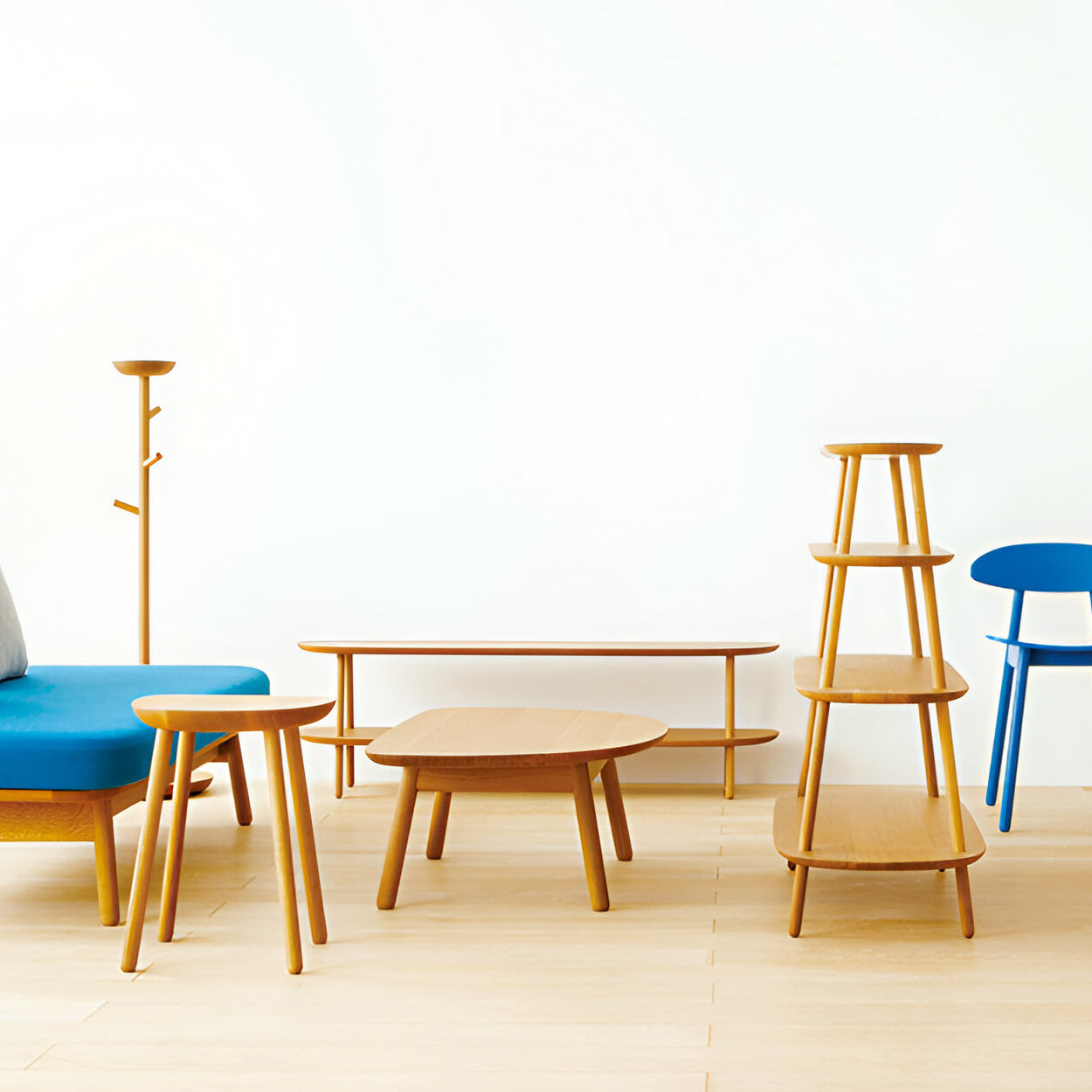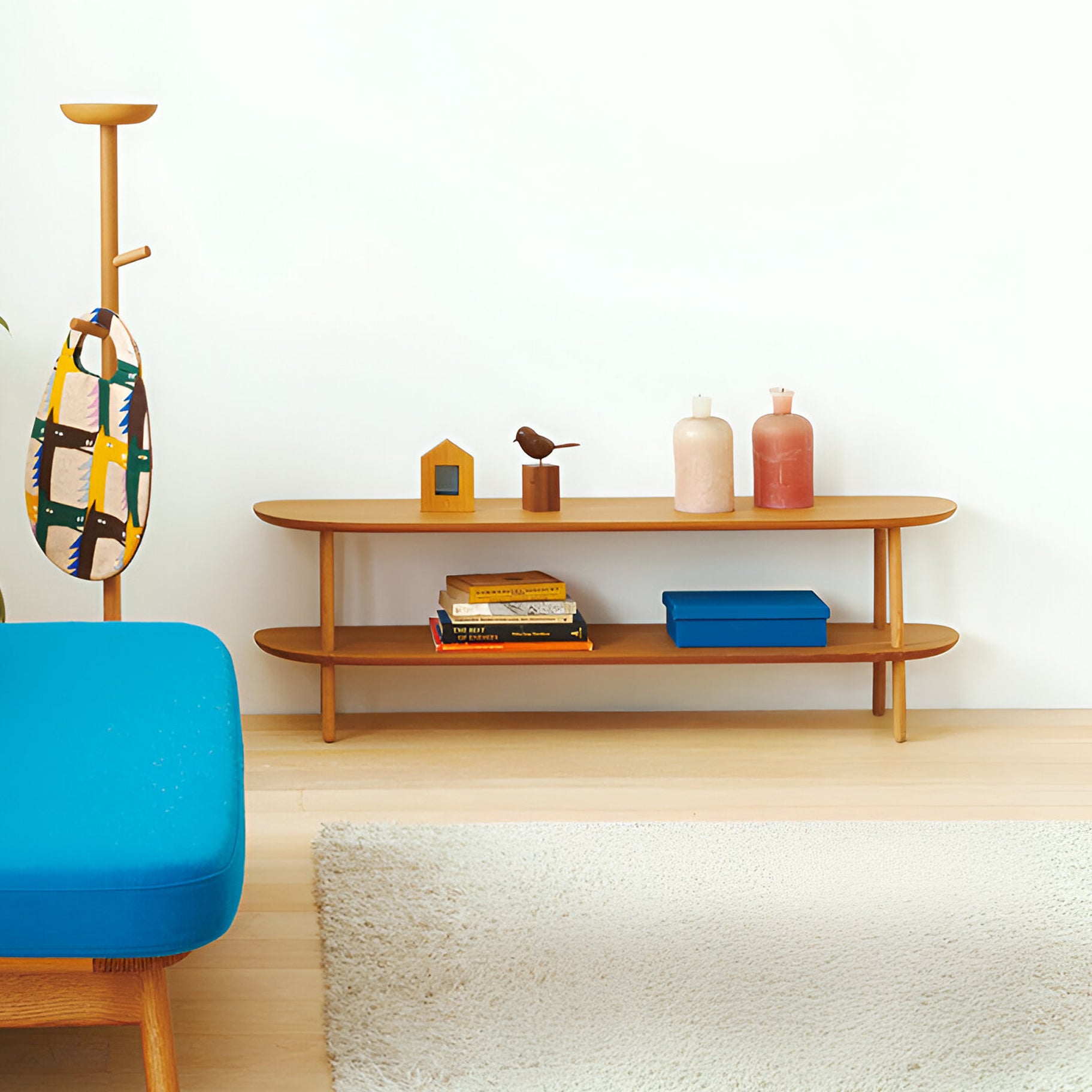 The Cobrina TV Stand is a compact piece crafted from solid white oak to suit modern entertainment setups. It features open shelves for organizing media devices and accessories, helping to maintain a tidy space. The low-profile design supports a television while contributing to an open and spacious feel in the room. The Cobrina series, named after the Japanese words for "small" and "petit," focuses on creating space-saving furniture ideal for smaller living areas.