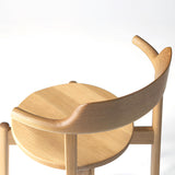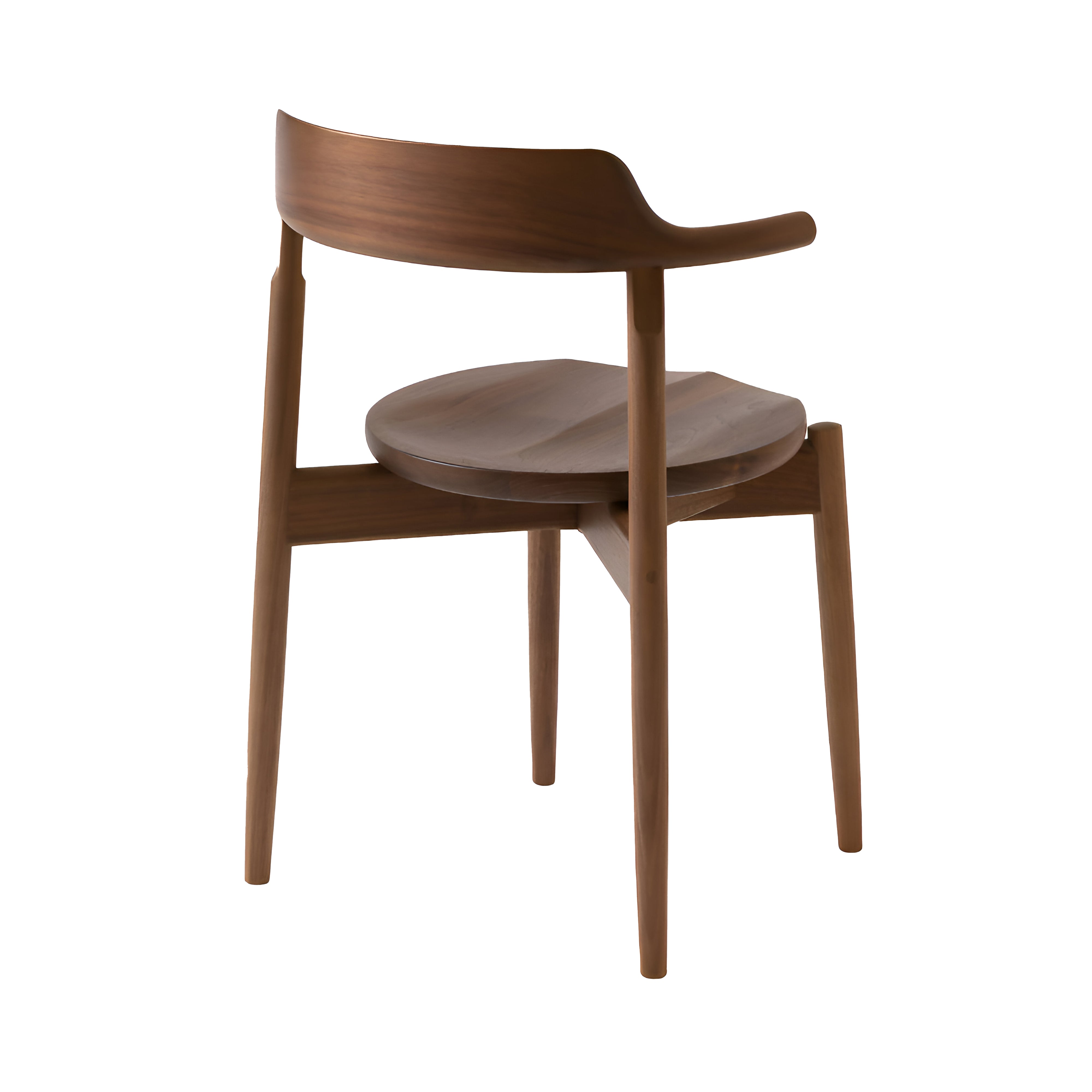 The Tsubura Semi Armchair features a seamless backrest and armrests crafted from a single piece of bentwood, highlighting the continuous wood grain. The three-dimensional curvature of the backrest and the contoured seat offer gentle support for added comfort. Built for durability, the chair has reinforced joints between the legs and seat frame. Available in oak or walnut.