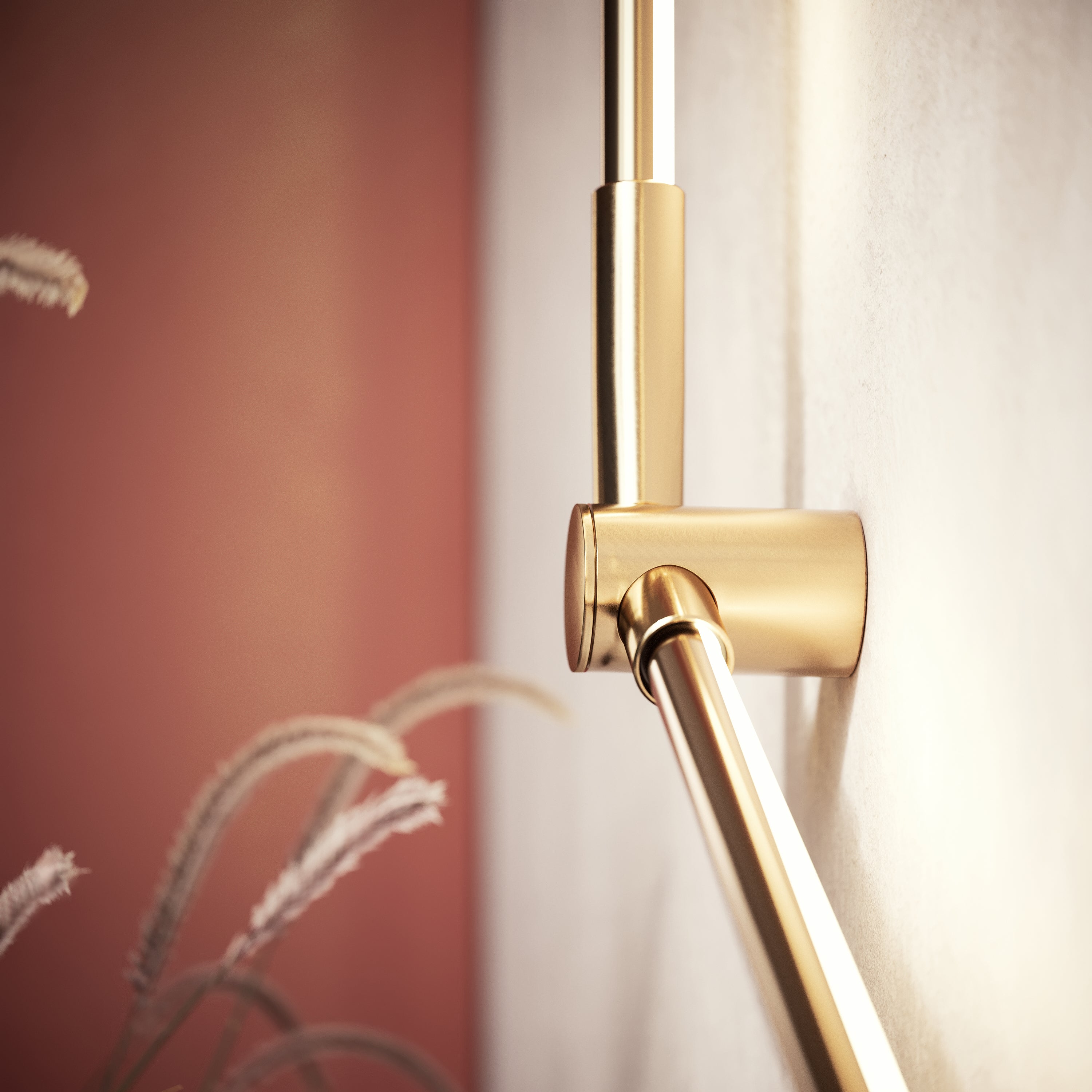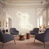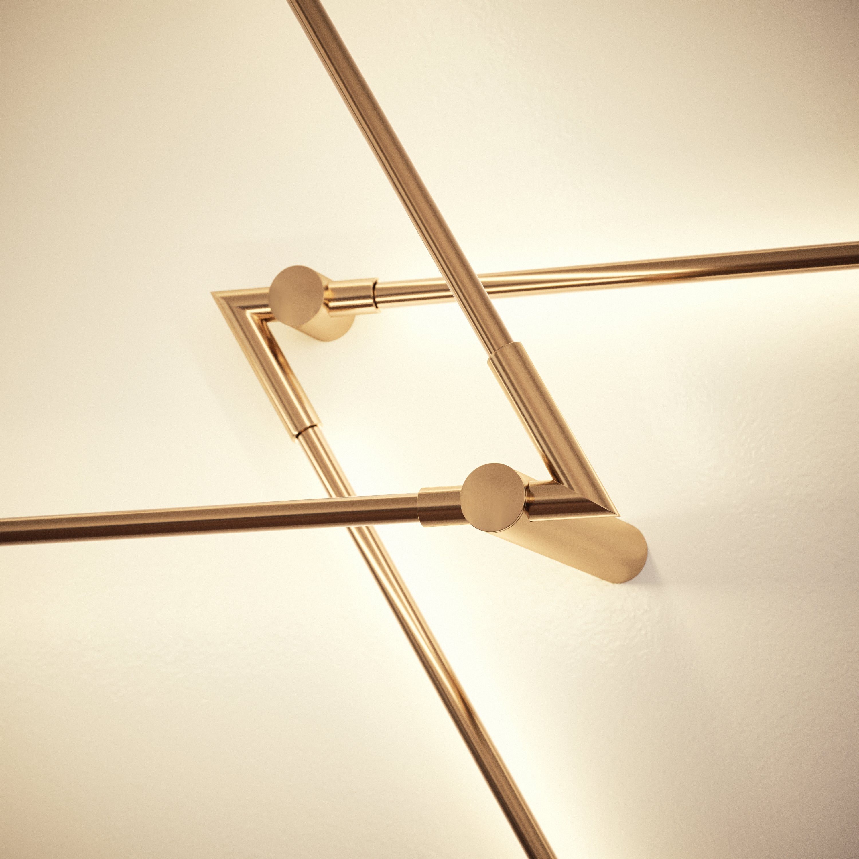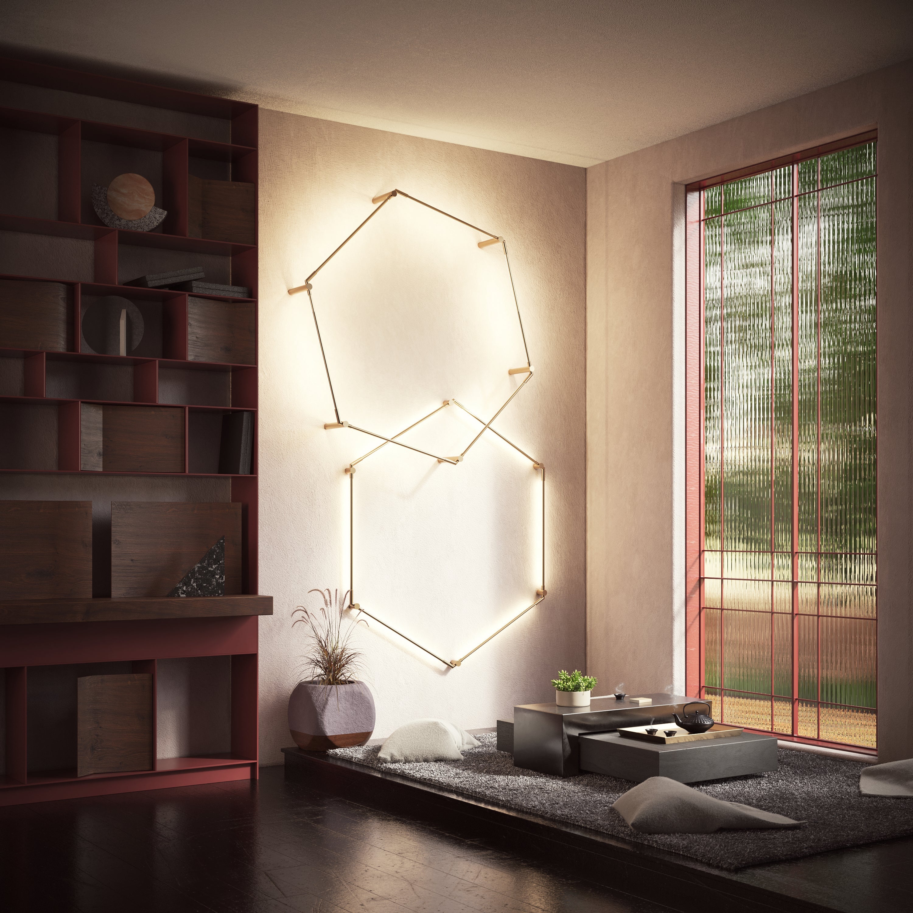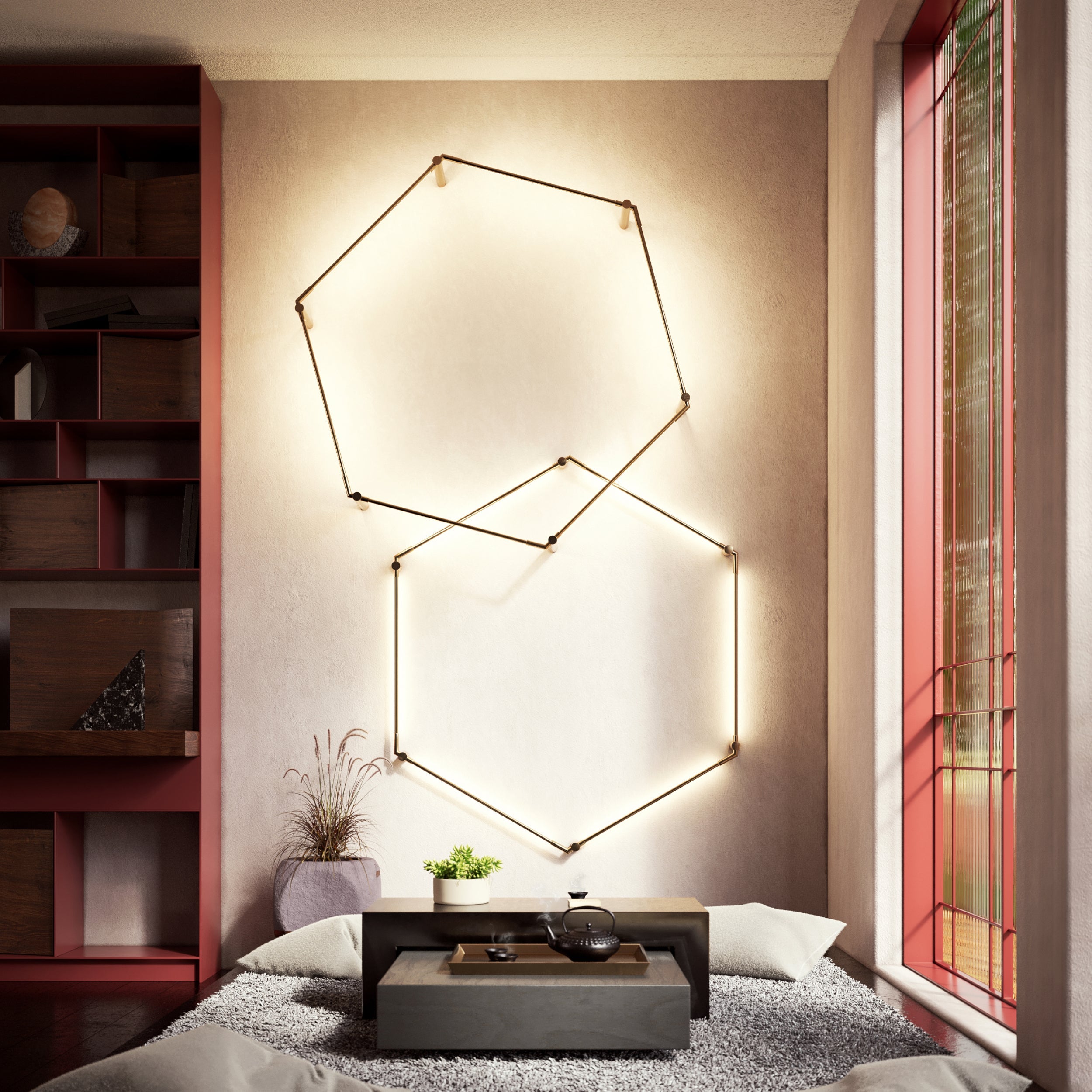 Juniper offers its elegantly minimal Thin Primaries in a series of striking geometric shapes composed of the reedy solid-brass LED segments to mount on the wall or ceiling. As a standalone light or a framing device, the remarkable 1/2-inch lengths fully rotate 360 degrees, connected by magnetic fittings and also offer a choice of standoff heights.