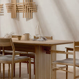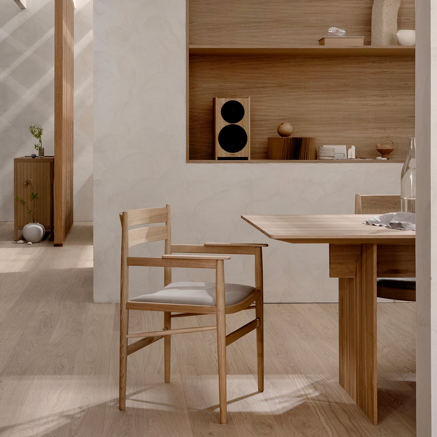 An expression refined through the marriage of wood clarity and thoughtful structure, this chair frames space with straight oak lines, subtly defined by a single angled stretcher that adds presence and visual direction. Crafted from premium oak in 4 finishes like pure, smoked, grain matte black, or keyaki brown, the chair’s tactile richness is enhanced by optional seats in solid wood, woven paper cord, or upholstery.