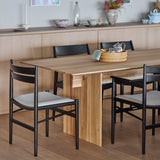 The Hiroo Dining Chair N-DC05, designed by Norm Architects, is a simple expression of straightforward, functional seating design executed with exceptional woodworking. Its structure, primarily composed of straight elements, is subtly contrasted by a single angled stretcher. Crafted from premium oak, available in finishes smoked oak, pure oak, and grain matte black. This upholstered seat variation is available in a curated range of high-performance fabrics and leathers.