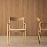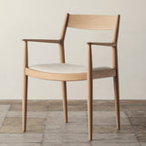An upholstered seat adds a custom character to Karimoku Case's armchair originally conceived for the renovation of Tokyo’s landmark ‘80s Kinuta Terrace apartments. Norm Architects studio brings a spare Nordic sensibility to complement the calm Japanese ideal in N-DC01, with its solid-oak expression in turned legs and a rounded backrest, paired with a fine leather- or textile-covered cushioning.