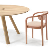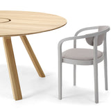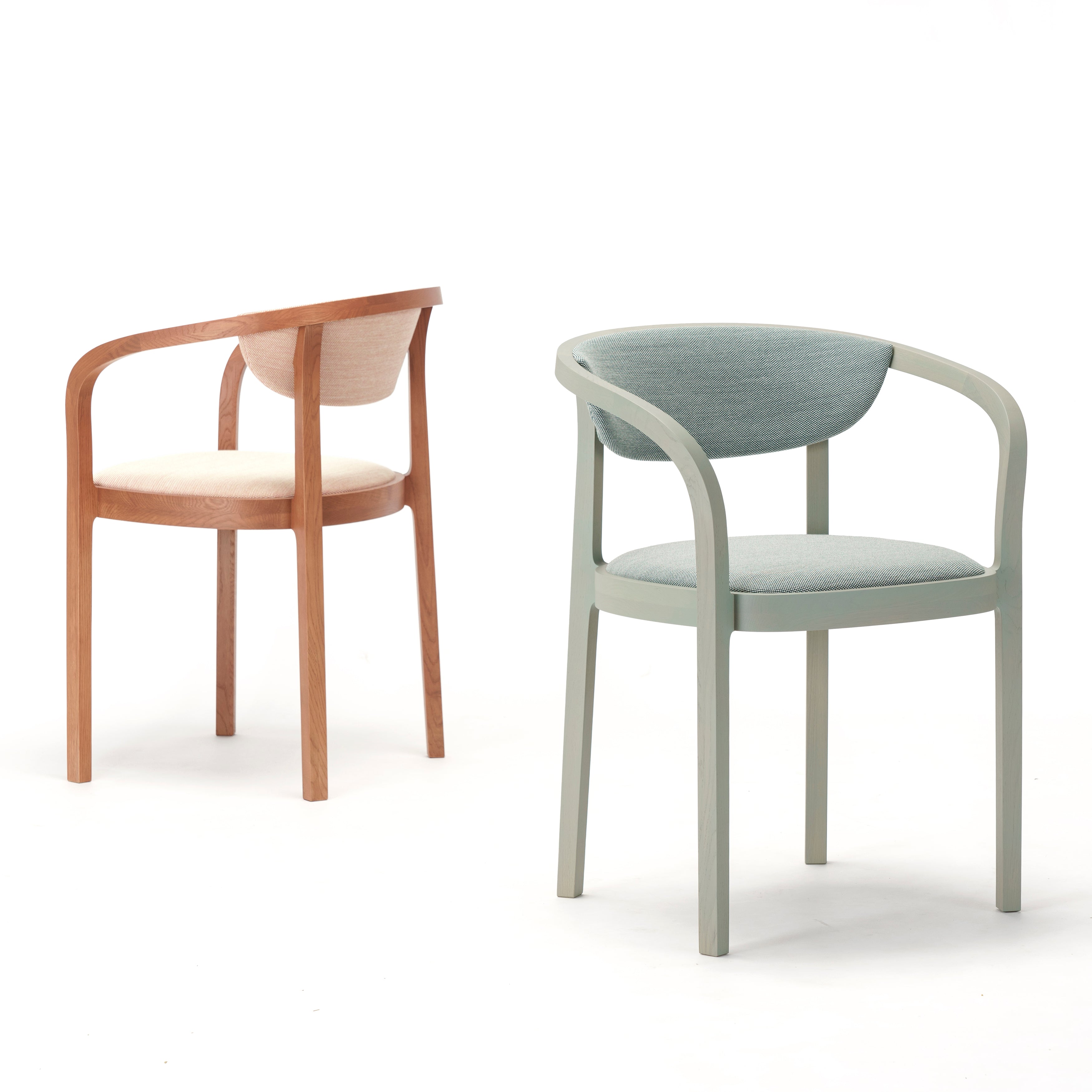 With its padded seat and back clad in Kvadrats Steelcut textile in one of 4 colorways to match its finely crafted solid-oak frame and bent plywood backrest, Chesa underscores the refined air of its calm and elegant design by Jórg Boner. As either a meeting or dining choice, the chair is distinctly characterized by the continuous curvature of the line that follows from the front legs to the backrest, making it a comfortable, cosseted space that also allows for sitting diagonally and facing conversation partners on each side.