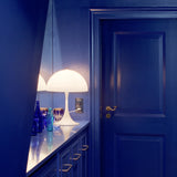 Originally designed in 1971, Panthella has since become recognized as one of Verner Panton's most significant designs and makes for a striking statement table lamp in the 400 version. The opal white form proves not only beautiful but also ingeniously functional, emitting a pleasantly diffused and glare-free light as the hemispherical top shade directs light downward, reflected by the trumpet shaped base.