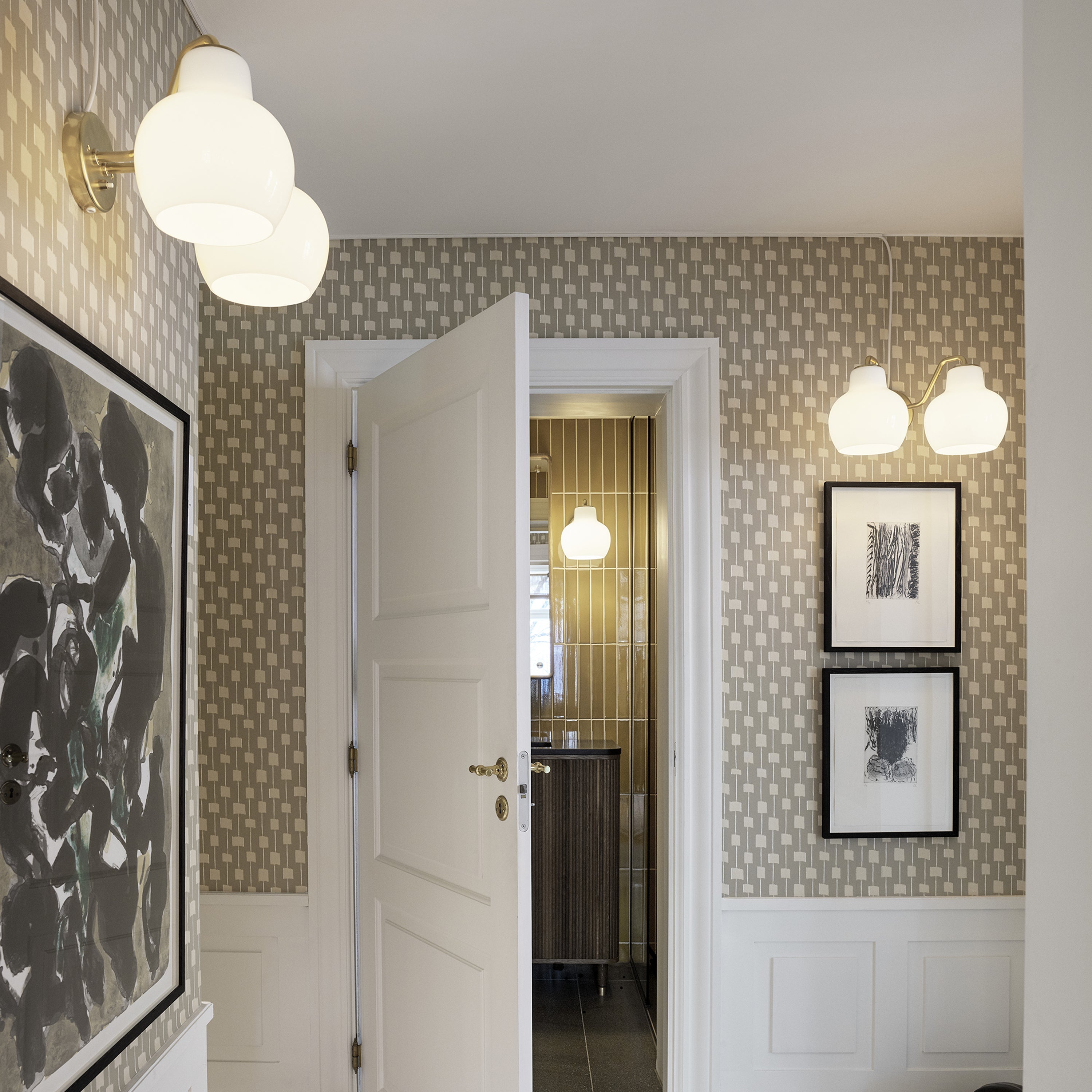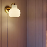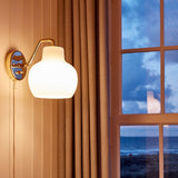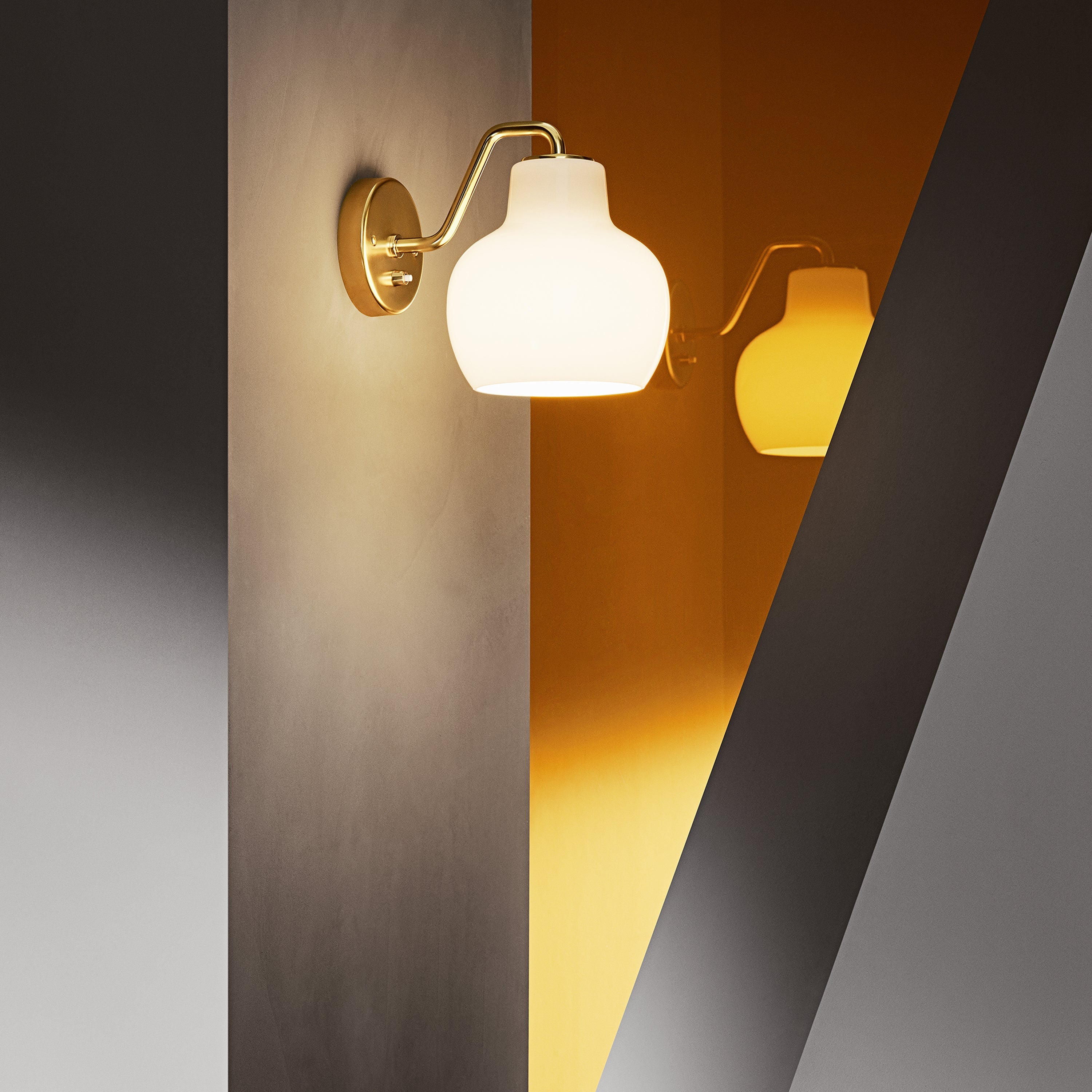 In a choice of single or double versions, architect Vilhelm Lauritzen’s wall lamp made of untreated, polished brass features a glossy white shade design in triple-layered handblown opal glass. Spun off from an original 1940s design for the Danish Broadcasting House, VL Ring Crown lights the way with warm illumination and memorable style.