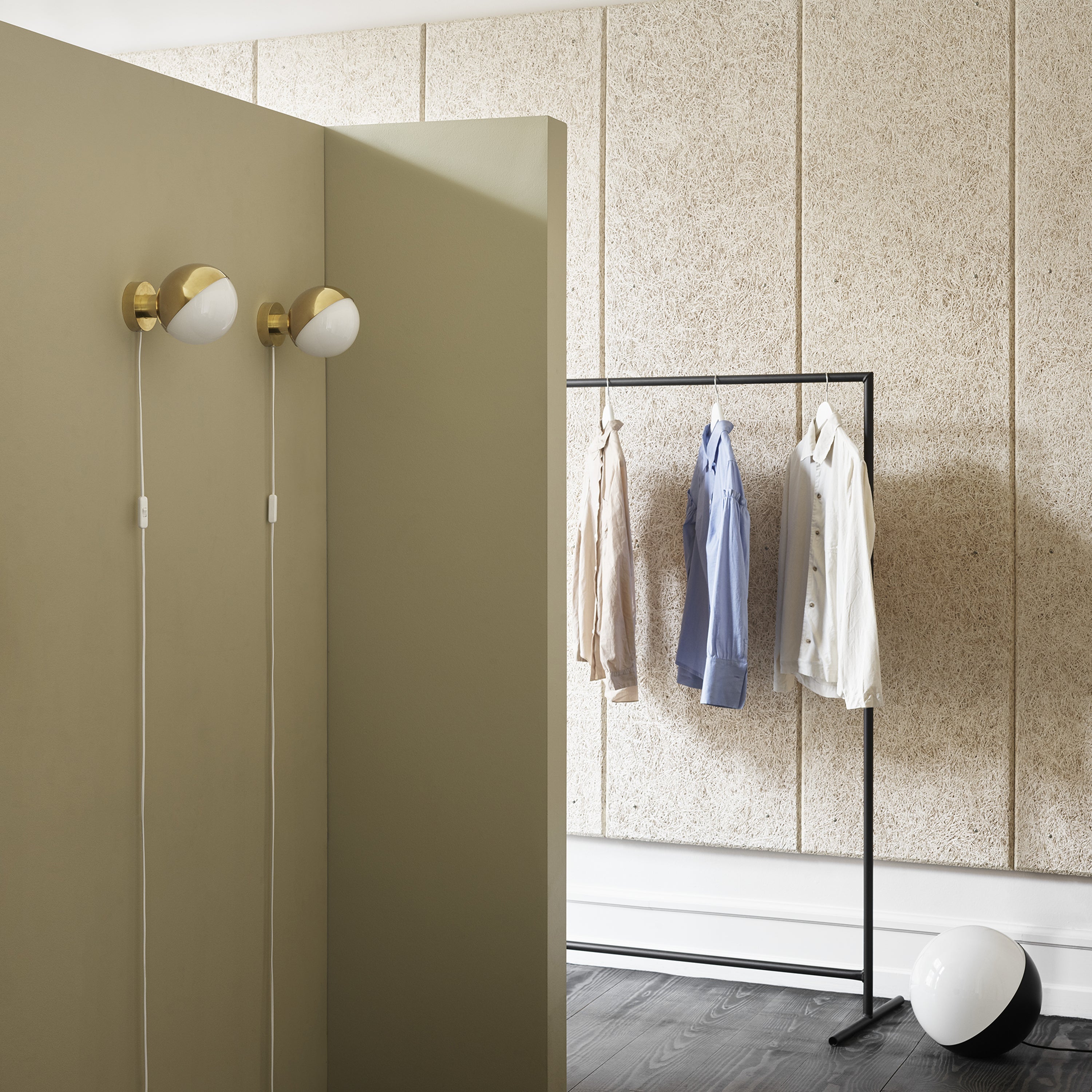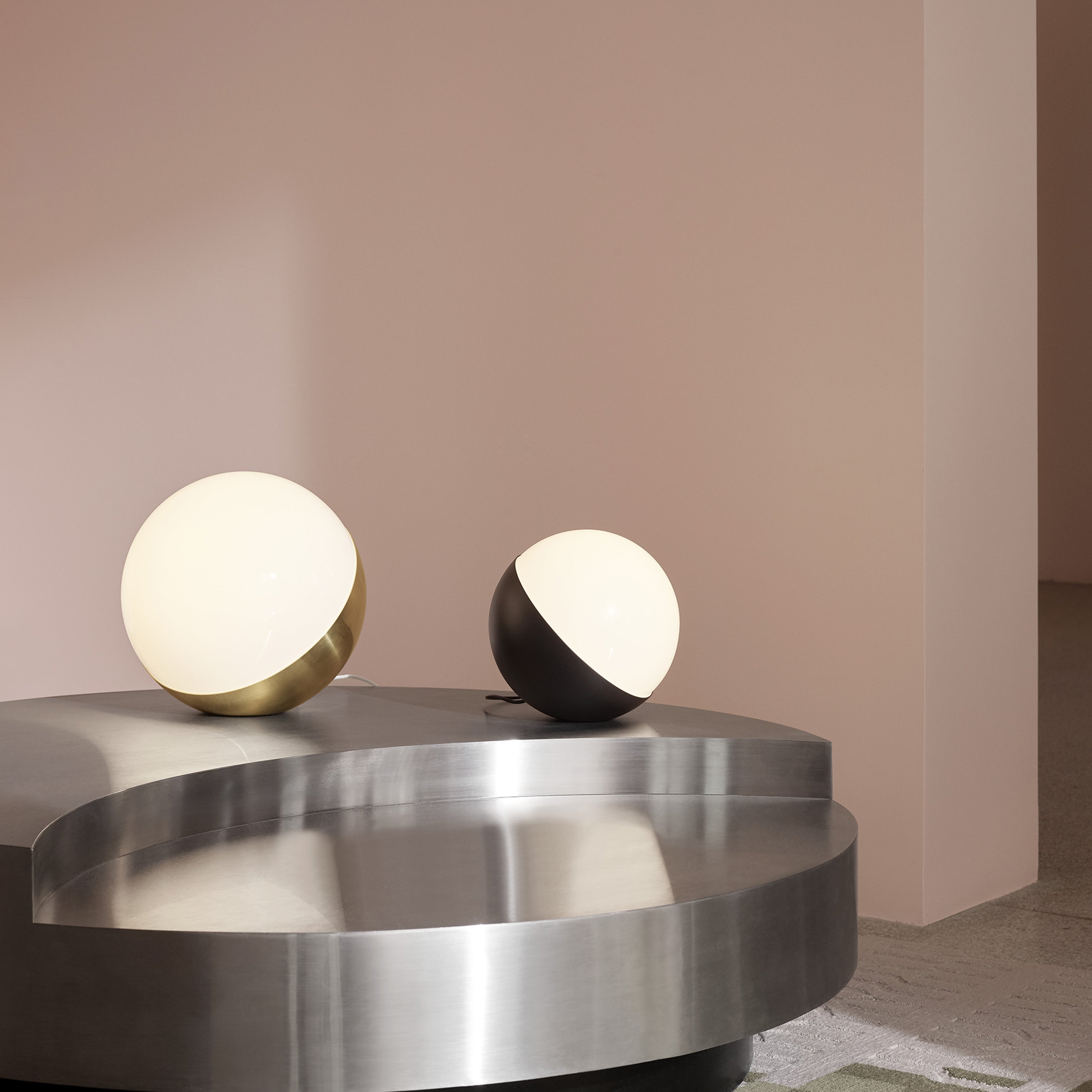 Suggested by 1940s Vilhelm Lauritzen originals for the Danish Broadcasting Co., VL Studio creates a diffused light through a striking handblown round of opaline glass for a warm surrounding glow. In either polished brass that has been slightly brushed or matte-black for a more graphic effect, it comes in 3 sizes that each can be positioned as a floor lamp or a table light as desired.
