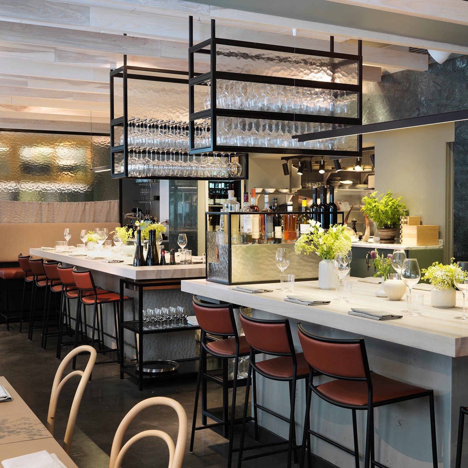 Massproductions adapts its lightweight, sturdy and straightforwardly attractive Jig seating to a stool model, in either bar or counter height. Ideal for commercial spaces and hospitality areas, it takes an unexpectedly industrial material—steel tubing—to configure the architectural framework. The seat and backrest feature tailored cushioned panels, with a wide variety of possible combinations of upholstery fabric and painted chair frame colors.