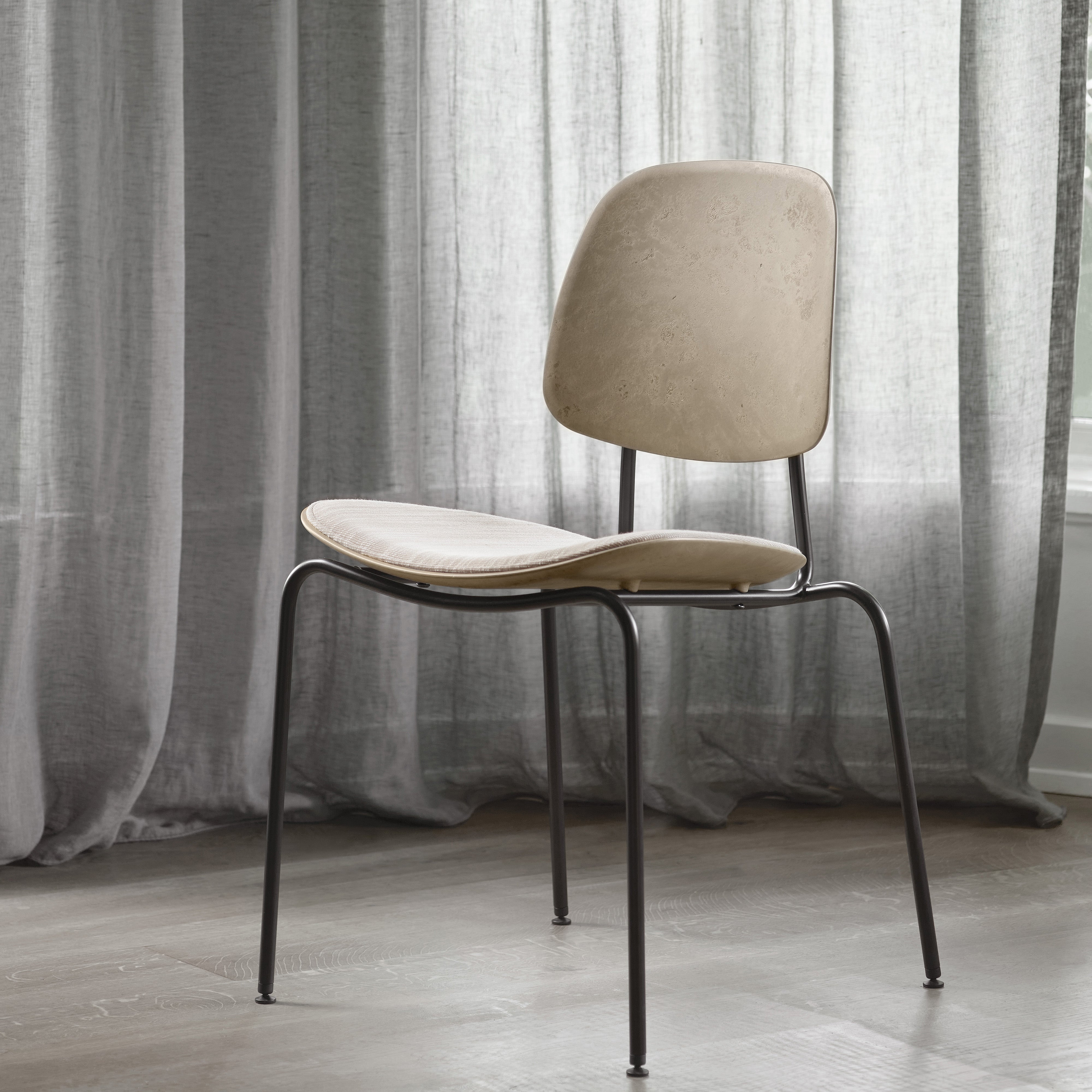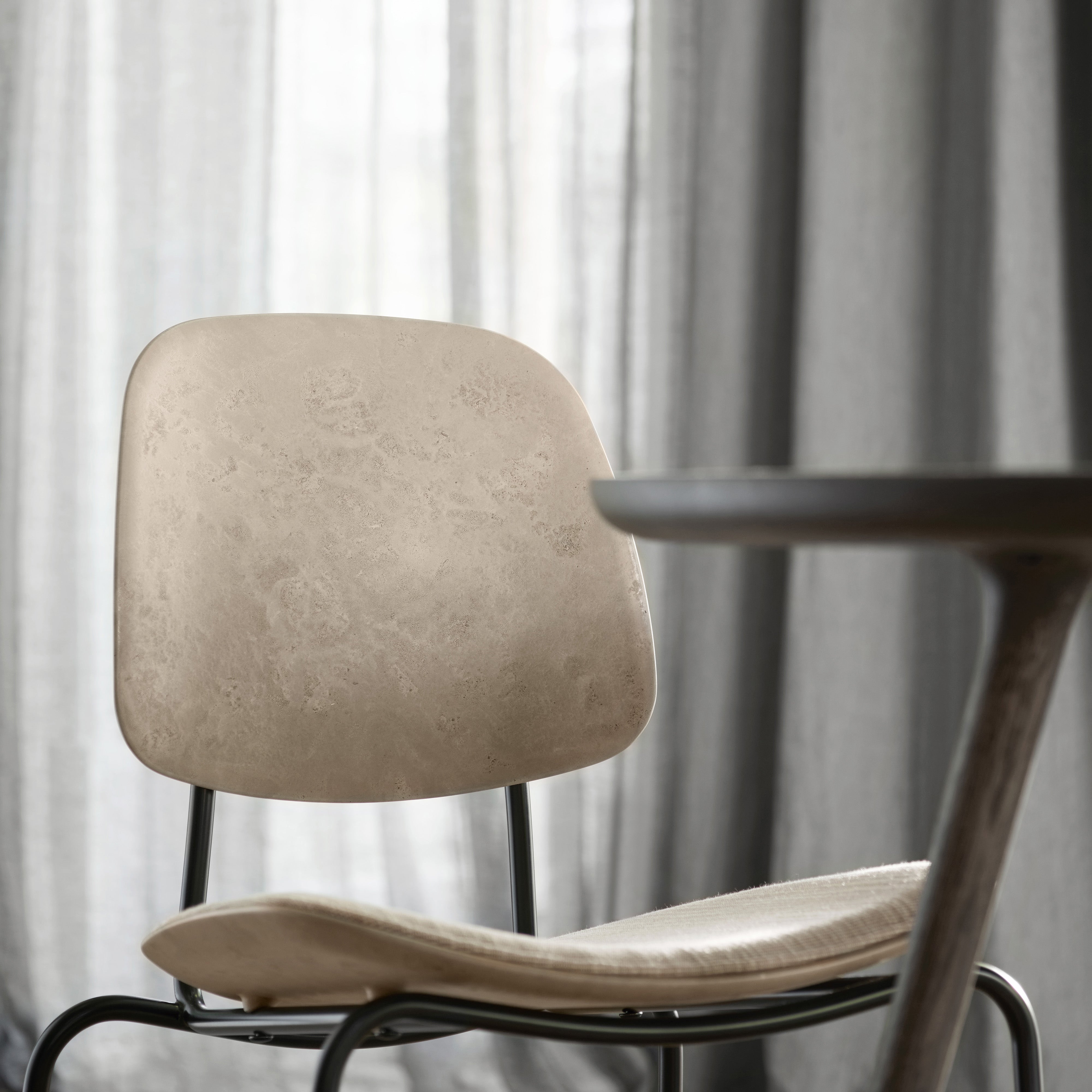 The Compound Dining Chair features a frame made from 20% recycled steel, supporting a seat and back crafted from Matek®—a proprietary material that blends coffee shell waste, wood waste, and industrial plastic waste. Designed by OEO Studio, the chair's minimalist structure offers comfort suitable for both private and public settings. It is available in various Matek® blends, with front or seat upholstery, and is stackable up to four chairs.