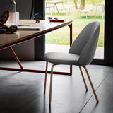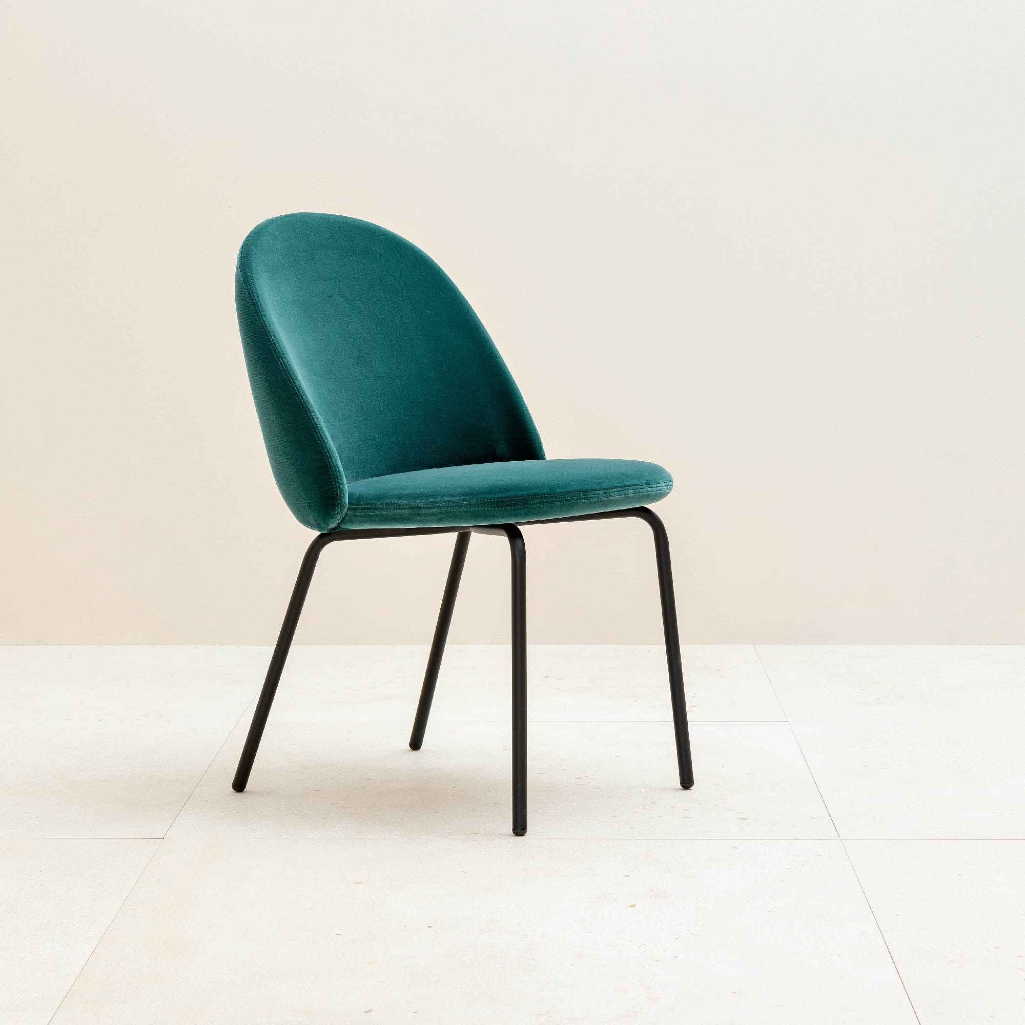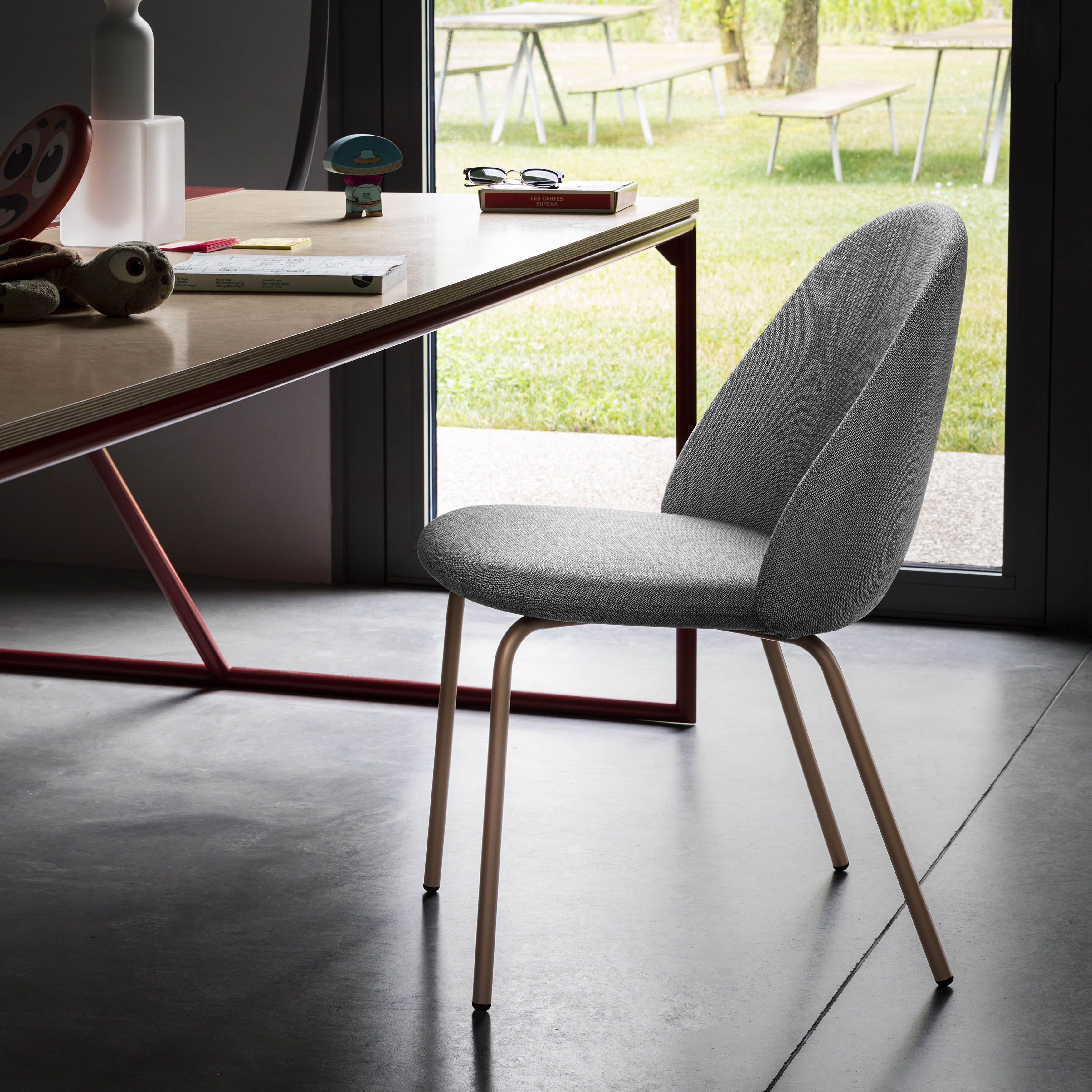 The prototypical Iola with its tubular metal legs is E-ggs designer Gionna Scarselli's rethinking of a modernist totem€”the shell chair. In his hands, the backrest is pulled forward at the sides in a welcoming gesture and the inner polyurethane form is completely sheathed in padded upholstery for complete ergomatic comfort. The metal base provides a crisp complement, in a selection of matte finishes or gleaming copper.