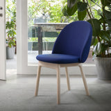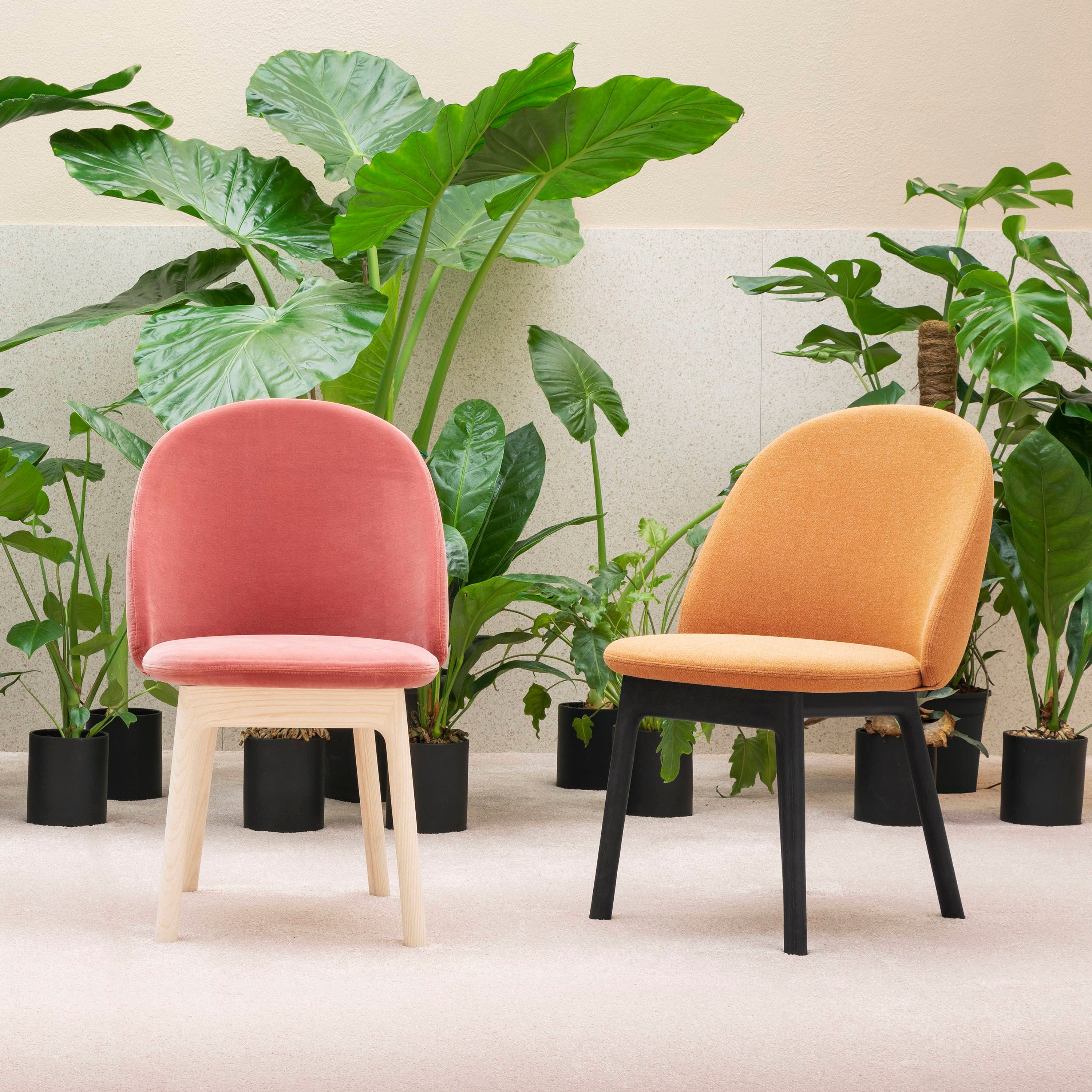 A tactile woodgrain base gives a warm demeanor to E-ggs designer Gionna Scarselli's rethinking of the classic shell side chair. Taking the iconic molded shape with its ergonomic properties intact, he enlarges the proportions and pulls the backrest forward at the sides in an embracing gesture. Finally, the designer sheathes the molded form in padded upholstery for a beckoning promise of comfort.