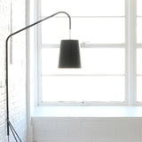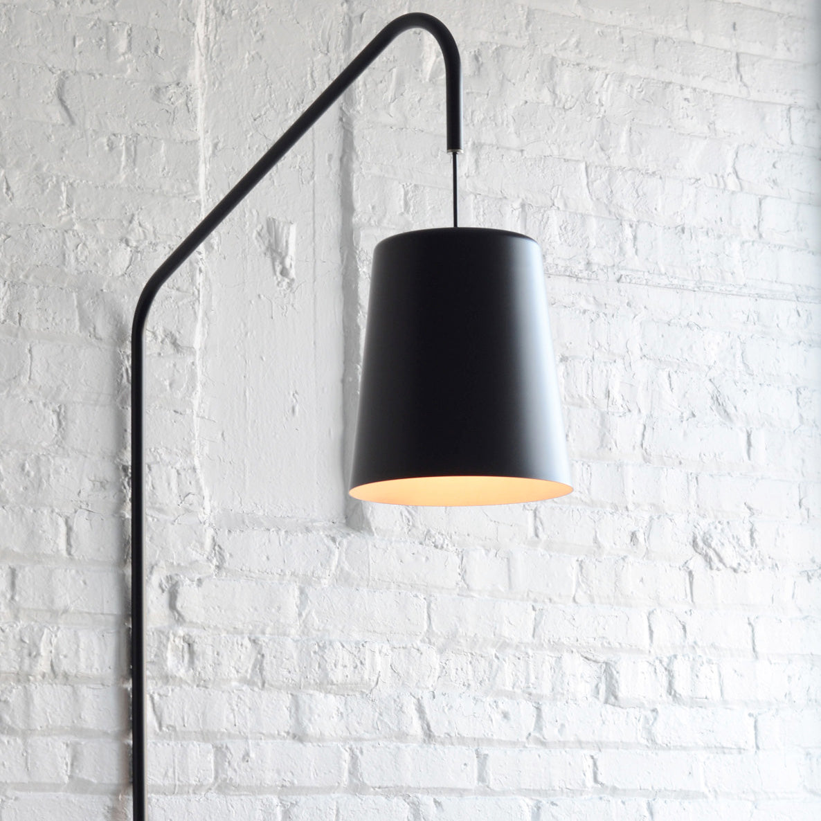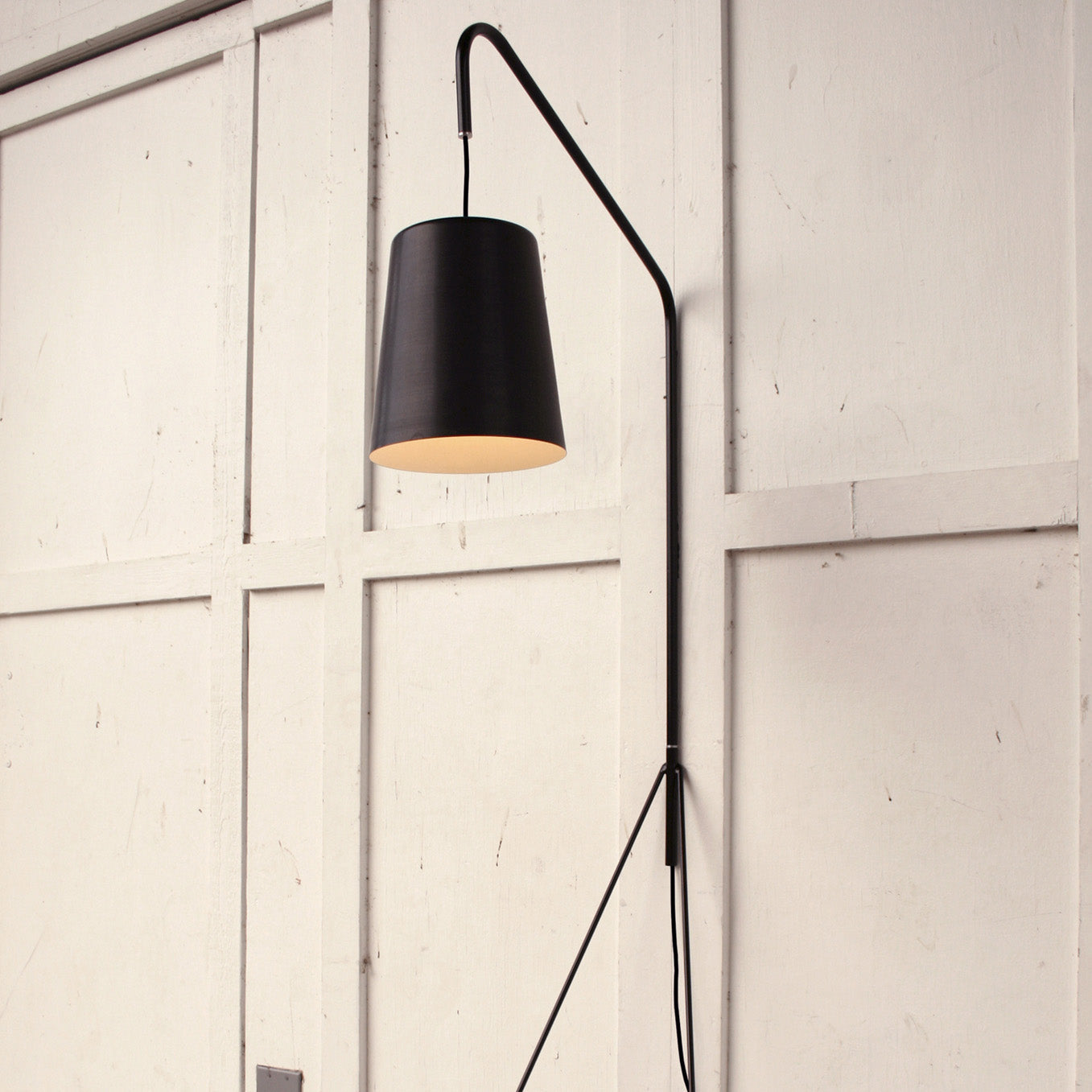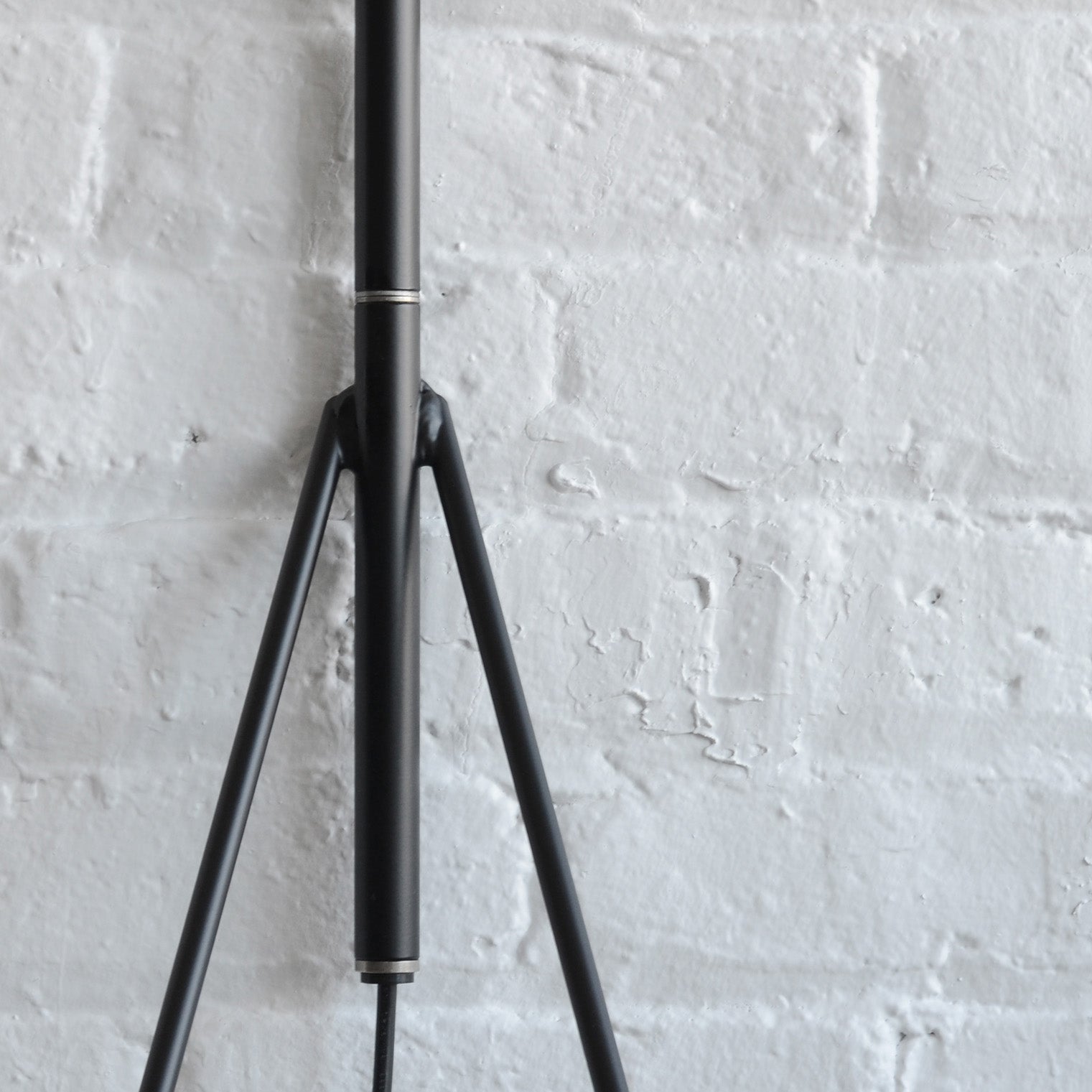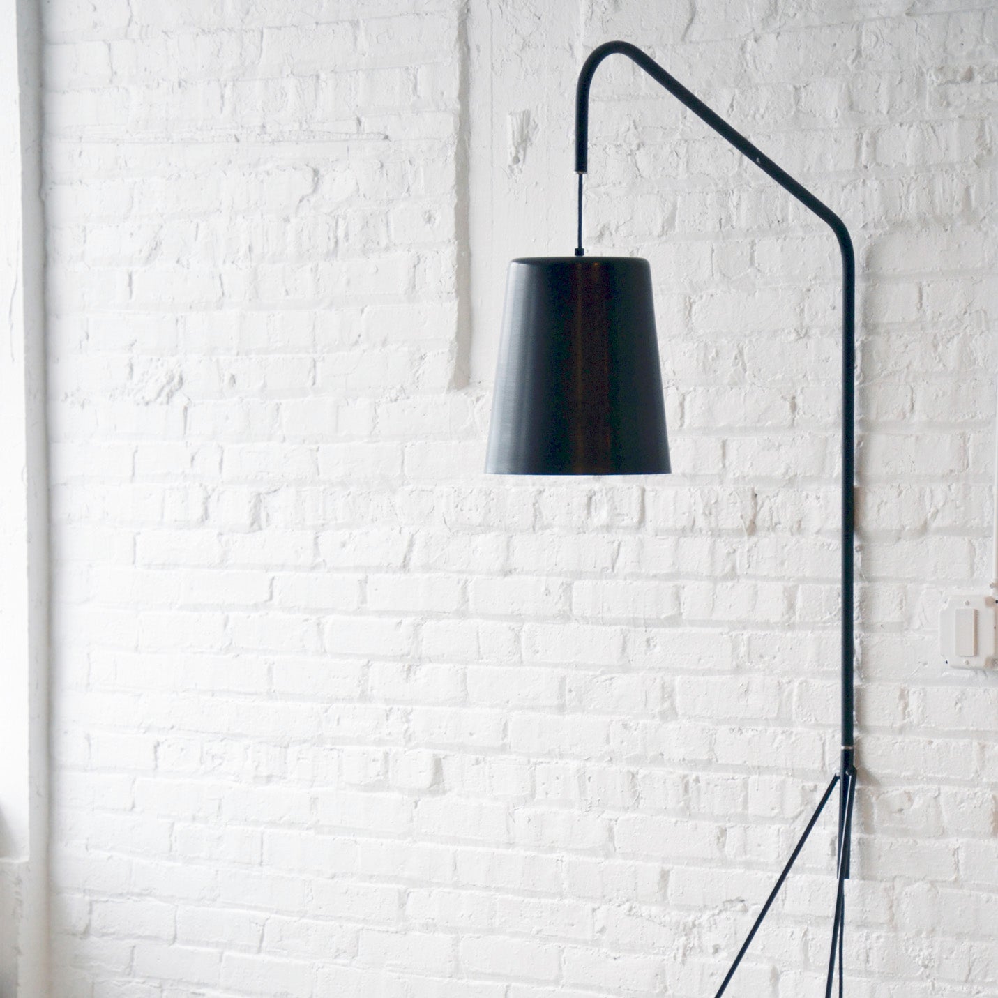 A triangulated steel base, attenuated aluminum spine and spun-steel shade keep Eileen balanced when leaning against a wall or in a corner. Misewell's machined stainless-steel fittings allow the LED-bulb lamp's neck to pivot smoothly, while creating the necessary friction for adjusting the shade's height. Finished in an allover black powder coat, with the base rubber-dipped for added grip.
