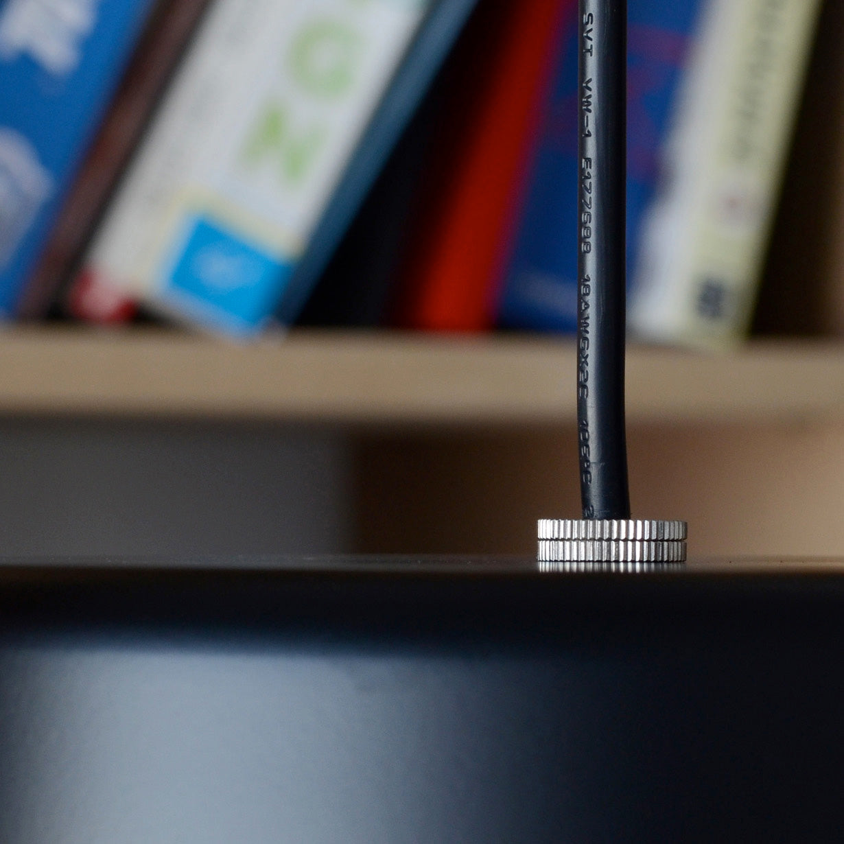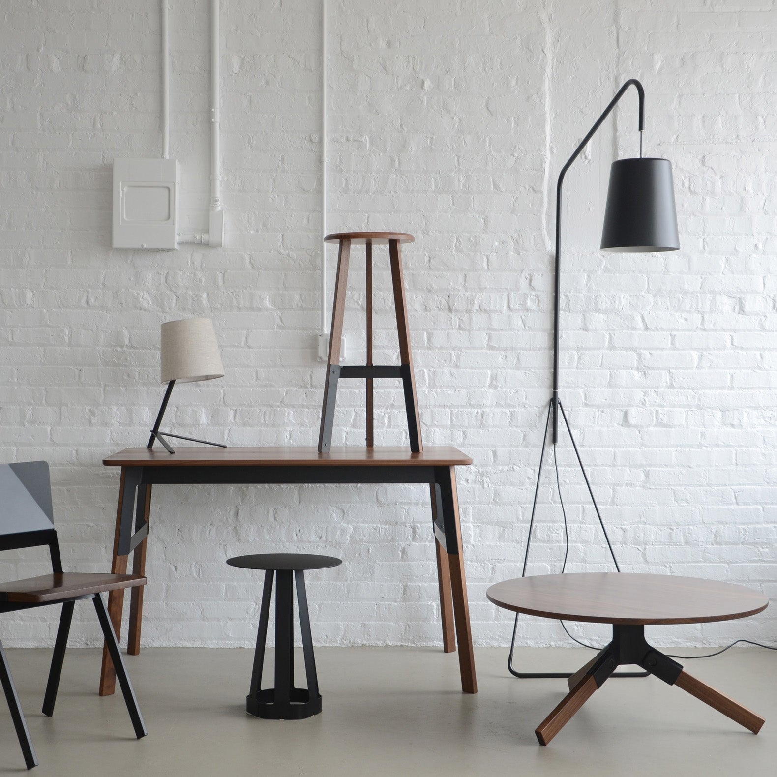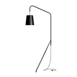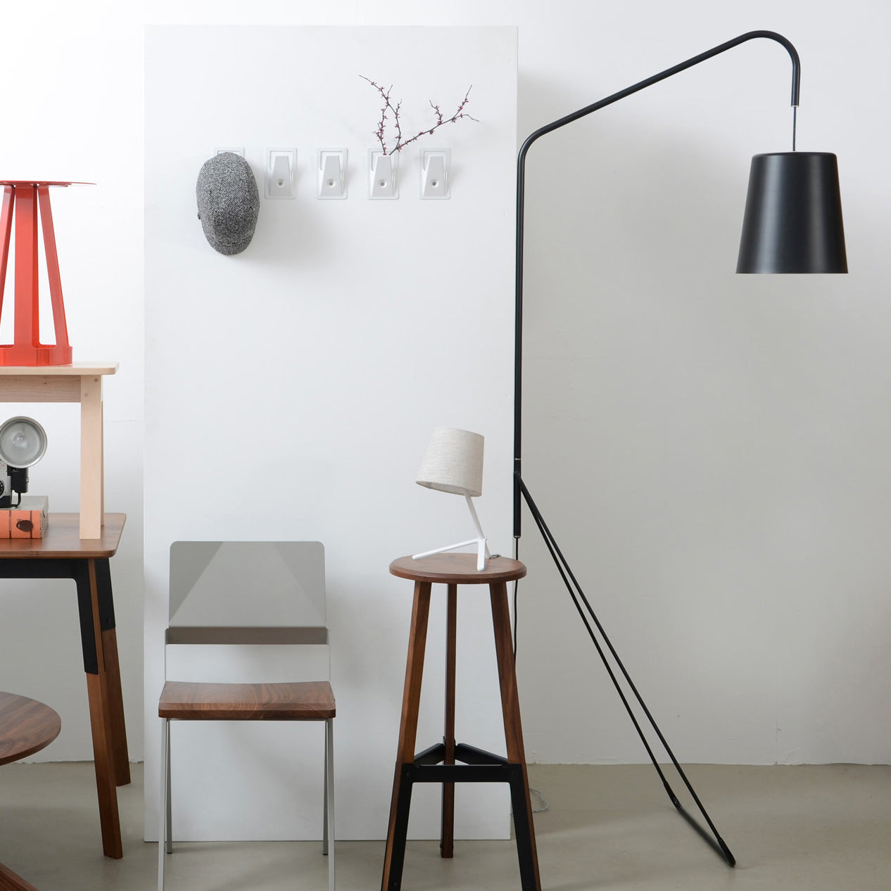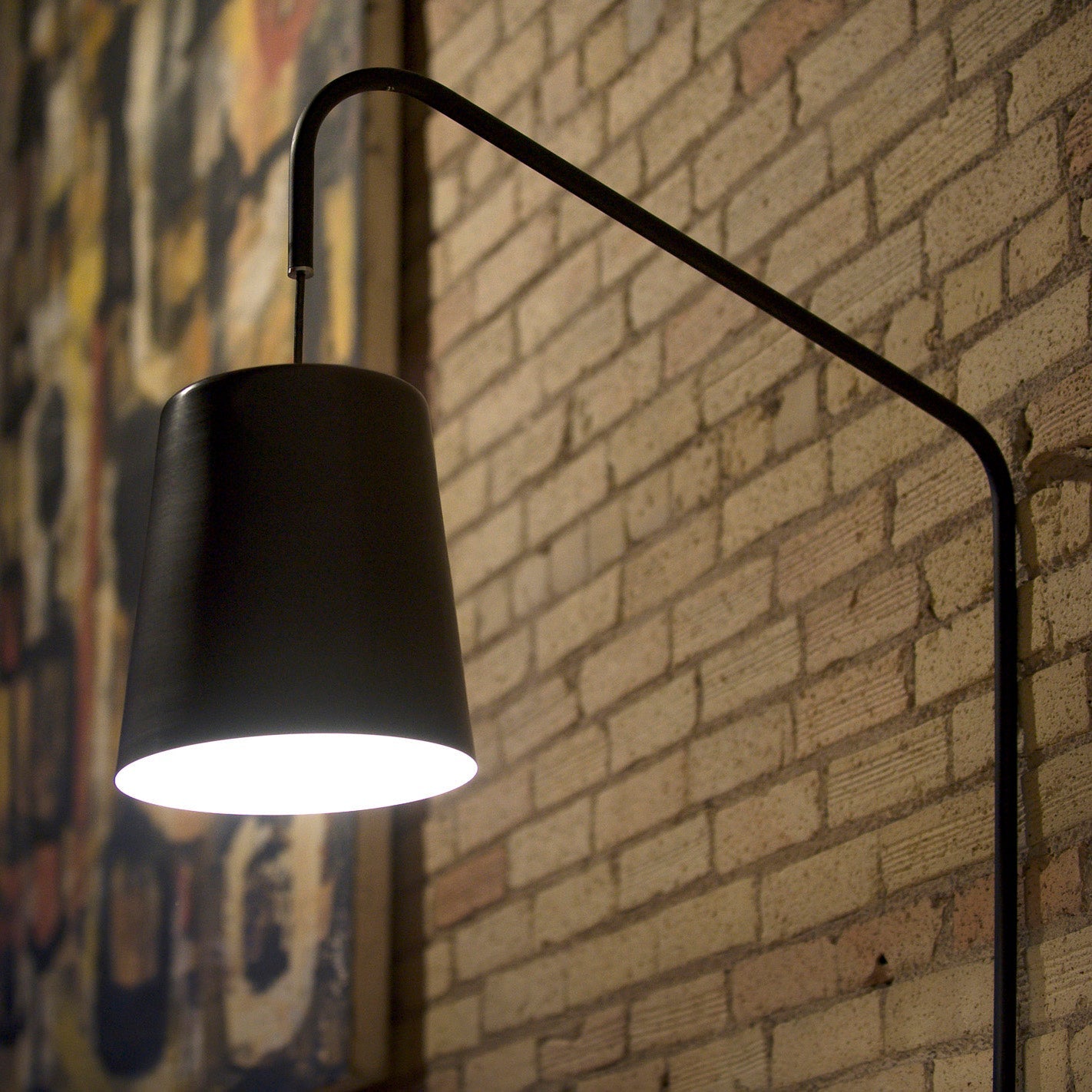A triangulated steel base, attenuated aluminum spine and spun-steel shade keep Eileen balanced when leaning against a wall or in a corner. Misewell's machined stainless-steel fittings allow the LED-bulb lamp's neck to pivot smoothly, while creating the necessary friction for adjusting the shade's height. Finished in an allover black powder coat, with the base rubber-dipped for added grip.