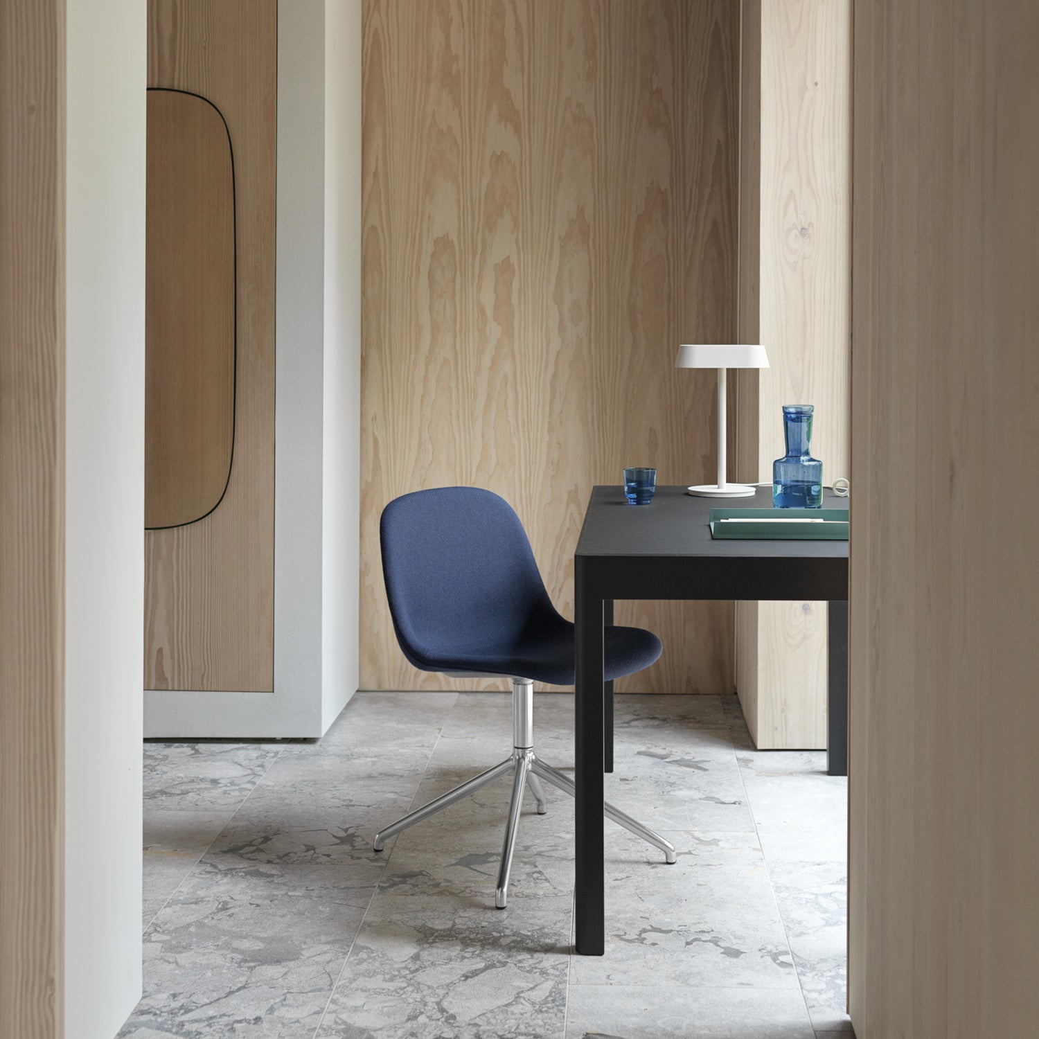 Adapted with a swivel base and automatic seat-position return, design duo Iskos-Berlin offer a custom-upholstered version of their Fiber side chair. With quality fabric and leather options to suit any workspace, the molded seating adds another layer of comfort along with its strikingly inviting ergonomic curves. The accompanying 4-star metal swivel base also bespeaks finesse in a range of powder-coated colors or gleaming polished aluminum.