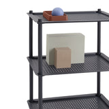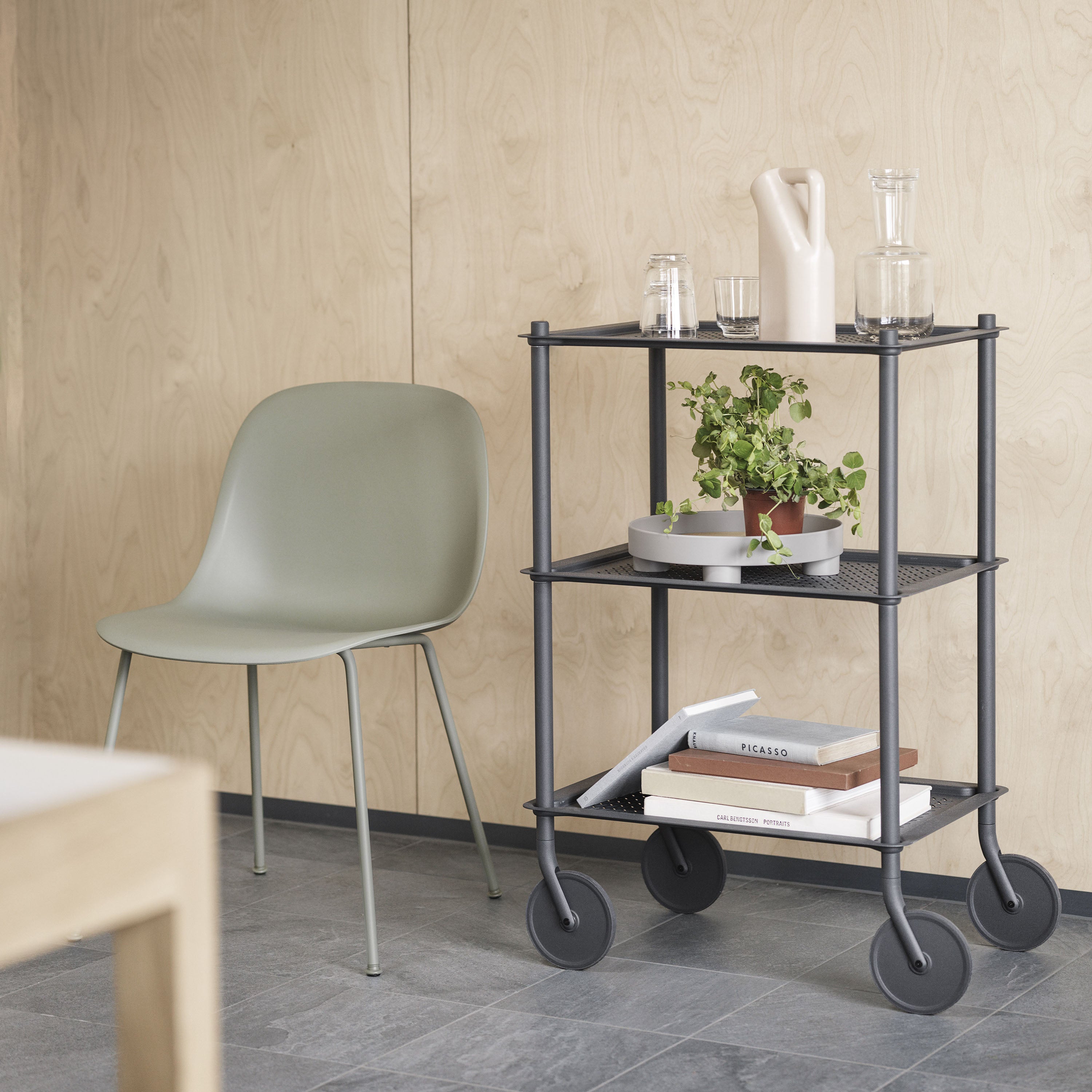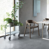 Flow shifts the elements of the usual rolling trolley with its slim frame, embossed metal tray shelves and oversized wheels. Paris’ Normal Studio adds a monochrome look for its modern storage piece suited to the home, workplace or hospitality setting. With movable room-to-room flexibility, it comes in 2 or 3 shelf versions in a choice of powder-coated hues.