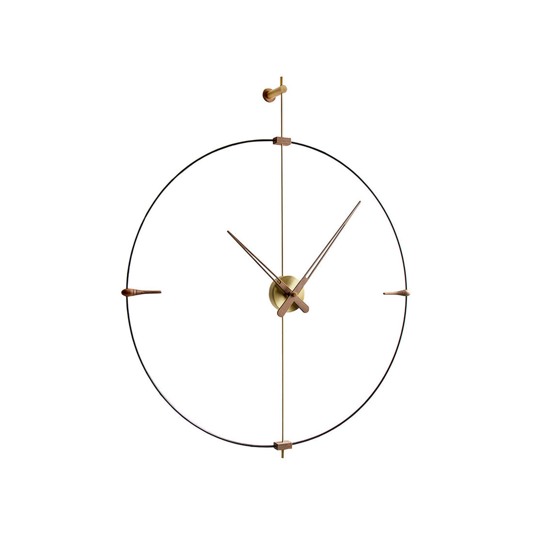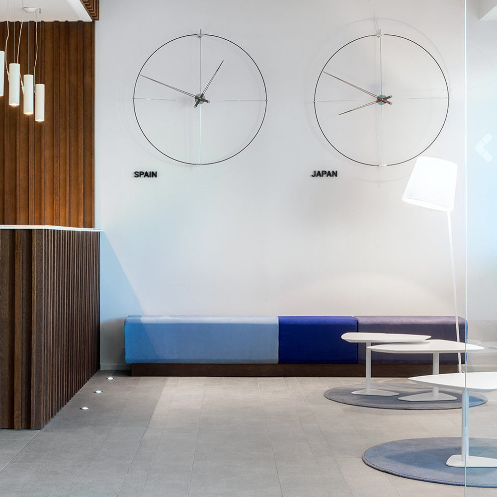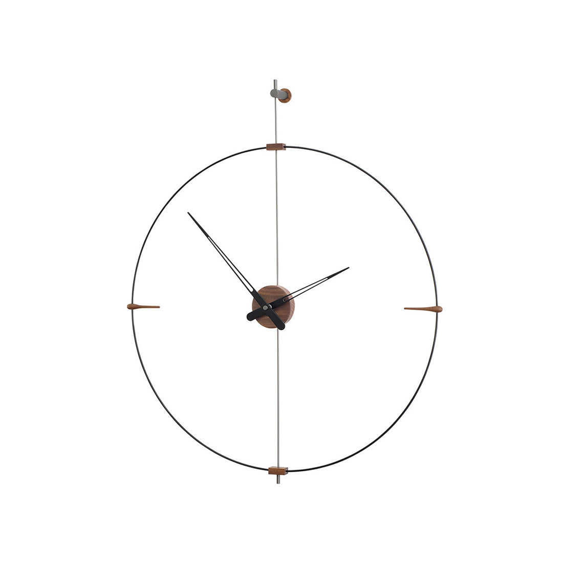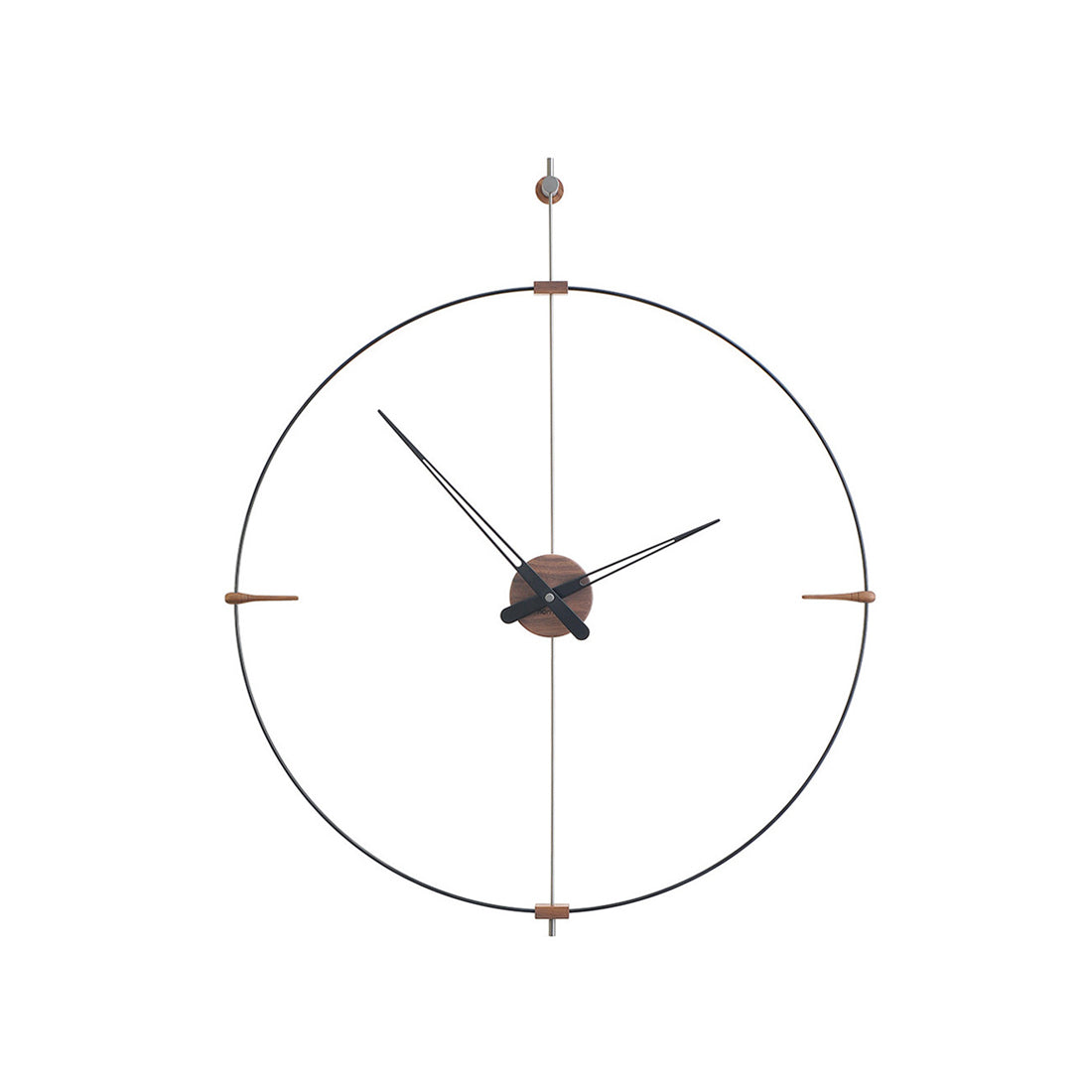 Bilbao's suspended ring enhances a minimalist vibe via Nomon’s crisp styling in a choice of black or white with needle hands to match or contrast — or choose an accent of gorgeous genuine walnut. Available in regular and mini versions, the handcrafted wall clock's metal support and center box come in complementary chrome or brass finishes. Battery-powered and made in Spain with a precision German quartz works, the statement clock is easily installed to elevate any space.