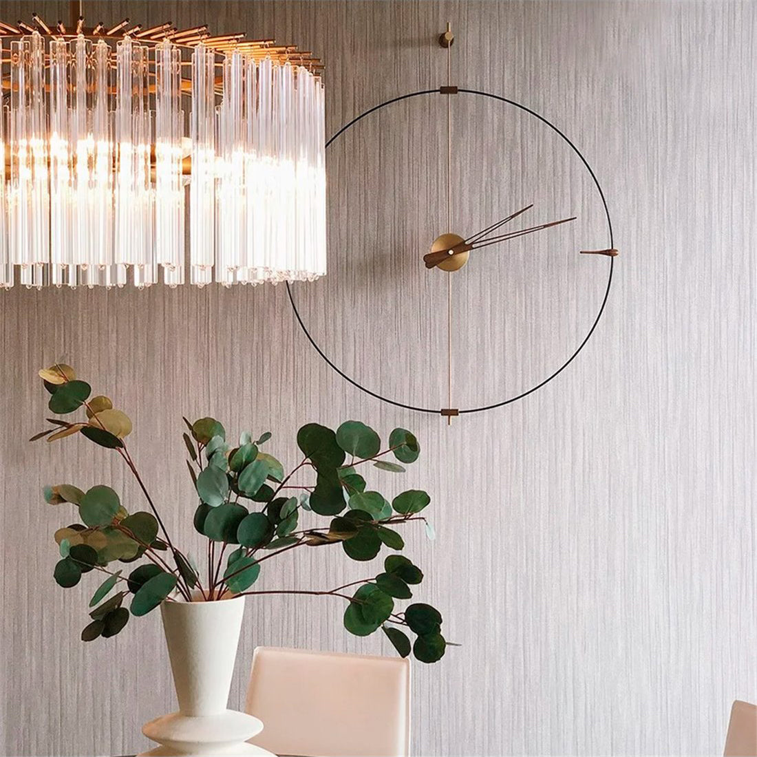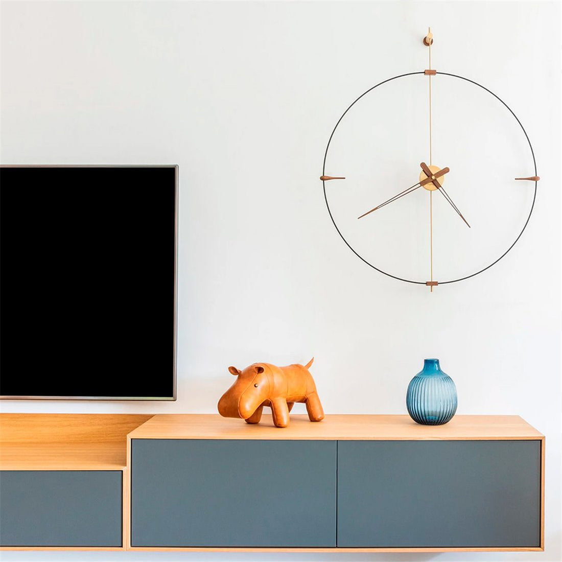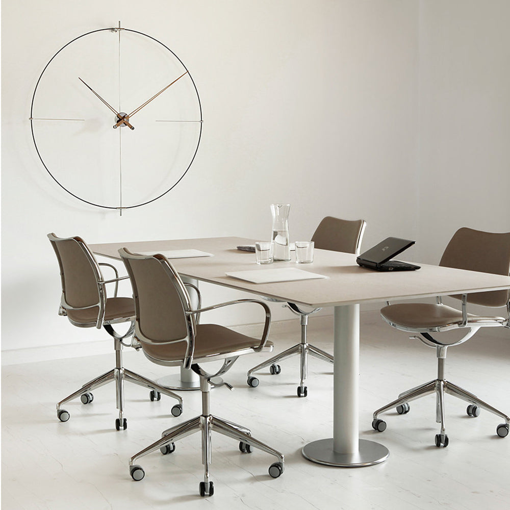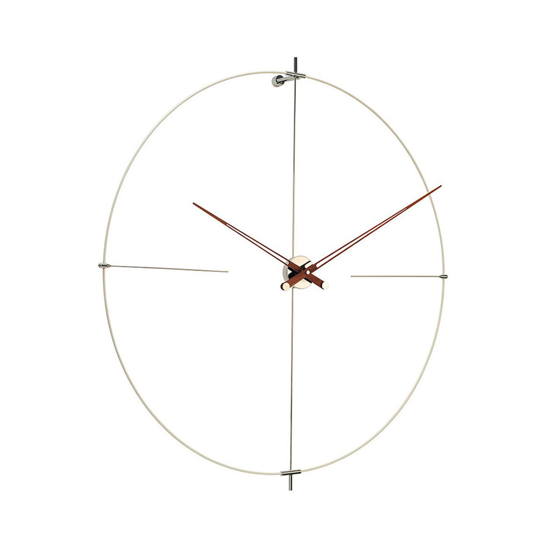 Bilbao's suspended ring enhances a minimalist vibe via Nomon’s crisp styling in a choice of black or white with needle hands to match or contrast — or choose an accent of gorgeous genuine walnut. Available in regular and mini versions, the handcrafted wall clock's metal support and center box come in complementary chrome or brass finishes. Battery-powered and made in Spain with a precision German quartz works, the statement clock is easily installed to elevate any space.