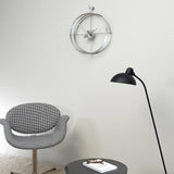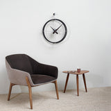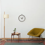 Nomon’s sleight of hand in juxtaposing luxe elements enlivens 2 Puntos, encircled by double rings with clock hands in a contrasting material. Discreetly suspended on a slim rod formation, the open face reveals the wall behind and lends its own presence to a room while offering precision timekeeping via its German quartz movement.