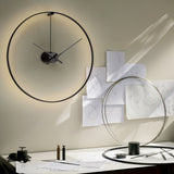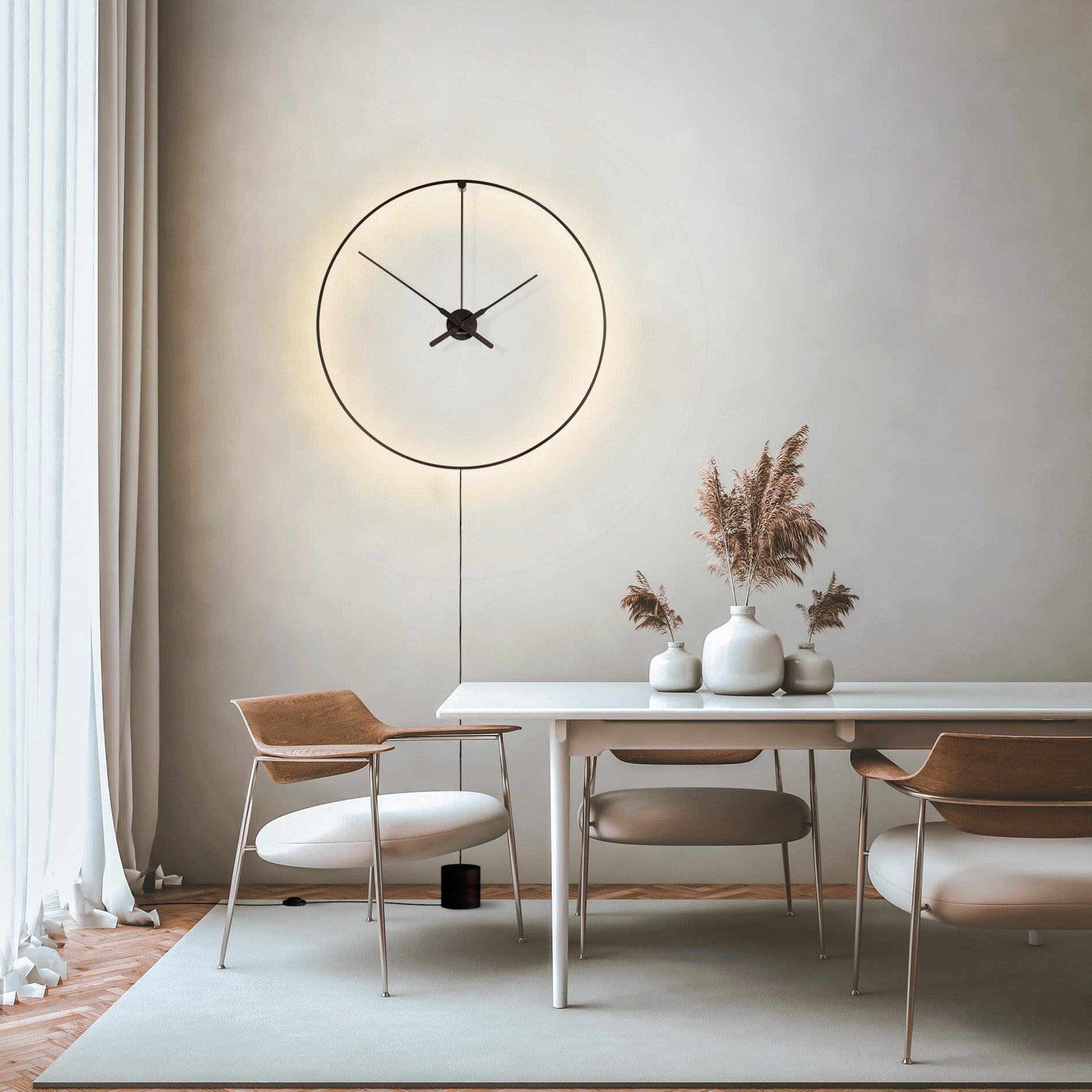 The Ombra Wall Clock integrates a sleek black anodized aluminum ring with an LED lighting system, casting a warm, ambient glow that enhances any space. Available in both plug-in and hardwired versions to accommodate various installation preferences.