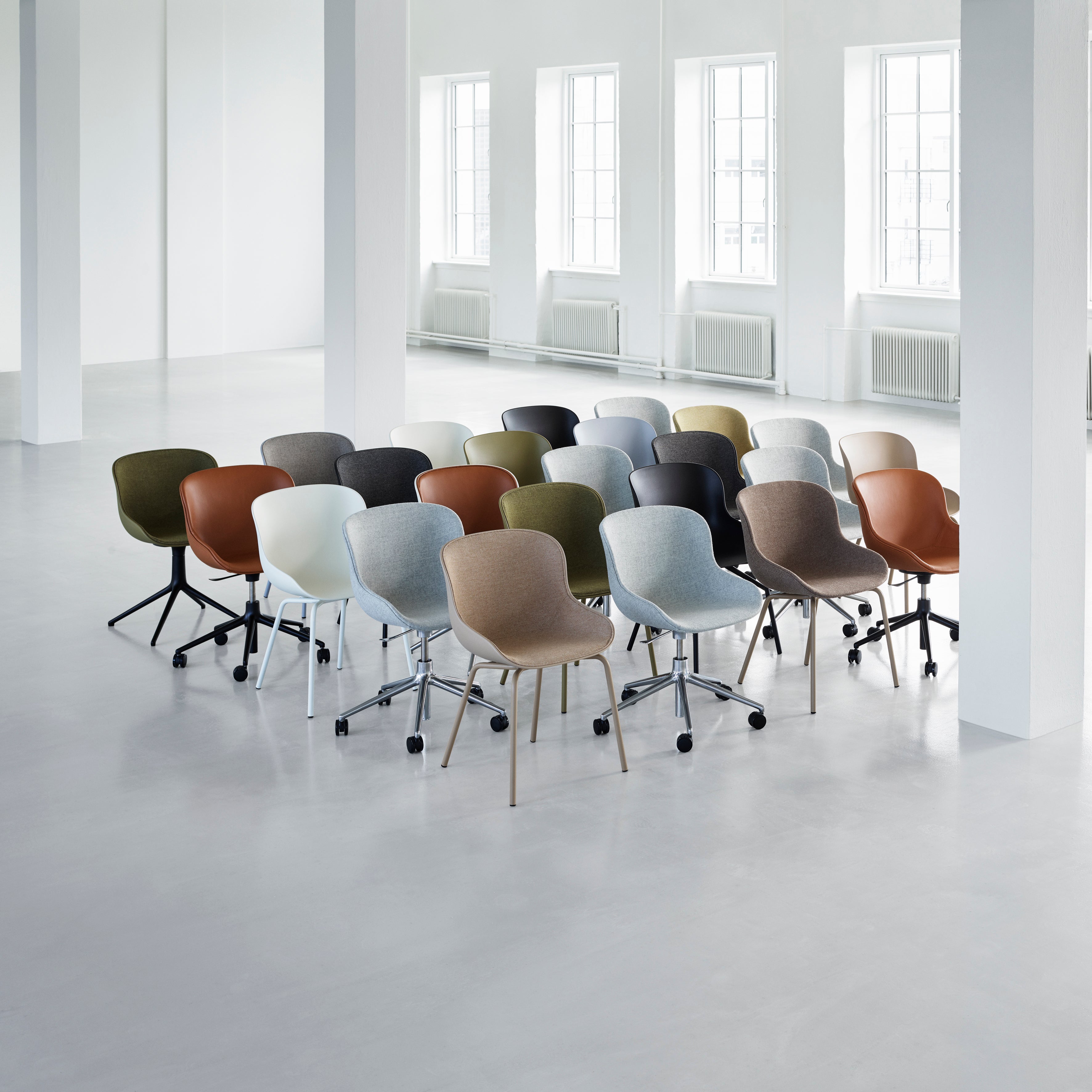 With Hyg, designer Simon Legald offers the option of front upholstery for customizing the chair's signature organic curves. Inspired by the contented Danish notion of hygge, the broad seat accommodates varied postures while the high sides glancingly shield off its surroundings. The encircling contours can be sheathed in a range of premium textiles or leather to provide an apt textural contrast to the polypropylene form and powder-coated steel legs.
