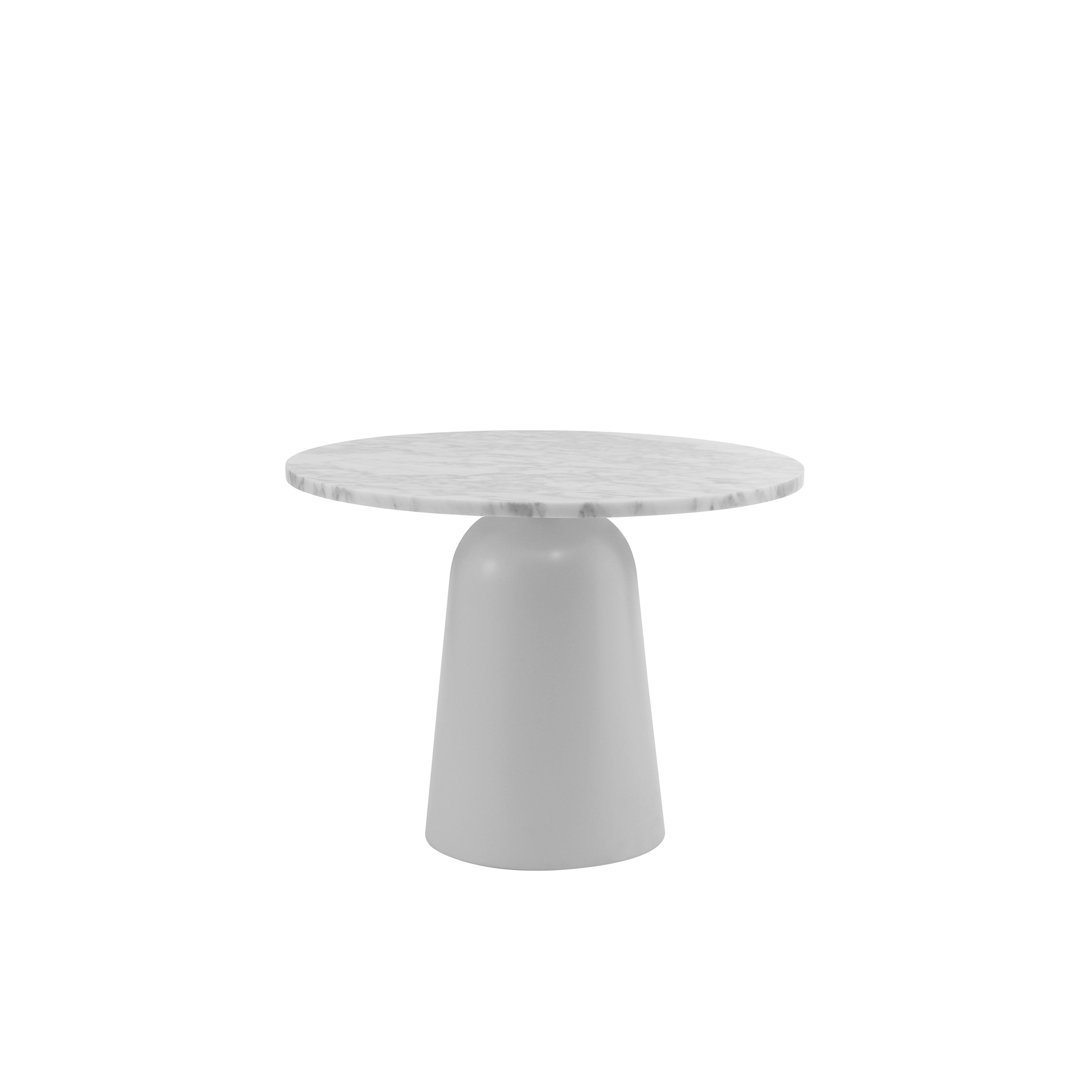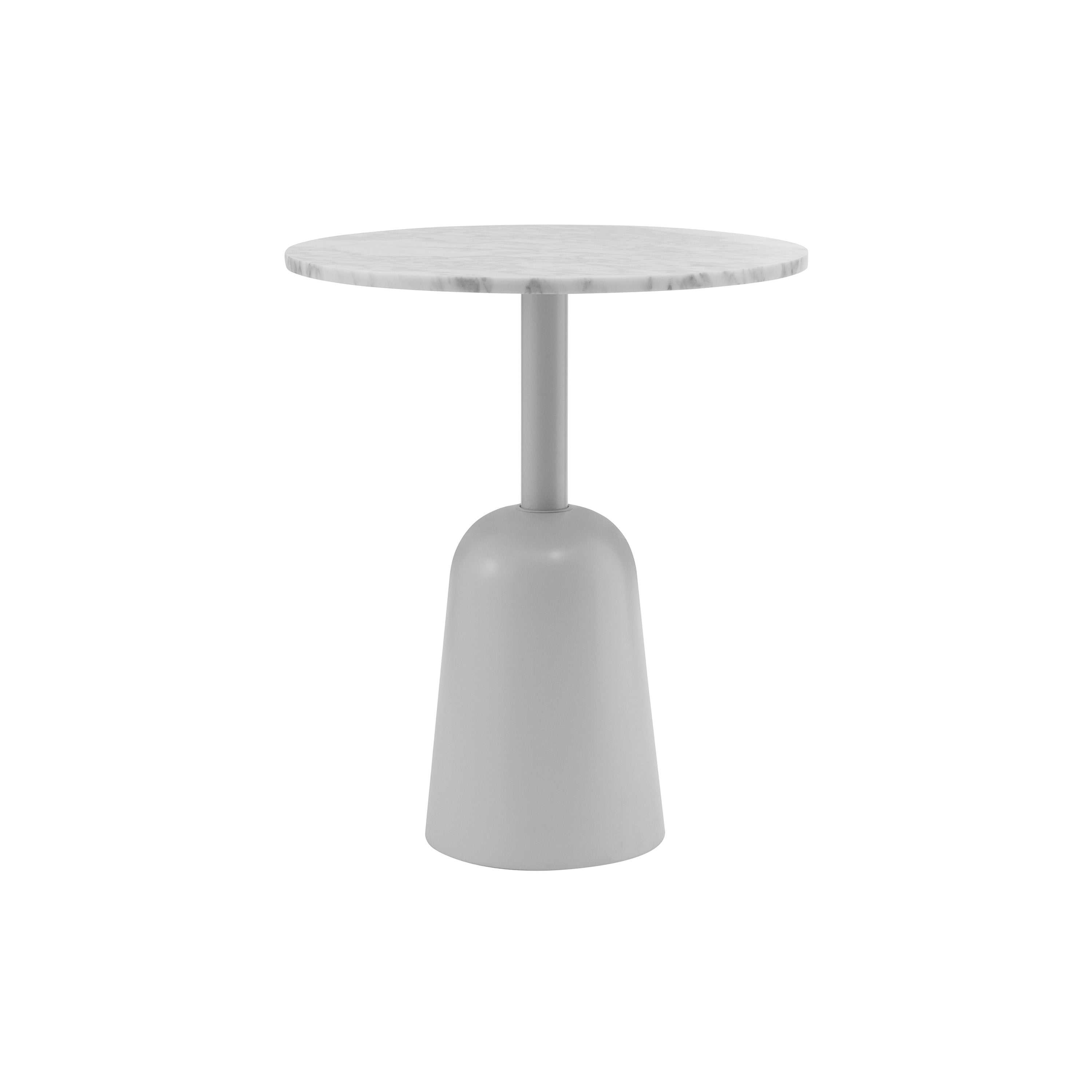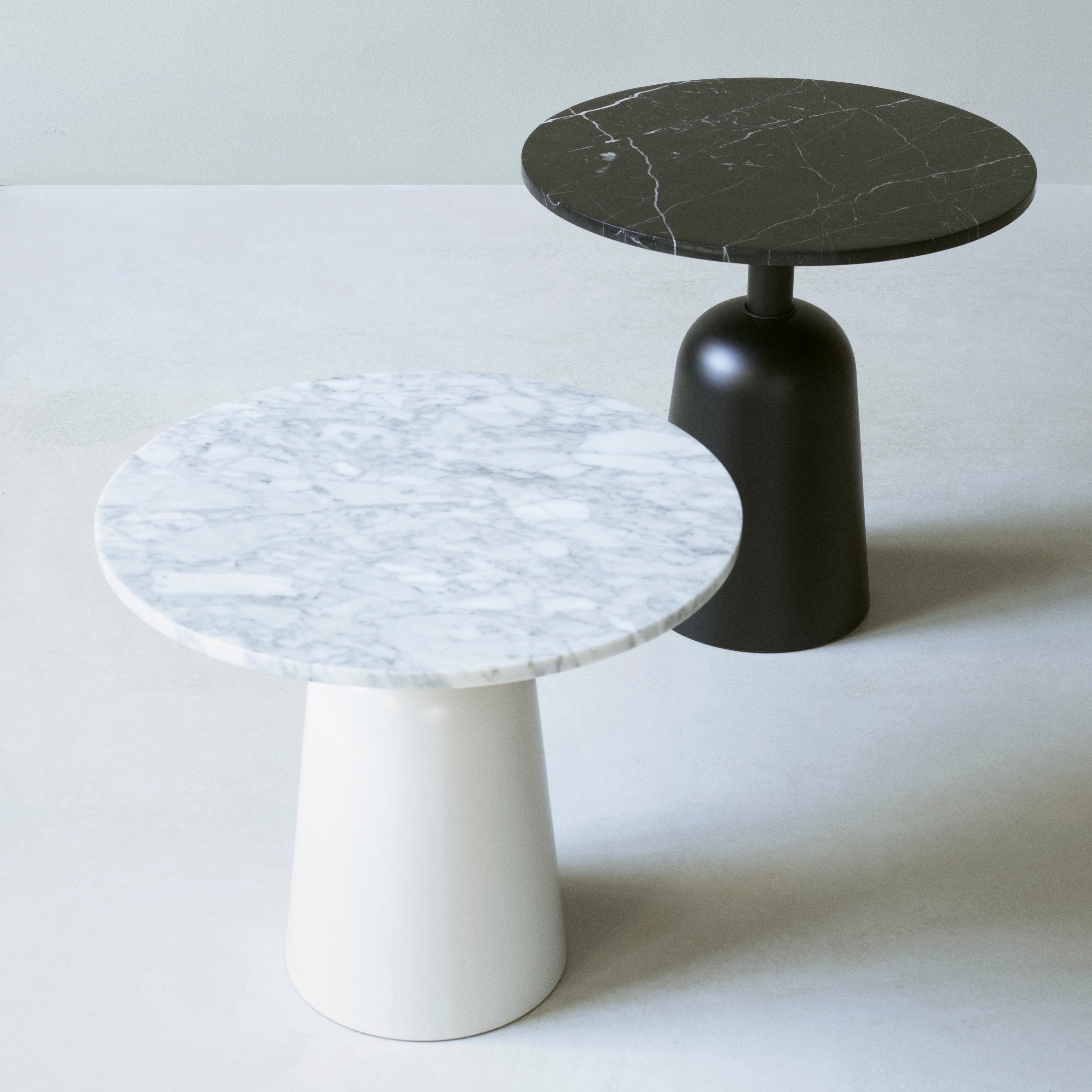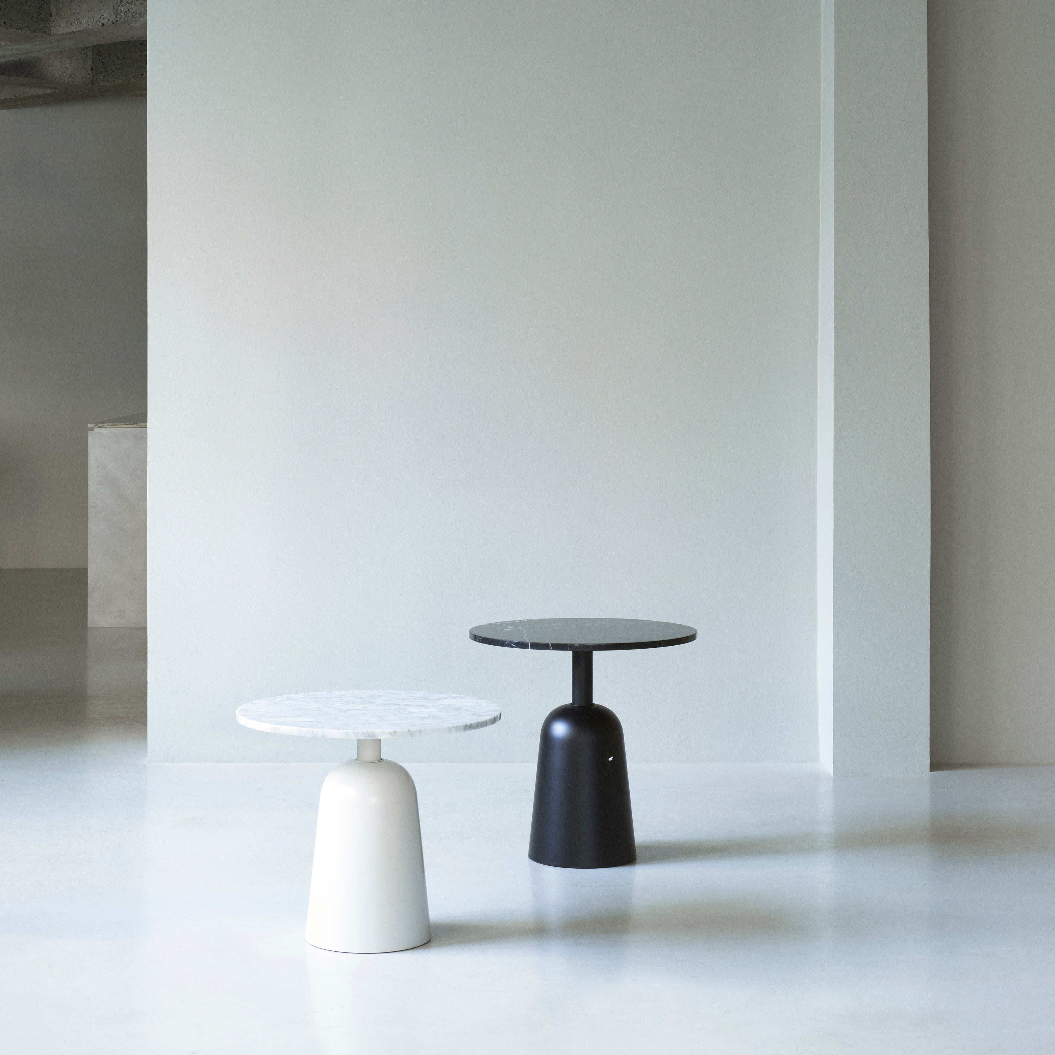 Designer Simon Legald extends his singular twist on an occasional table in a version with the luxe addition of an embedded black or white marble top to complement its spun-steel base in the same color. Turn takes its name from its clever functionality that gently raises the round surface with just an easy spin, nimbly rotating from cocktail to side table height.