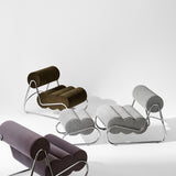 The Fave Footstool features a sculptural silhouette with soft, wave-like cushioning that invites relaxed seating. Built on a sturdy frame of solid wood and plywood wrapped in cut foam, it sits atop a streamlined steel base offered in mirror chrome or black powder-coated finishes. The footstool is upholstered in a selection of textured fabrics and leathers, such as bouclé and full-grain leather, allowing for varied tactile and visual appeal.