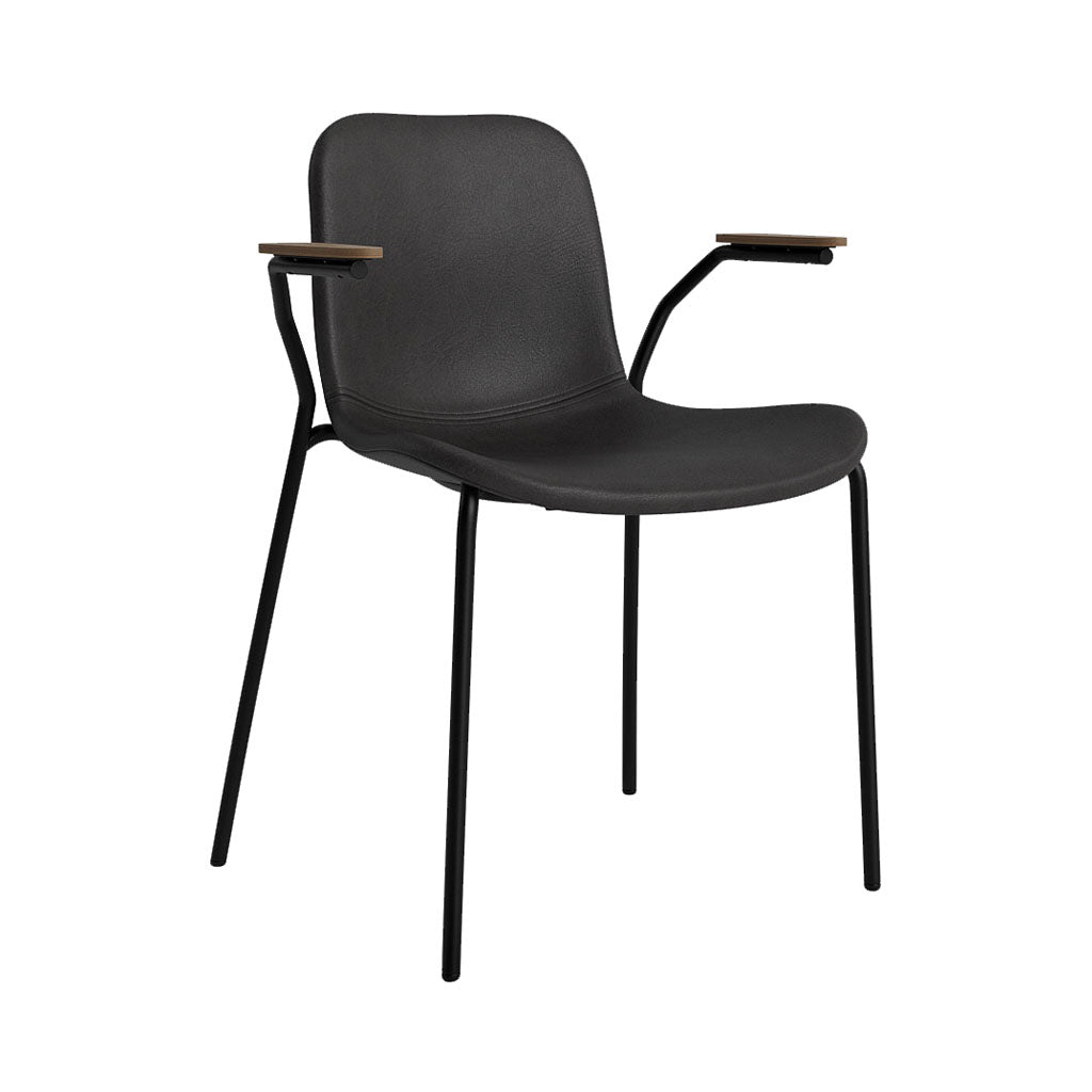 The Langue Chair stands out with its distinctively curved seat, modeled after the shape of a tongue. It emphasizes a flowing, organic silhouette that is designed to follow the bodys shape. This organic shape starts wide at the front, offering ample seating space, and tapers as it moves toward the back, almost hugging the body for support. The back of the chair curves gently to cradle the spine, enhancing comfort during longer periods of use. Available with a steel base in black and armrests in 4 oak finishes. Upholstered in a range of high performance fabric and leather for even more added comfort.