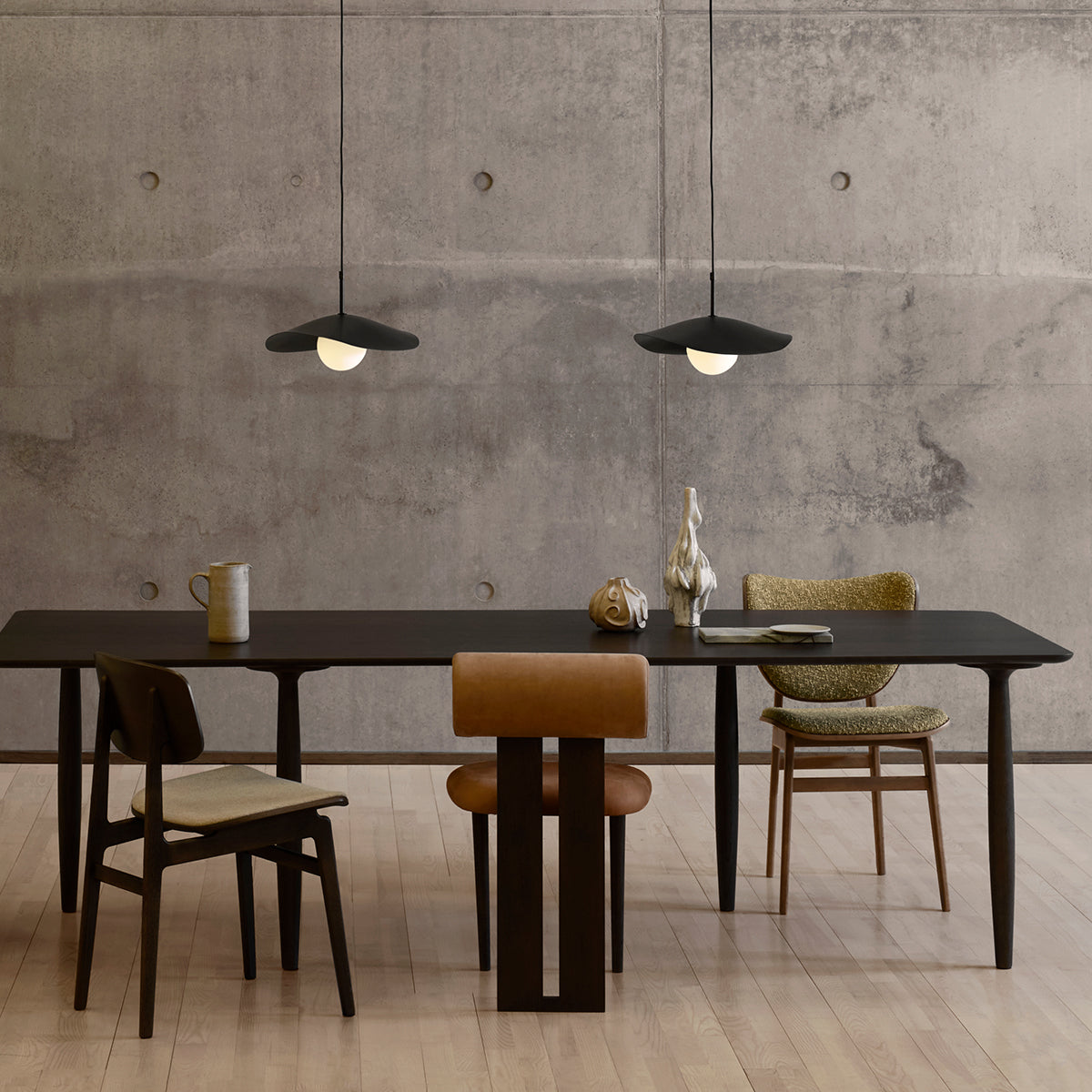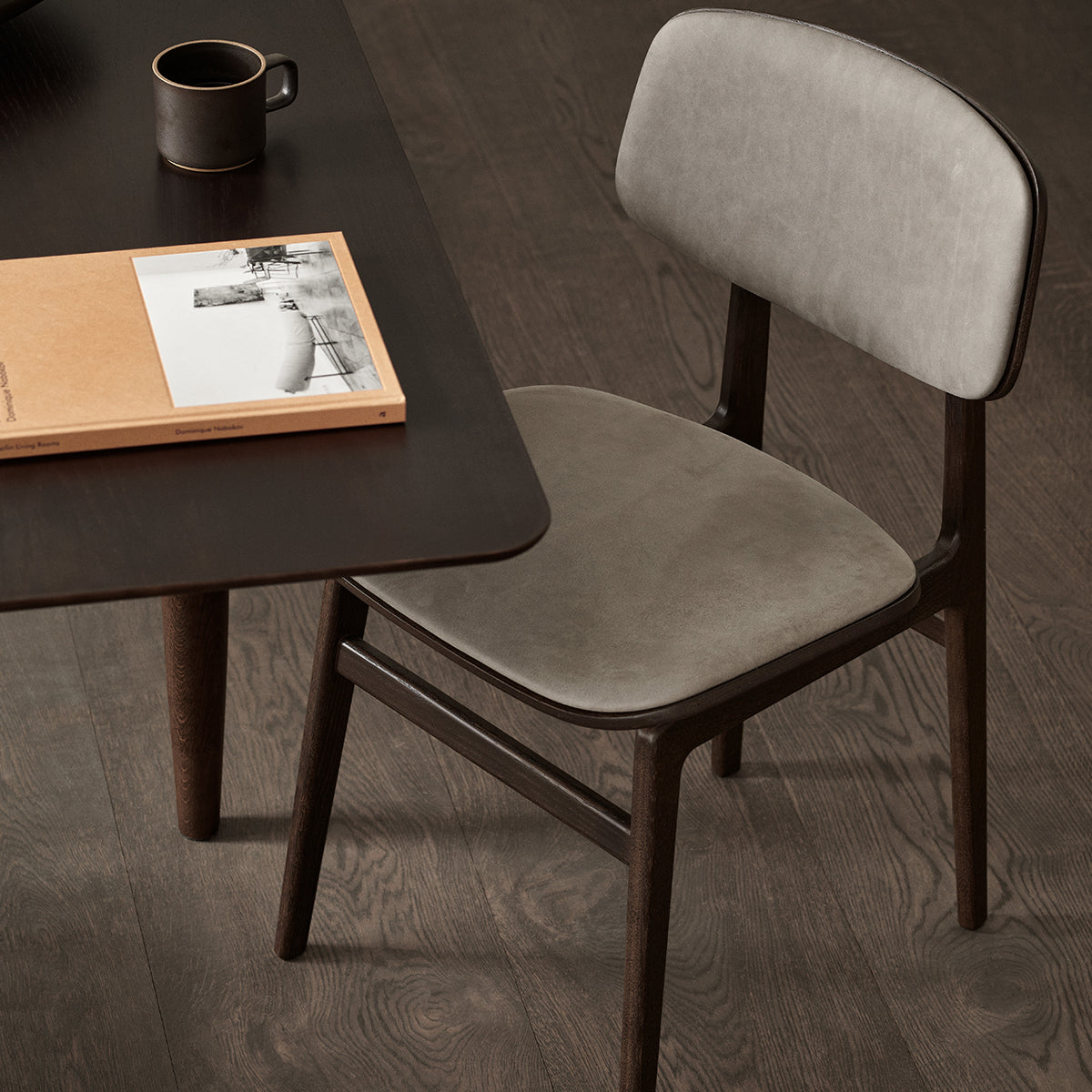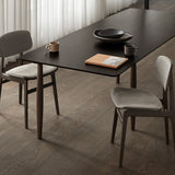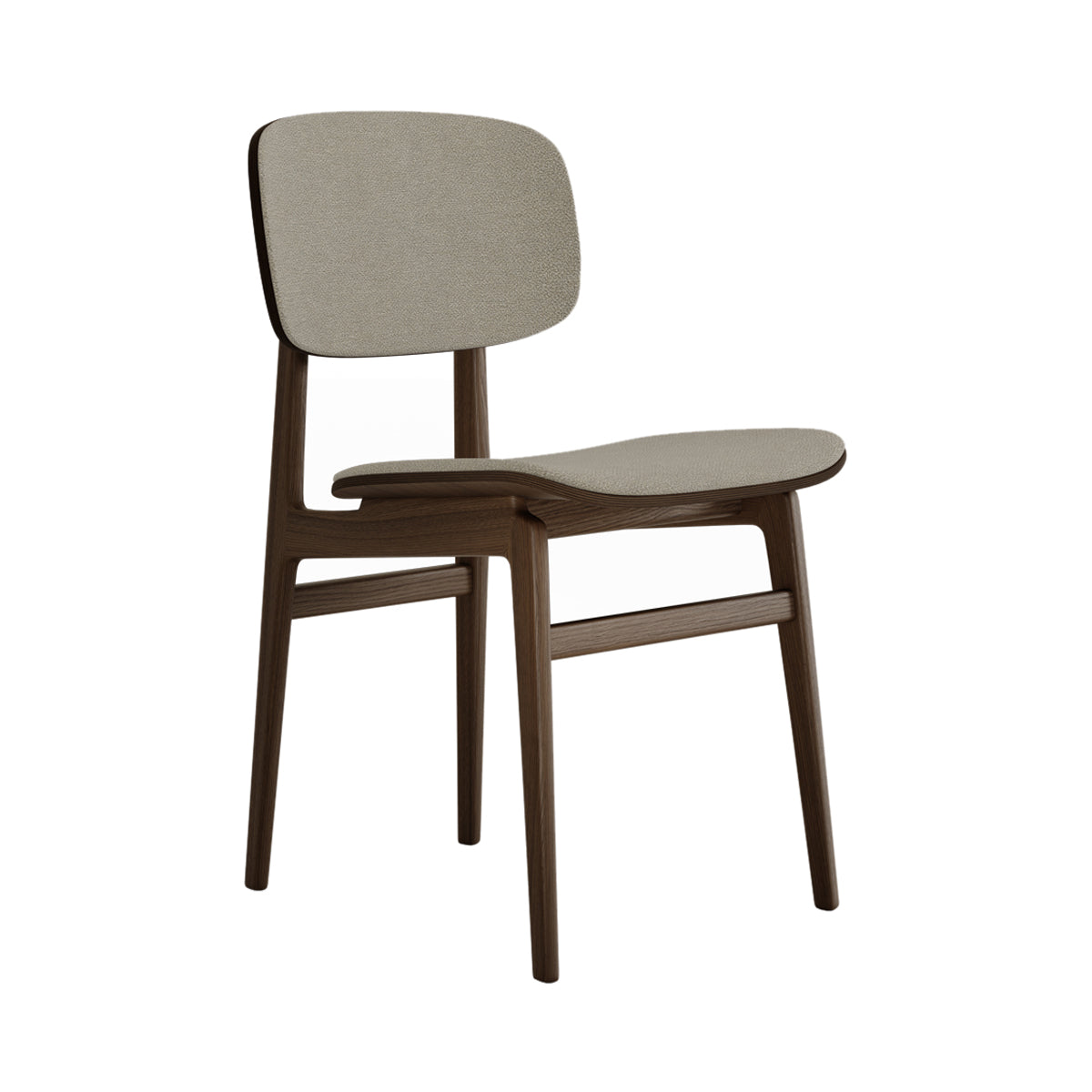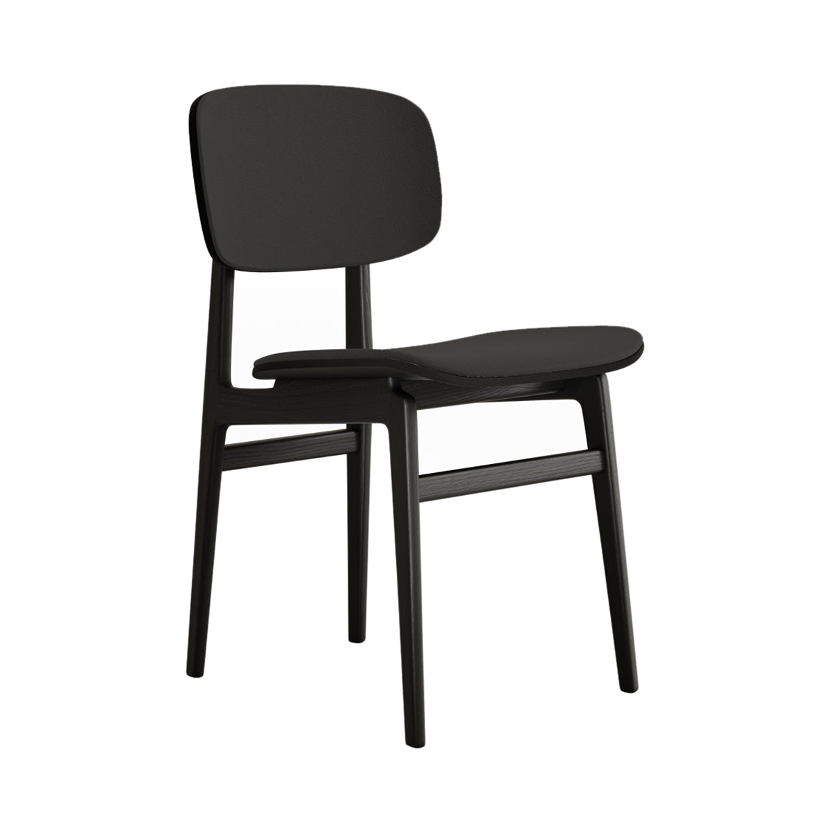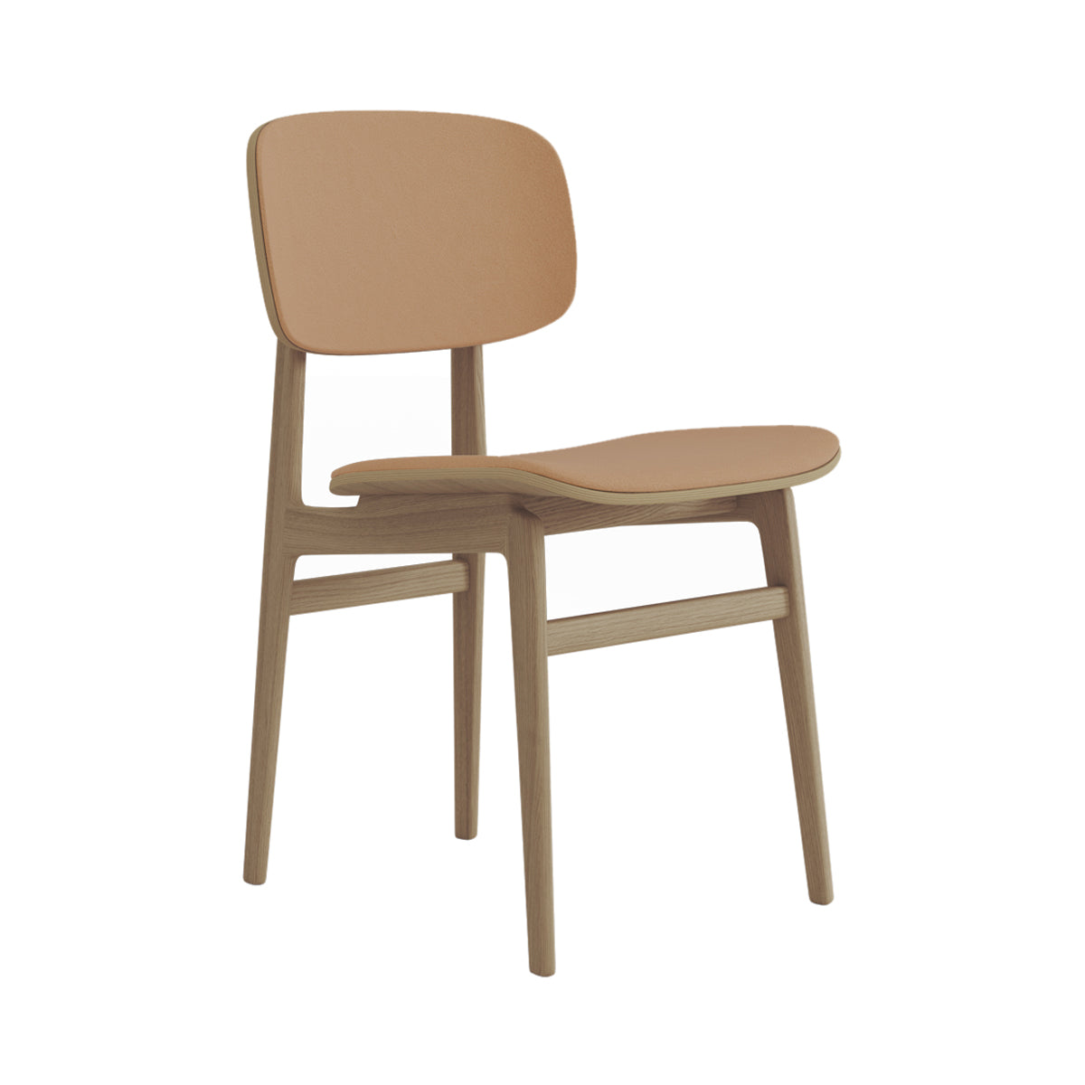 The NY11 Chair, designed by Rune Krøjgaard and Knut Bendik Humlevik, is inspired by mid-century Danish school chairs. Its frame is made from FSC-certified oak, with elegantly curved, laminated oak veneer forming the backrest and seat. The natural wood grain is left exposed, highlighting the craftsmanship and giving the chair a warm, organic look. This front upholstered version of the NY11 includes padded seat and backrest upholstery, which adds softness to its simple, sturdy form.