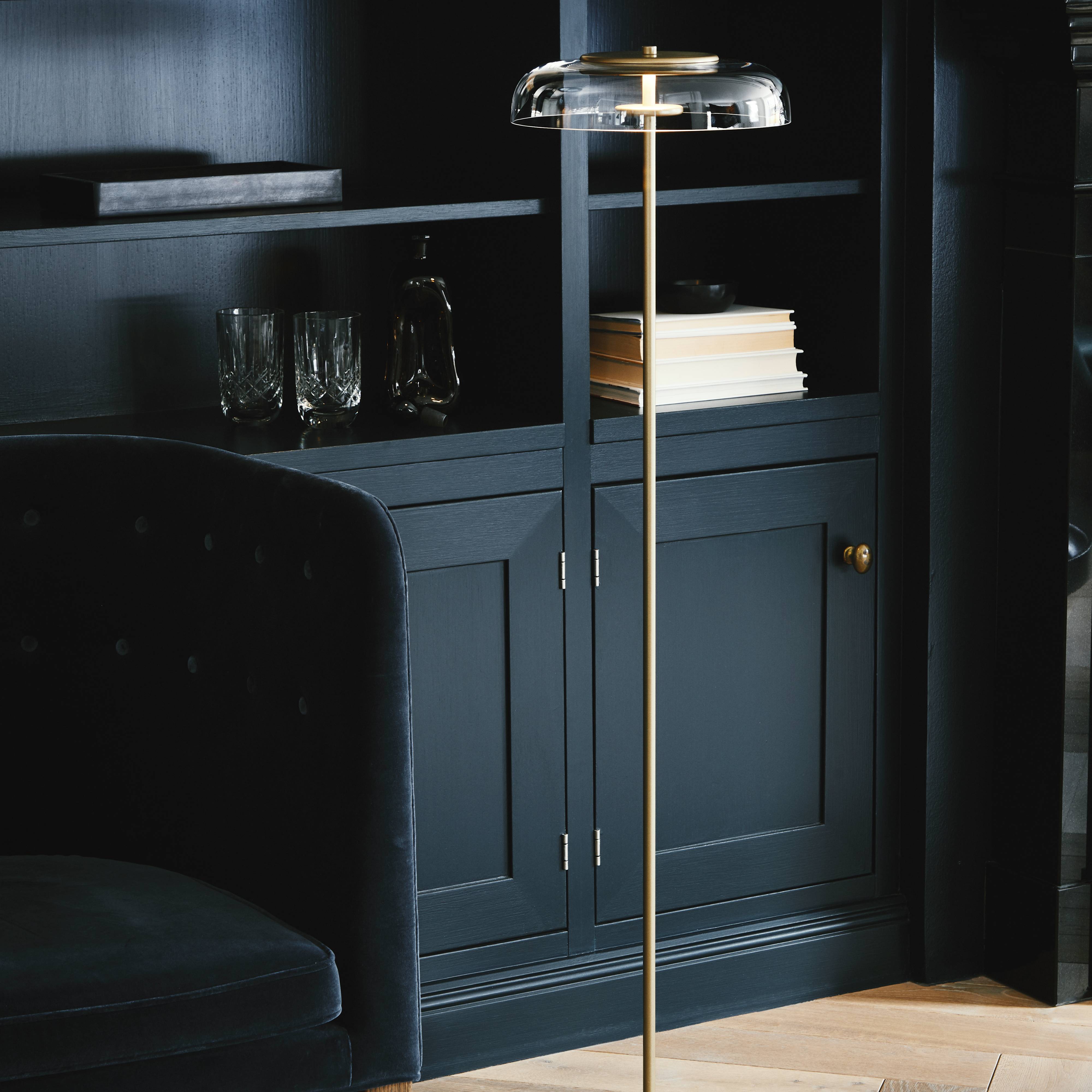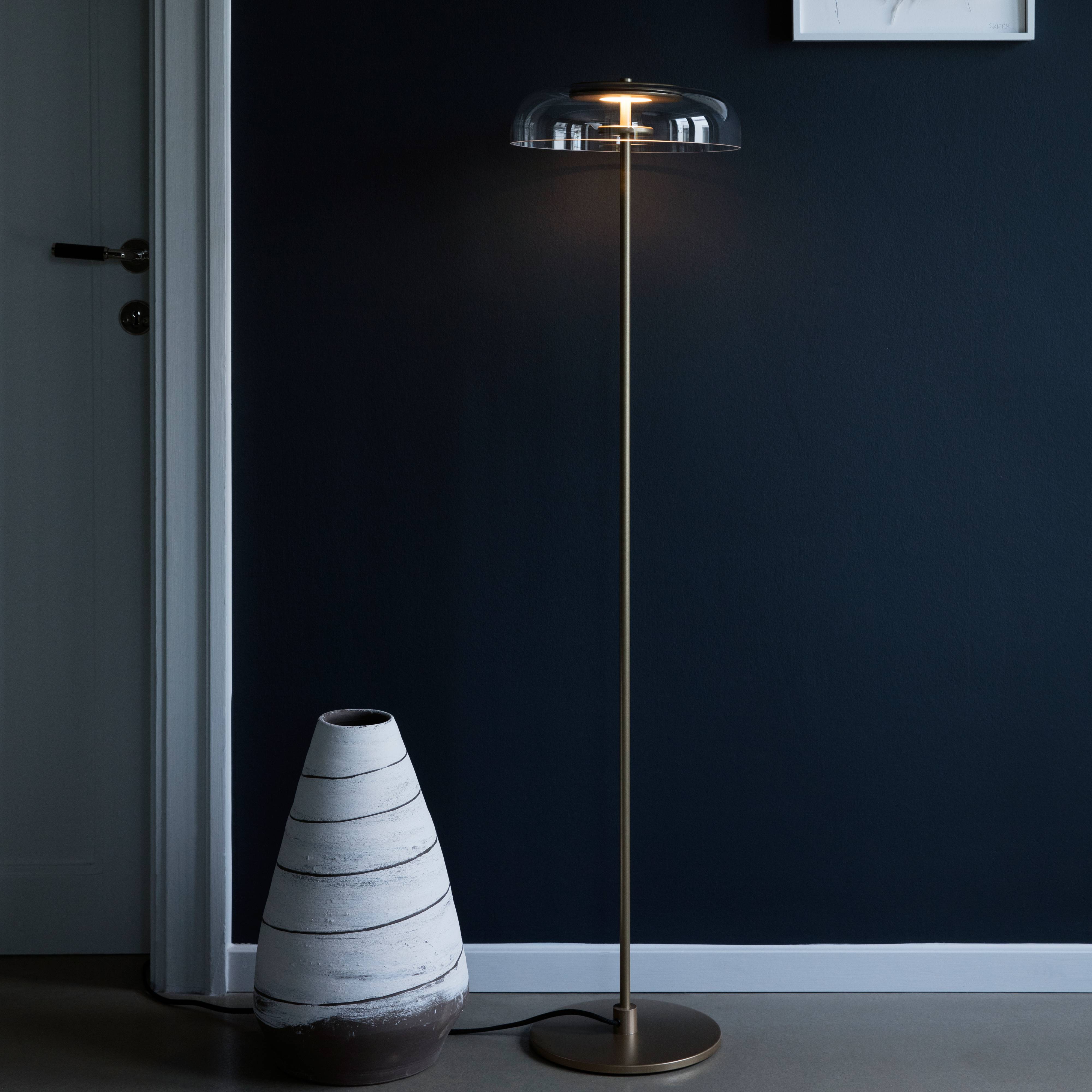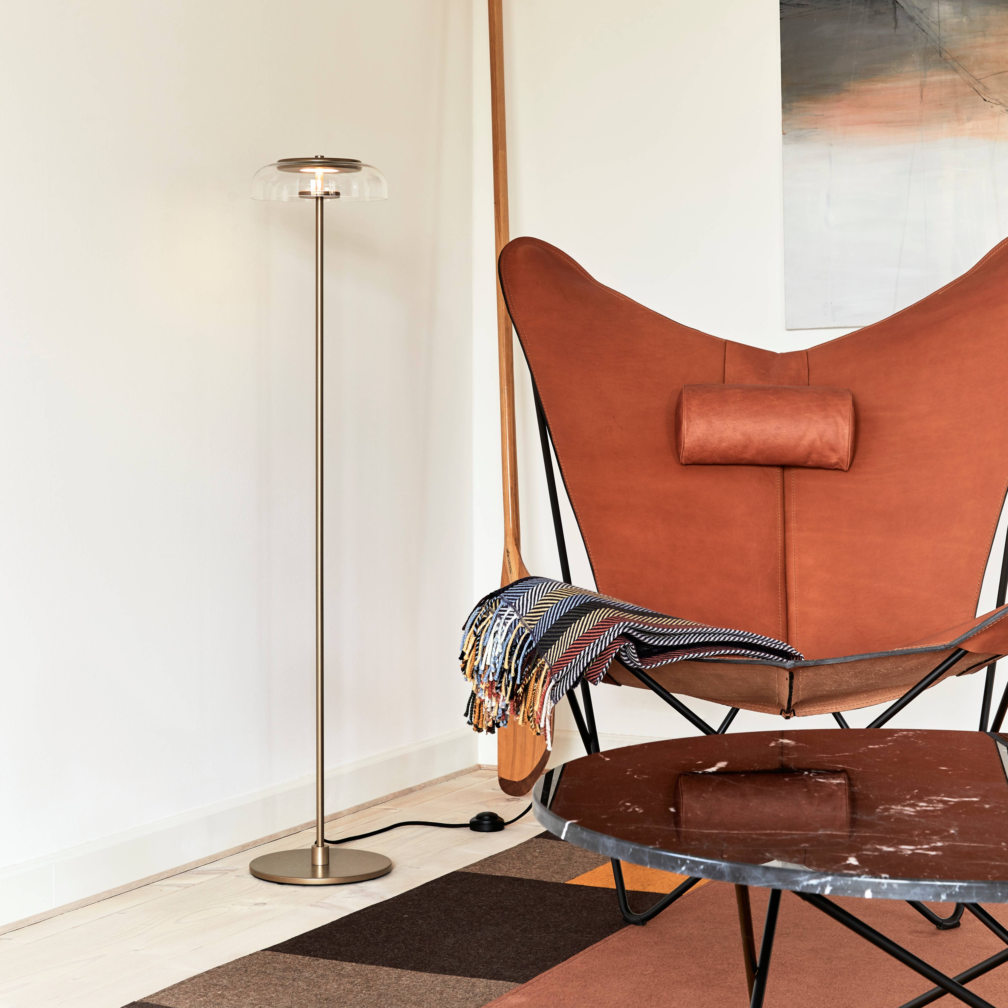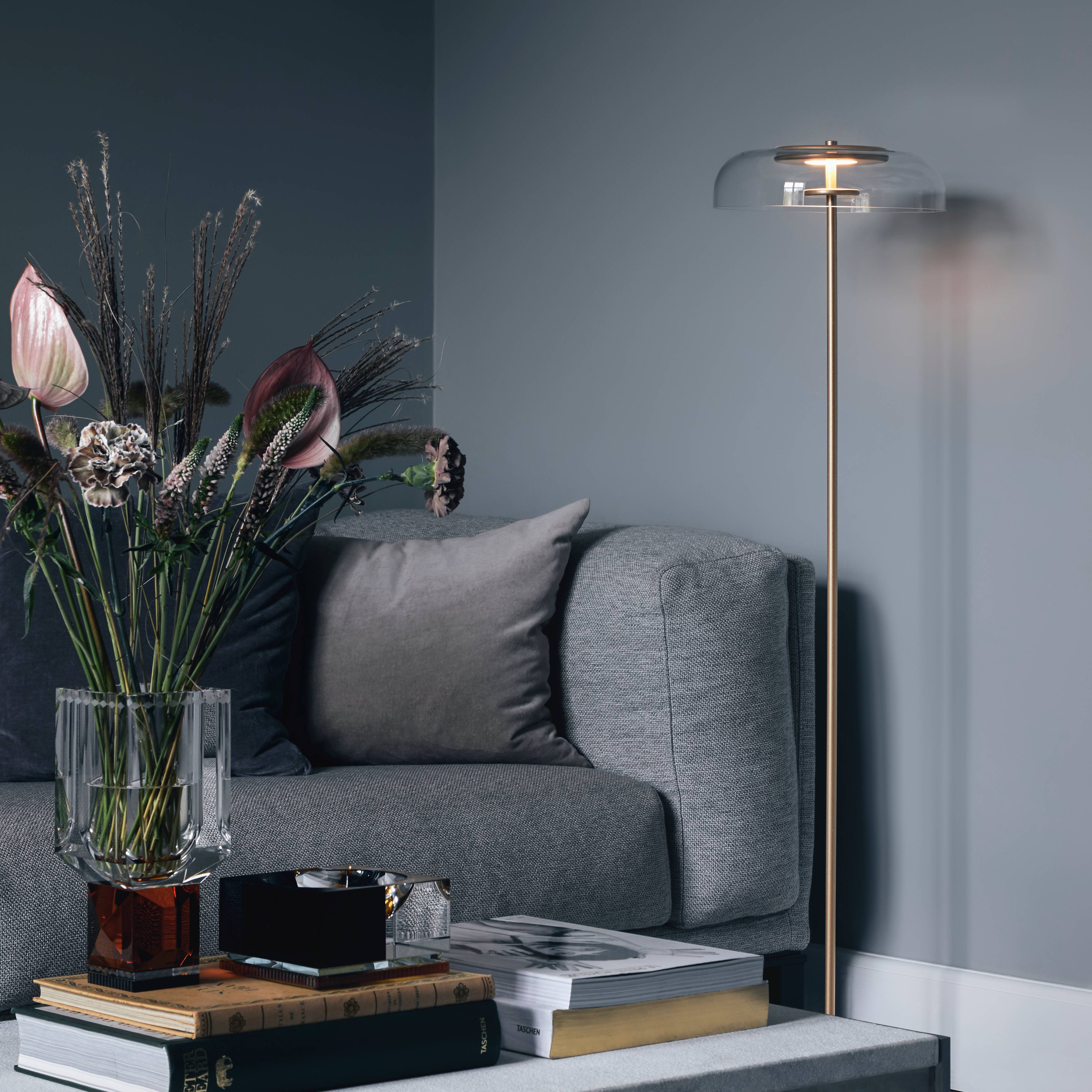Standing tall with a slender gold-tone structure and crowned with a clear shade in mouth-blown glass, the floor lamp from Nuura's Blossi collection is a particularly refined addition to any interior. Danish designer Sofie Refer sought to capture the quality of her native Nordic light and has fashioned an innovative lamp that employs all the newest technology. A specially developed LED disc is placed so it reflects in the transparent glass shade and the golden finish metal, which spreads a soft and even indirect illumination. And the light source is rated to last for up to for 50,000 hours of use. Blossi brings a warm, cosy and near-endless source of beautiful light to both living rooms and other corner spaces.